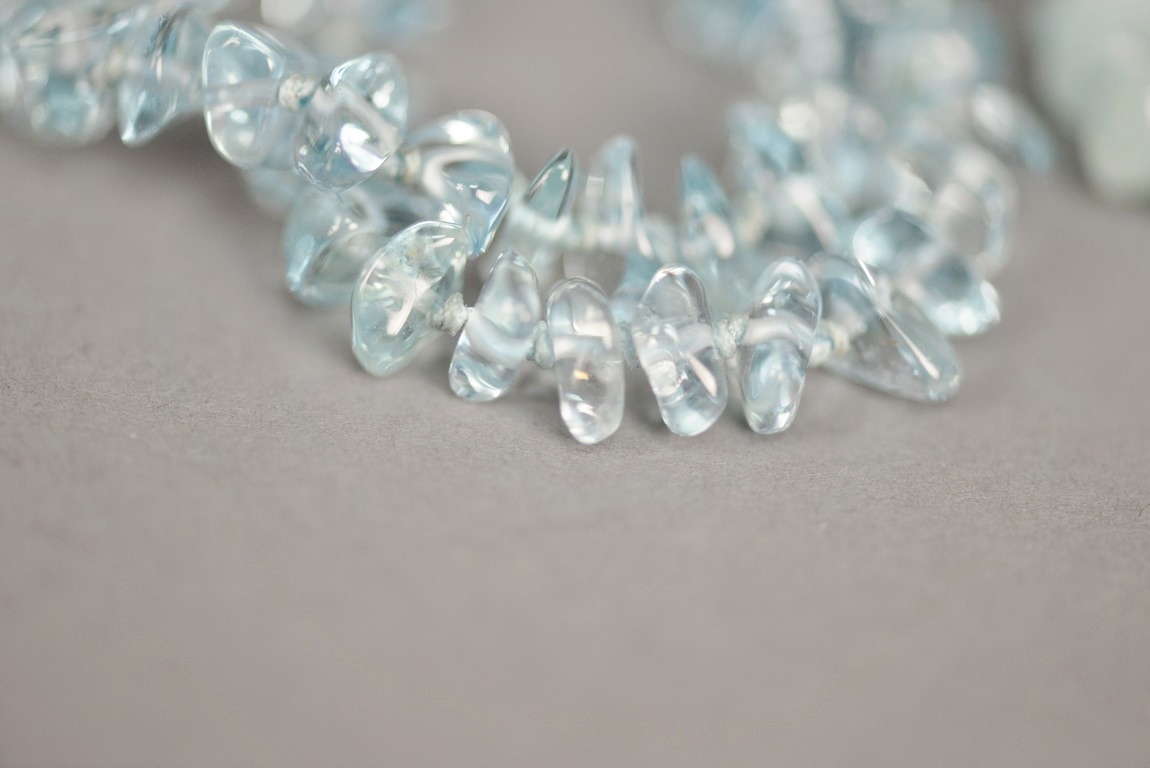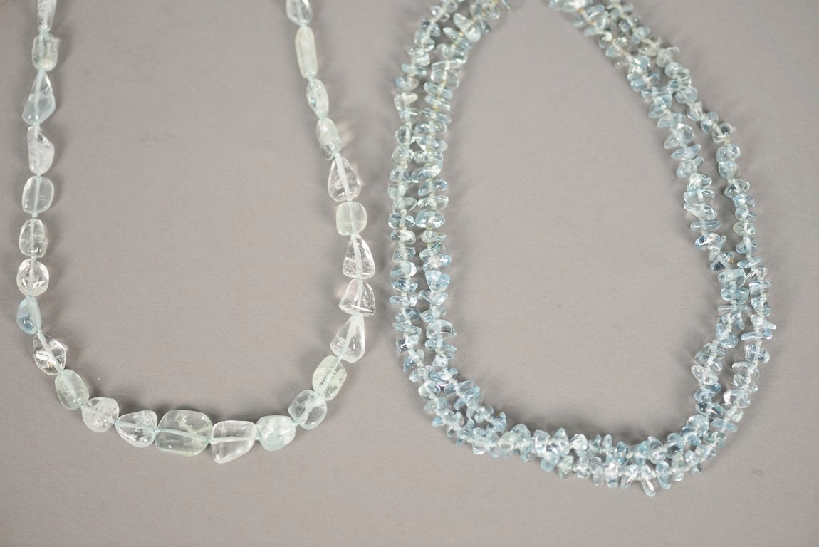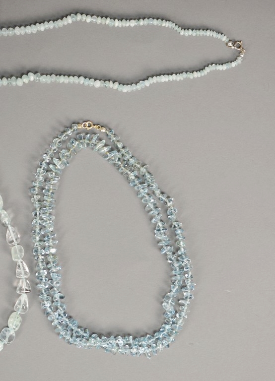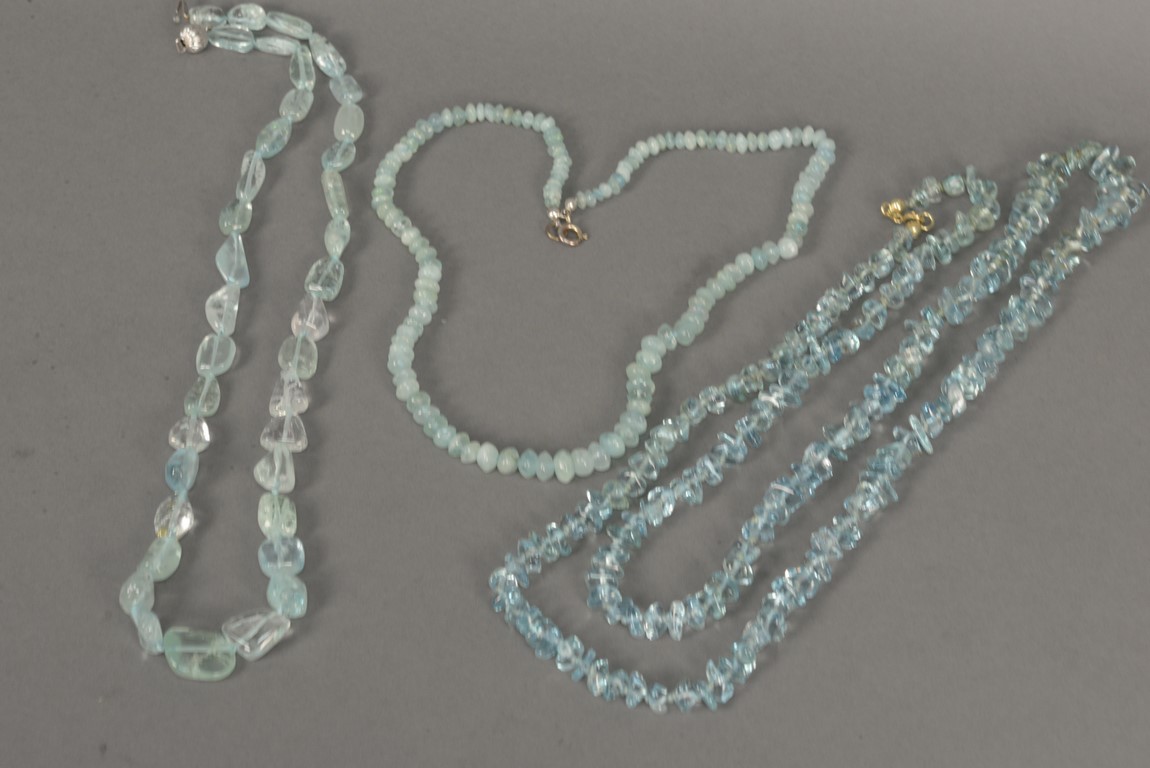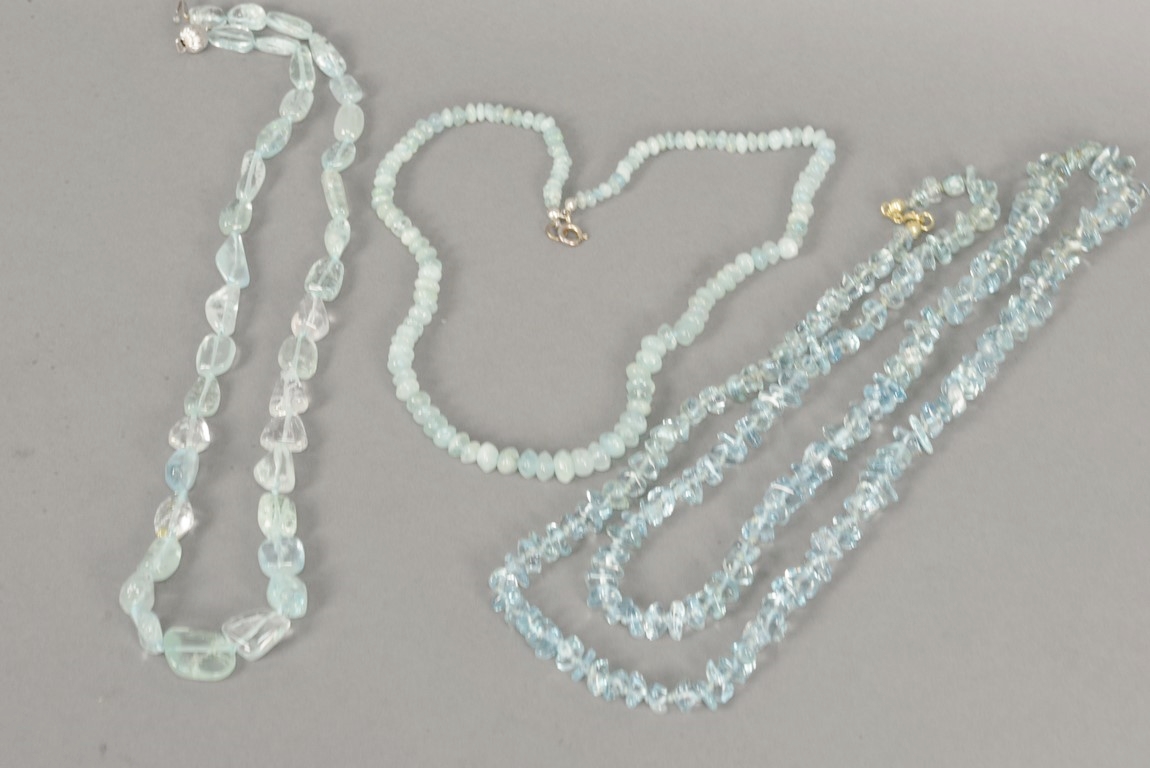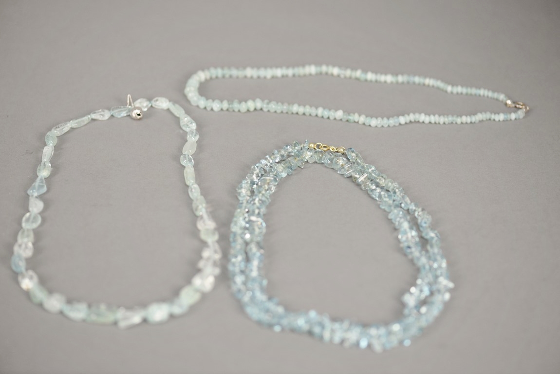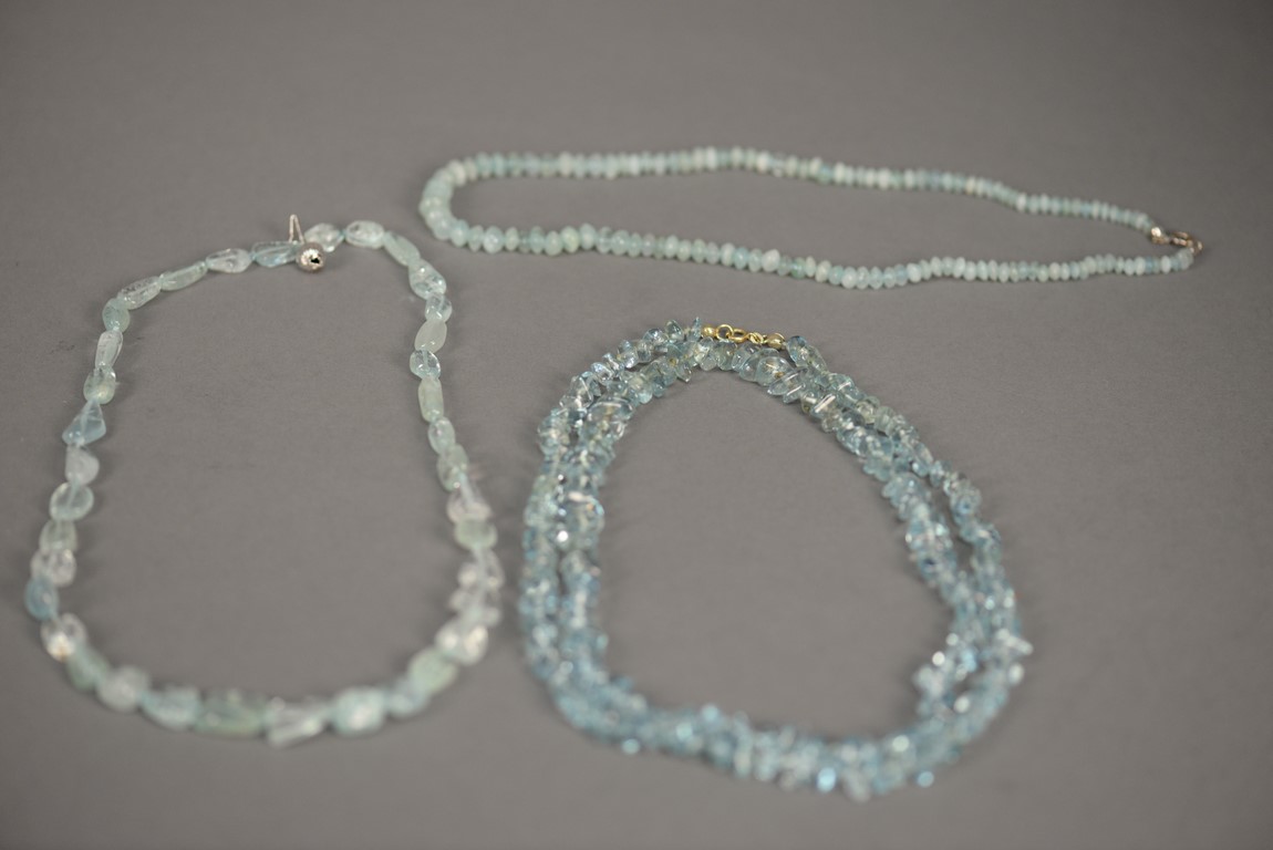 Three aquamarine bead necklaces, two with 14K gold clasps and one with sterling silver. lg. 32 in. lg. 17 1/2 in. lg. 20 in.