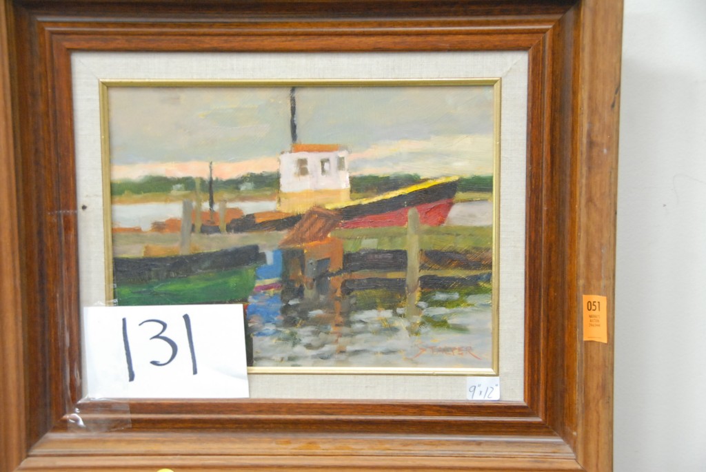 Three paintings Richard Stalter 1934 dock with ships, Jockeys unsigned 7 x 13, and road in the fall signed lower right Fox 12 x 16