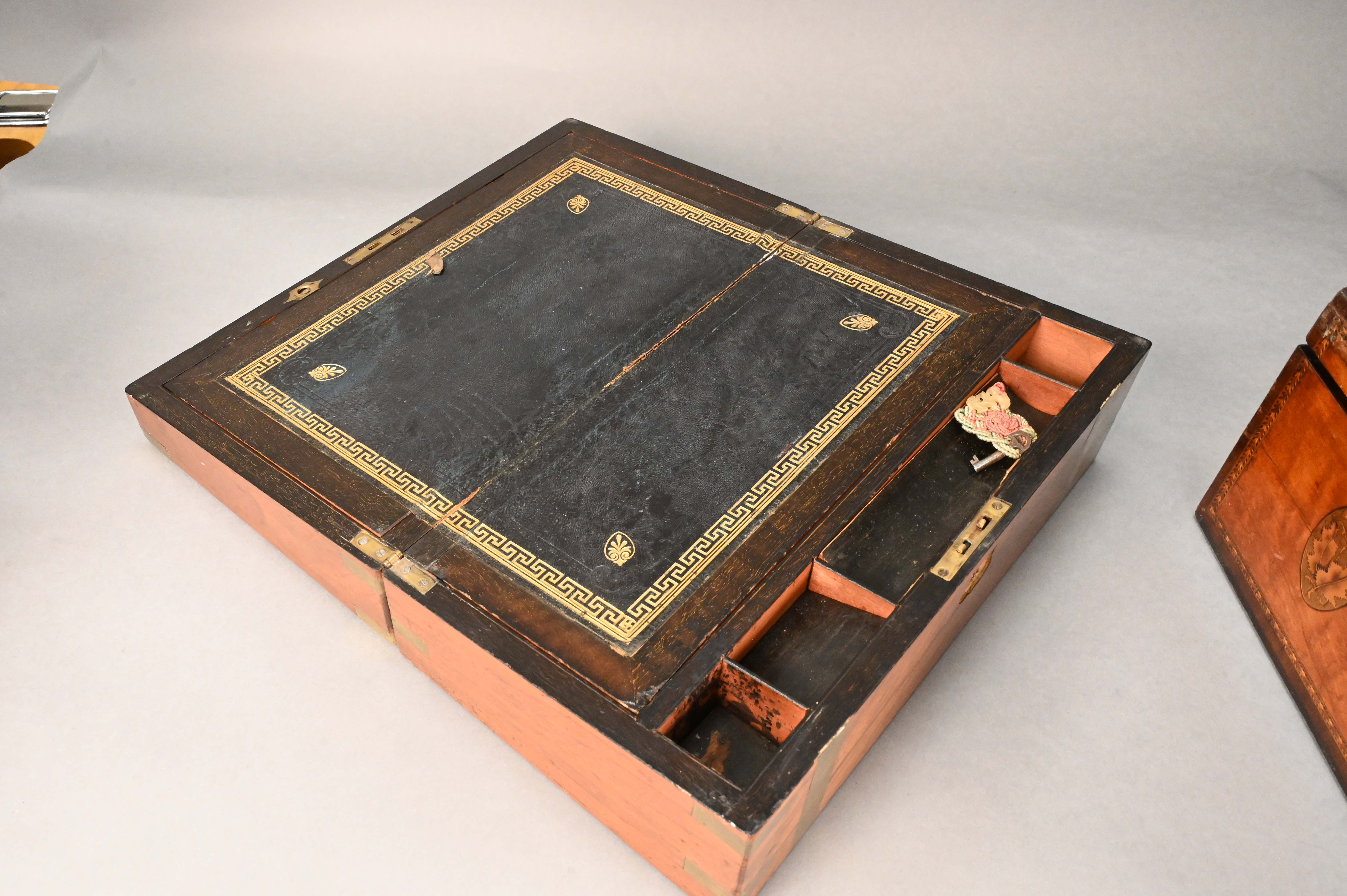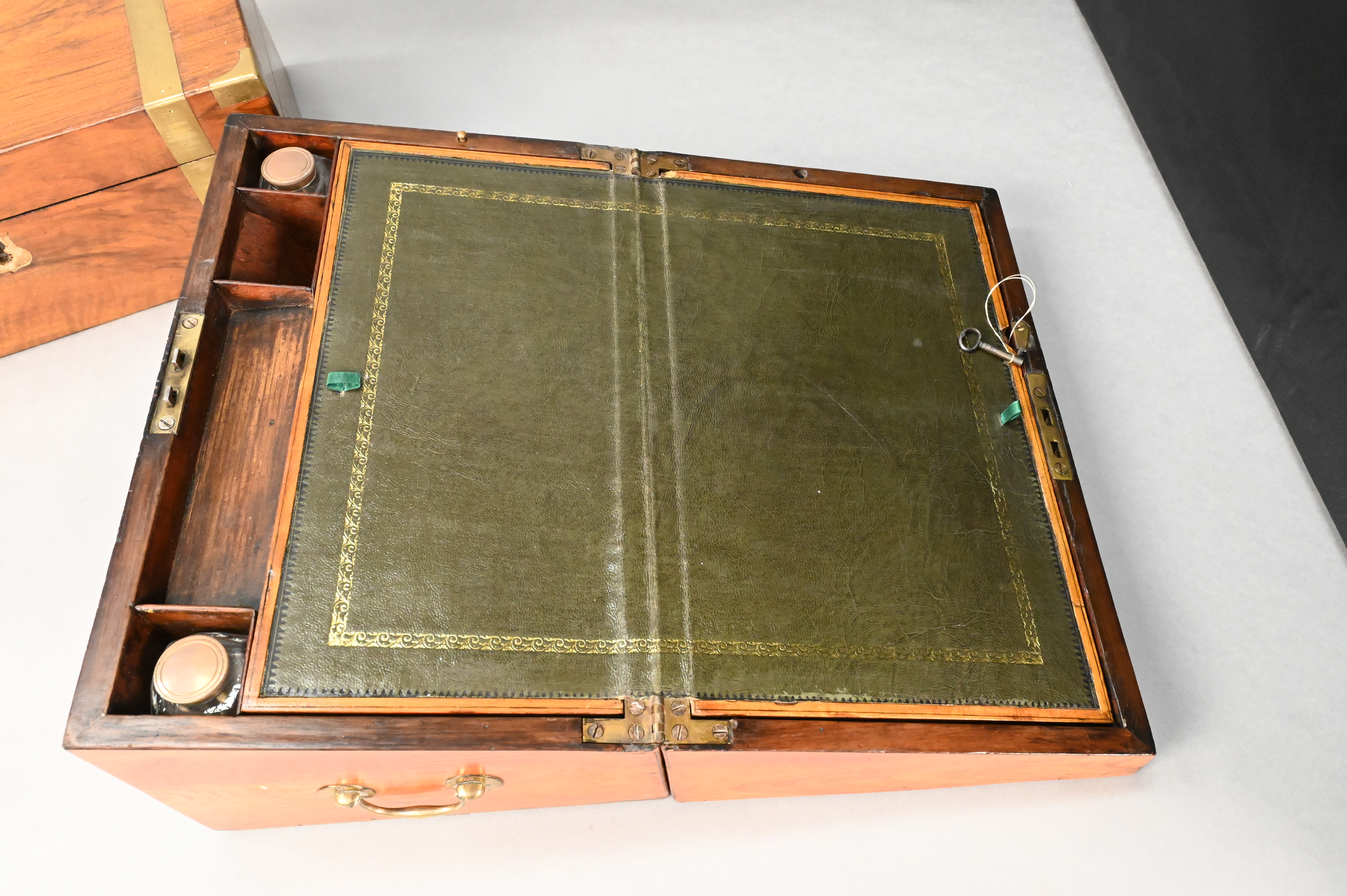 one having brass inlay, black and gilt leather sloped writing surface along with key