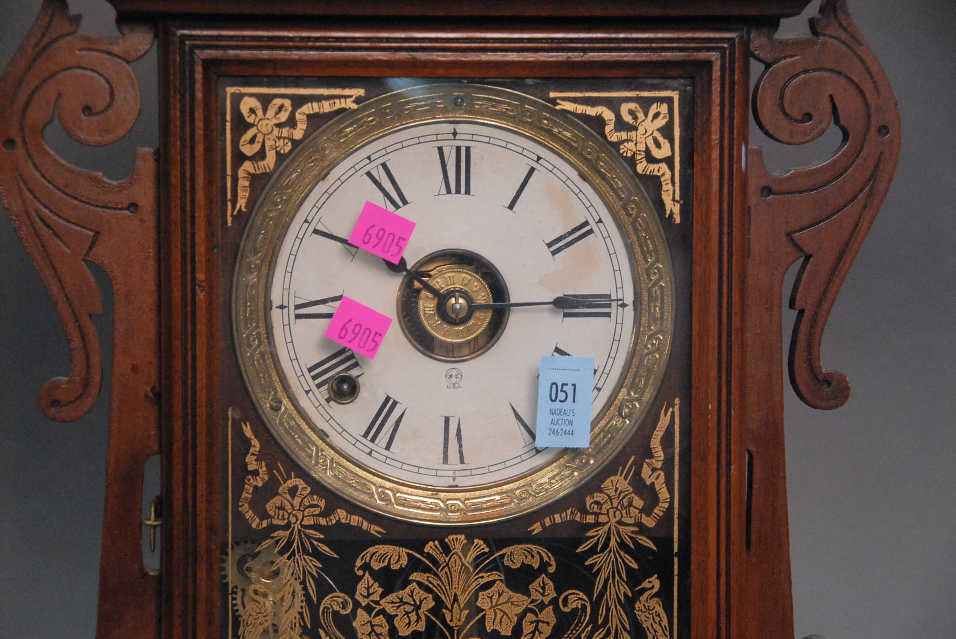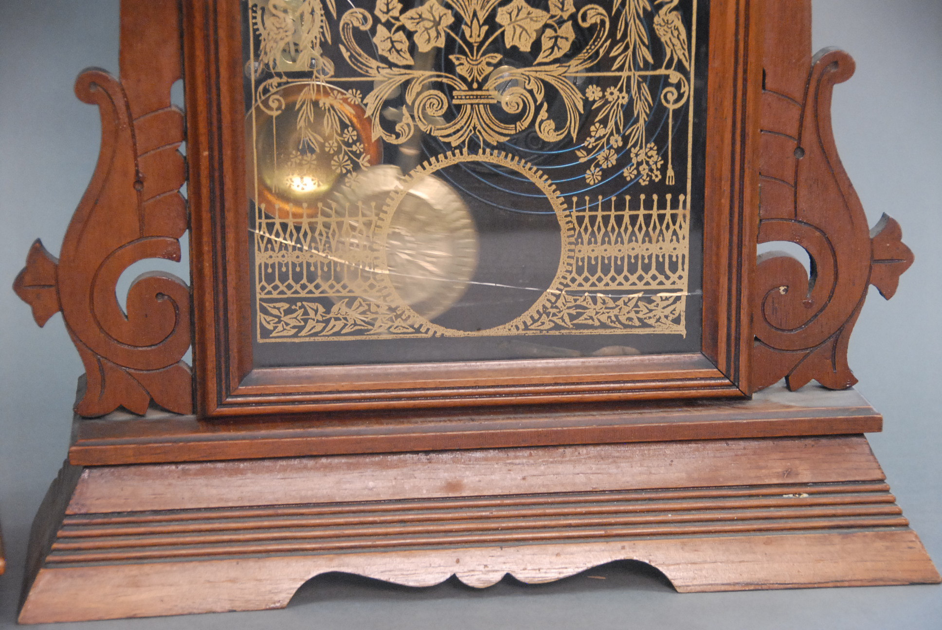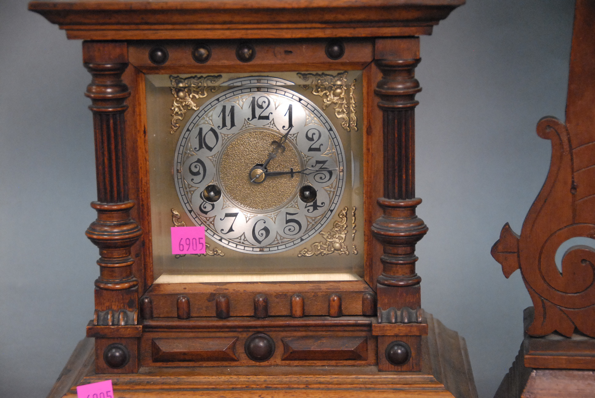Lot 51: Two shelf clock including German walnut shelf clock and walnut Victorian shelf clock, one glass cracked.