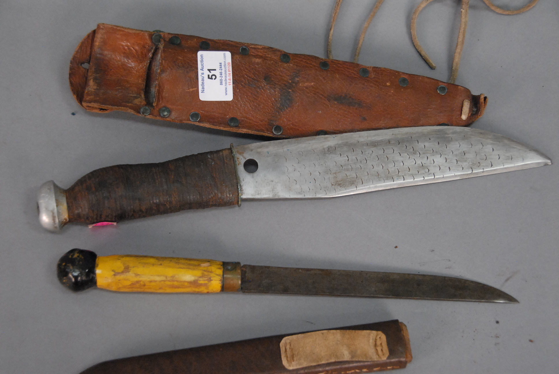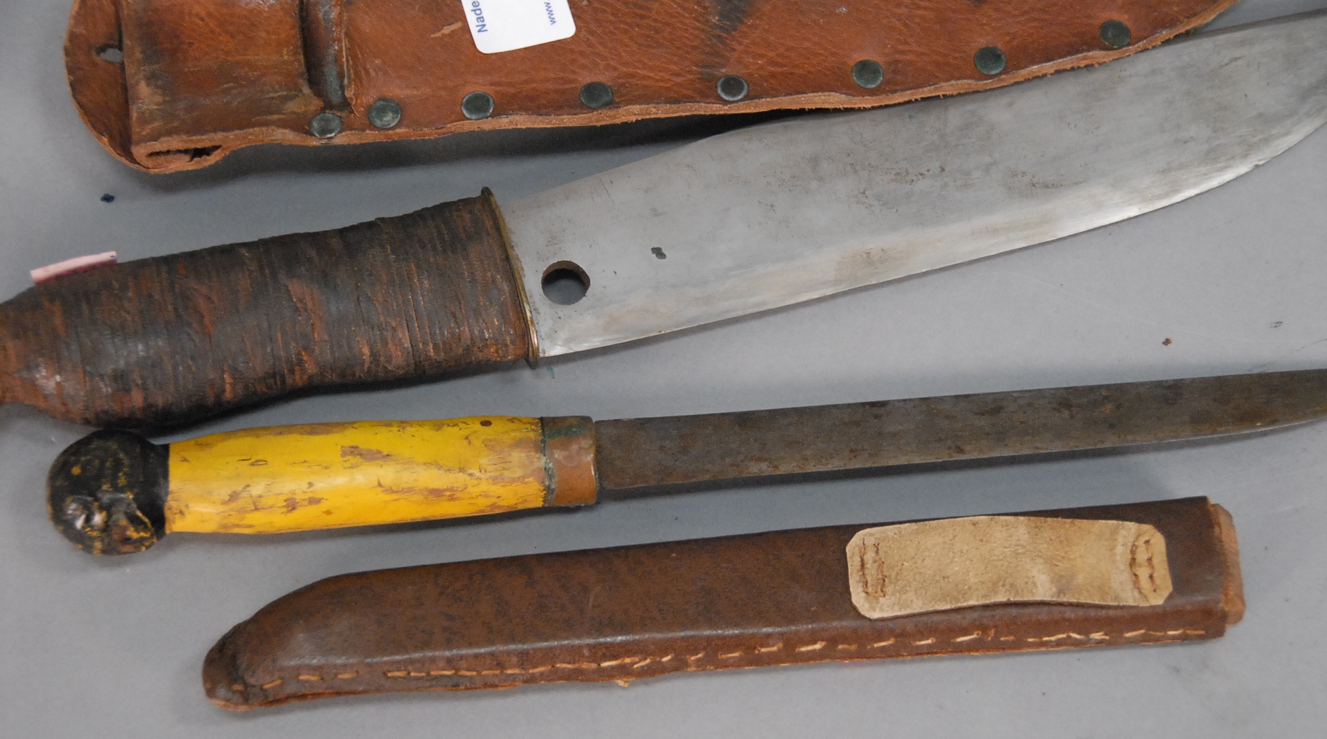 Lot 51: Two vintage knives with leather sheaths including large knife with fish scale effect and wrapped handle, lengths 16 in. and 14 1/2 in.