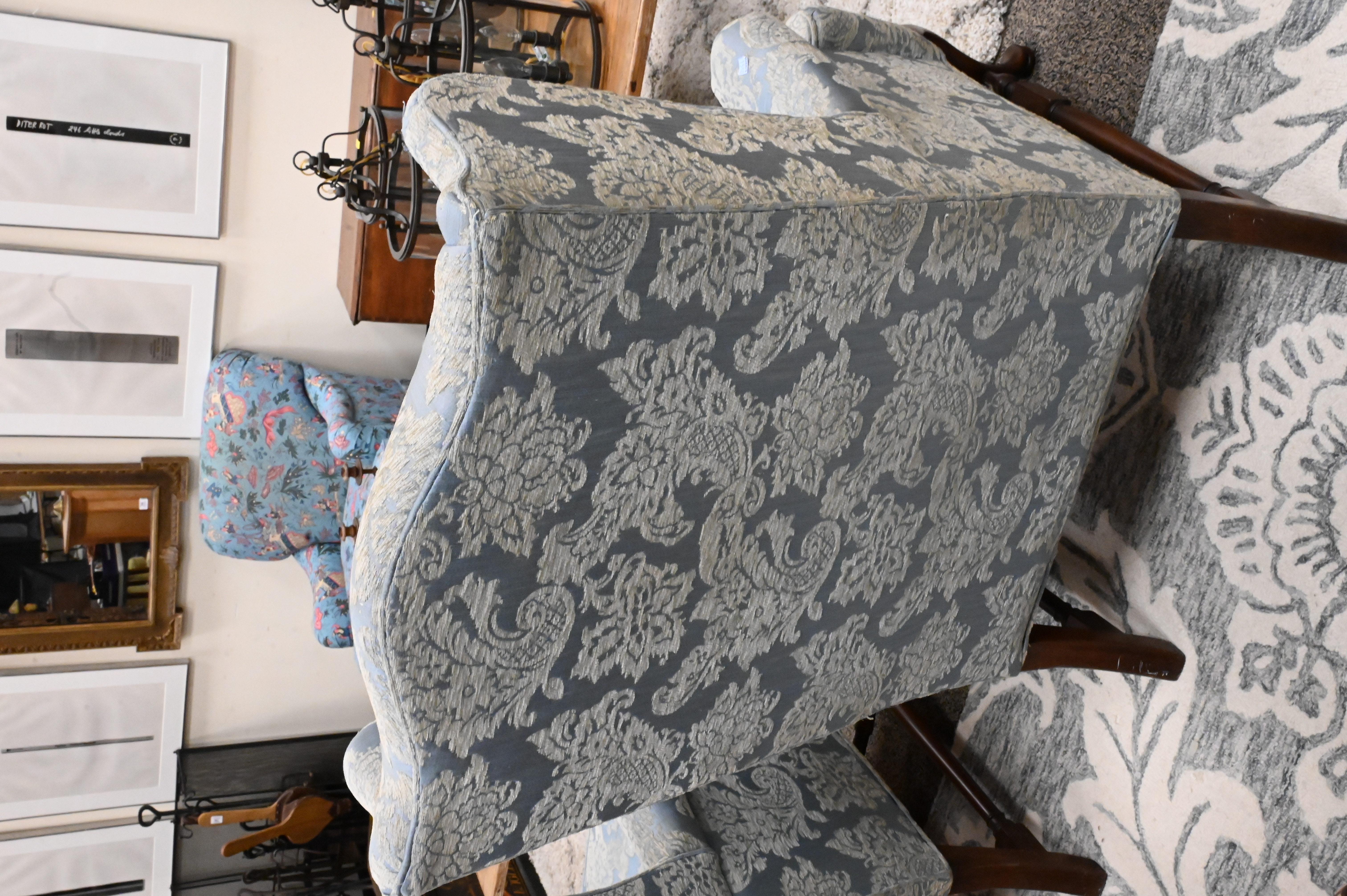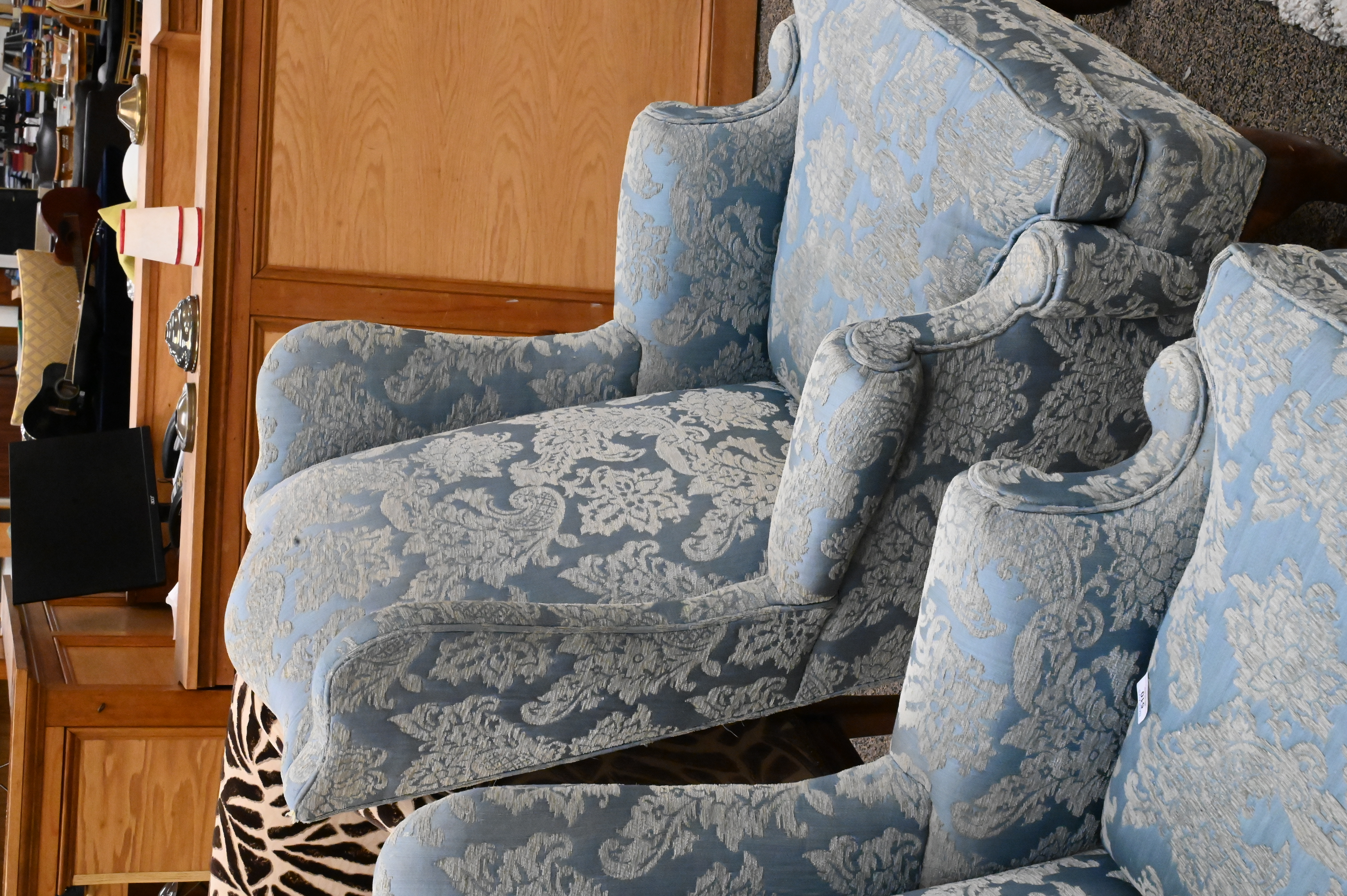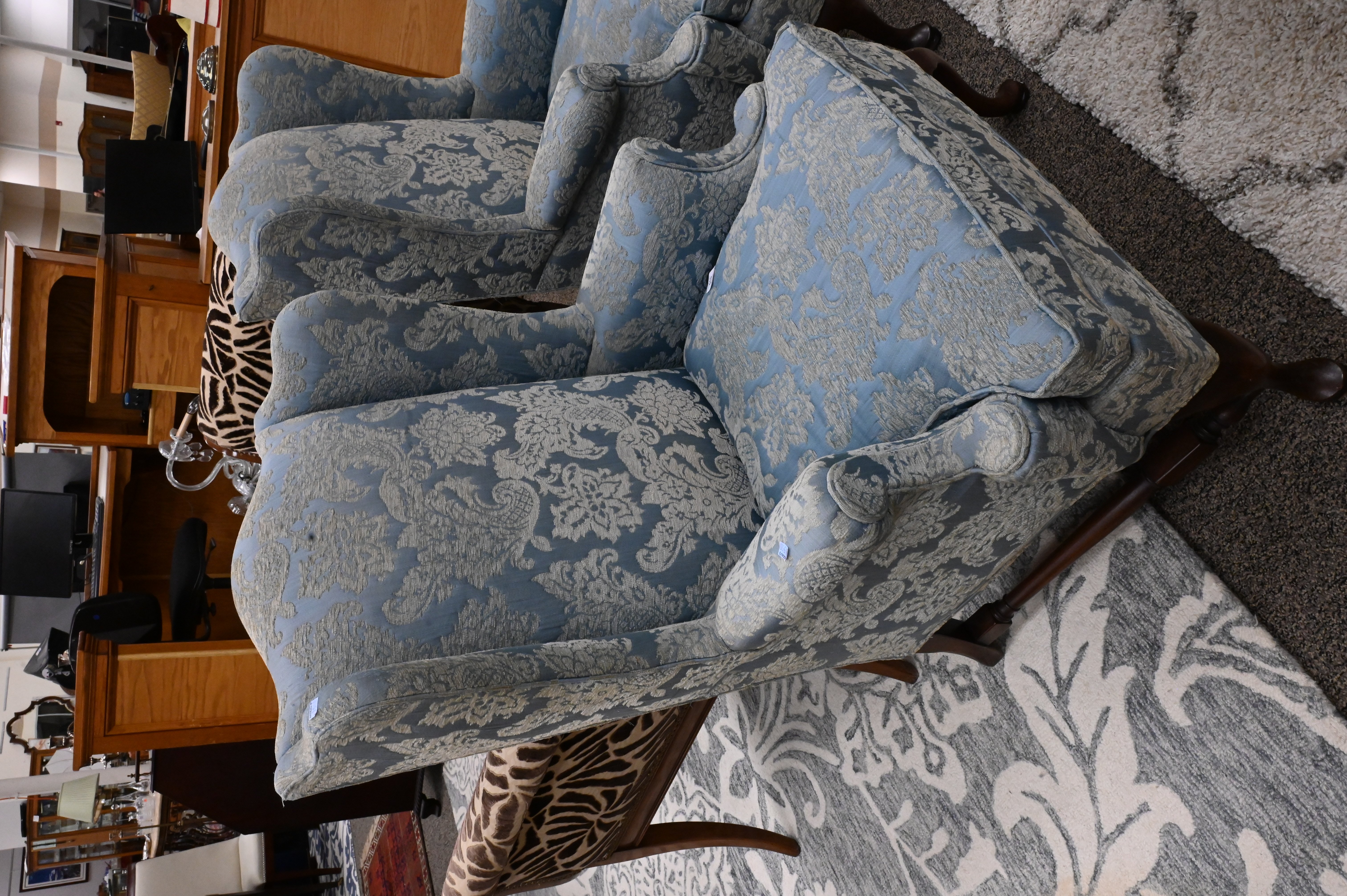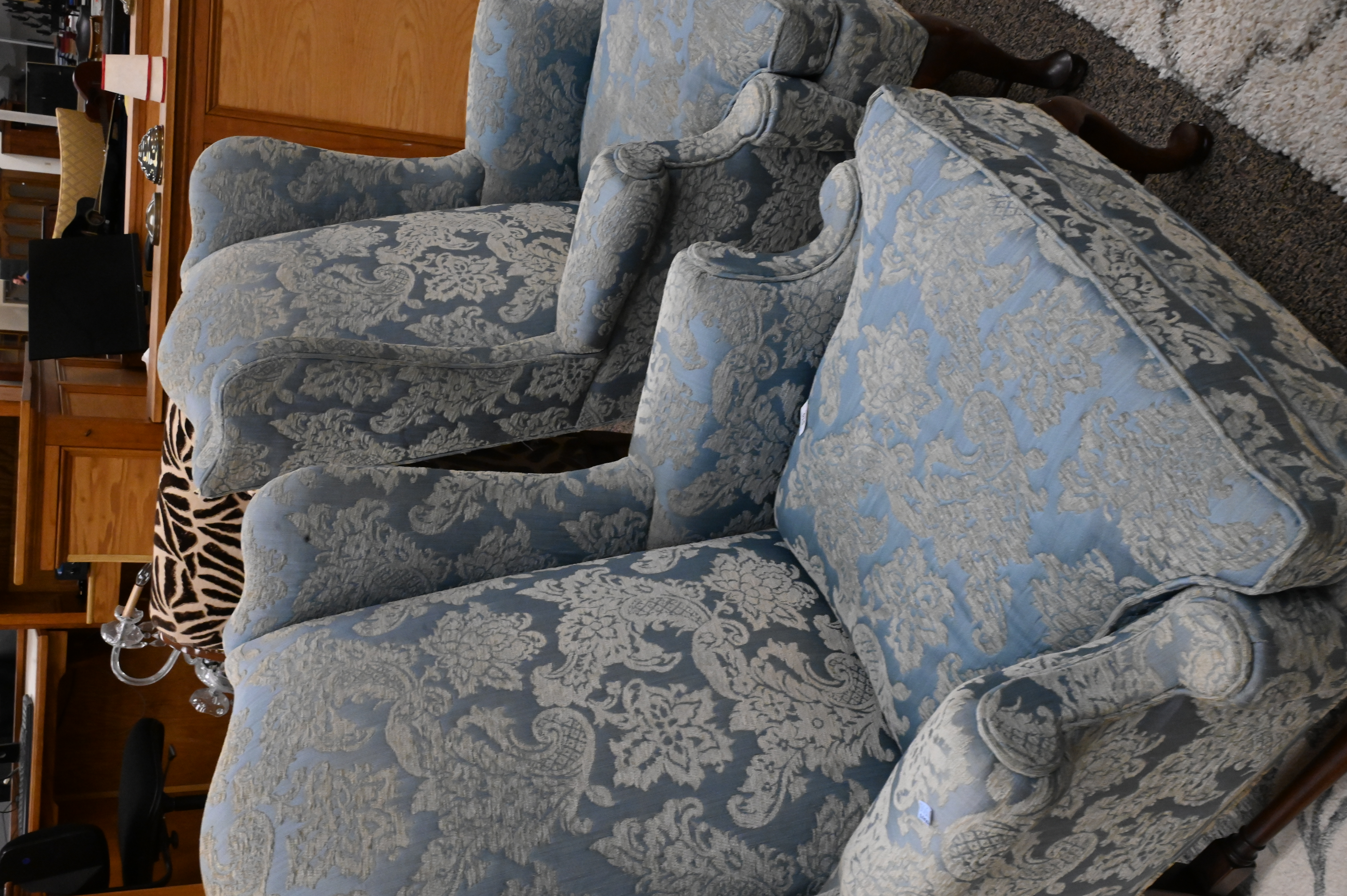 A Pair of Queen Anne Style Wing Chairs, height 44 inches, width 31 inches.