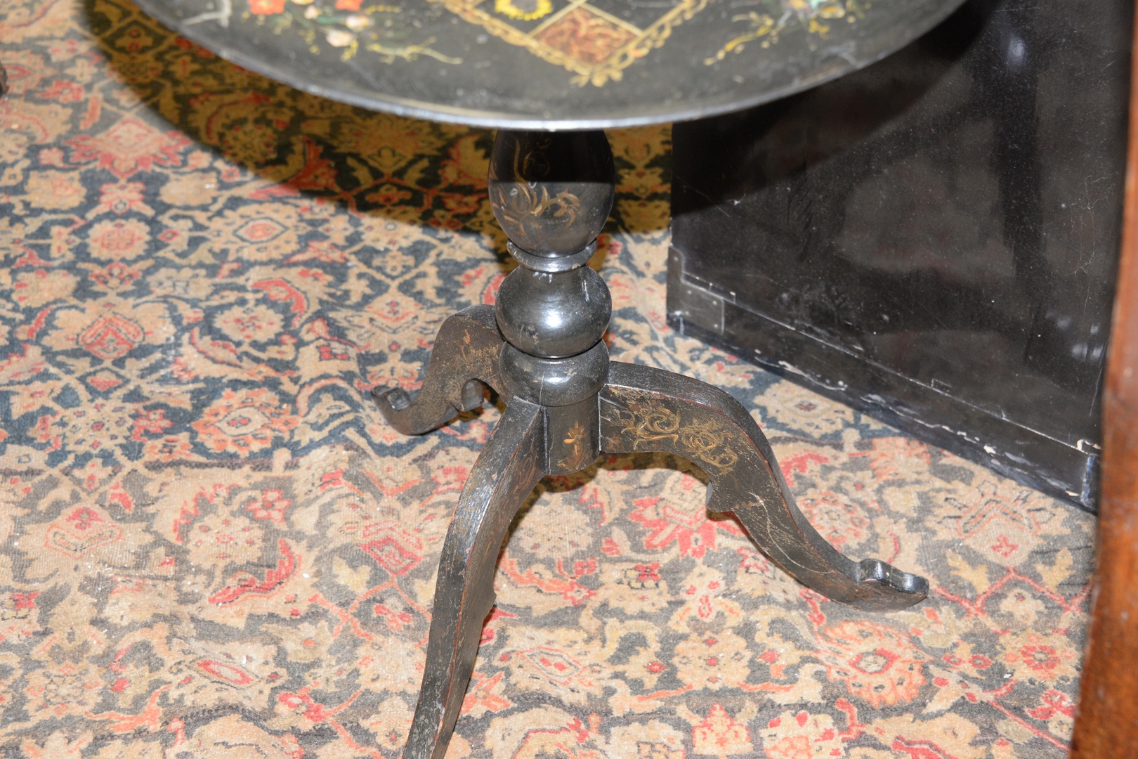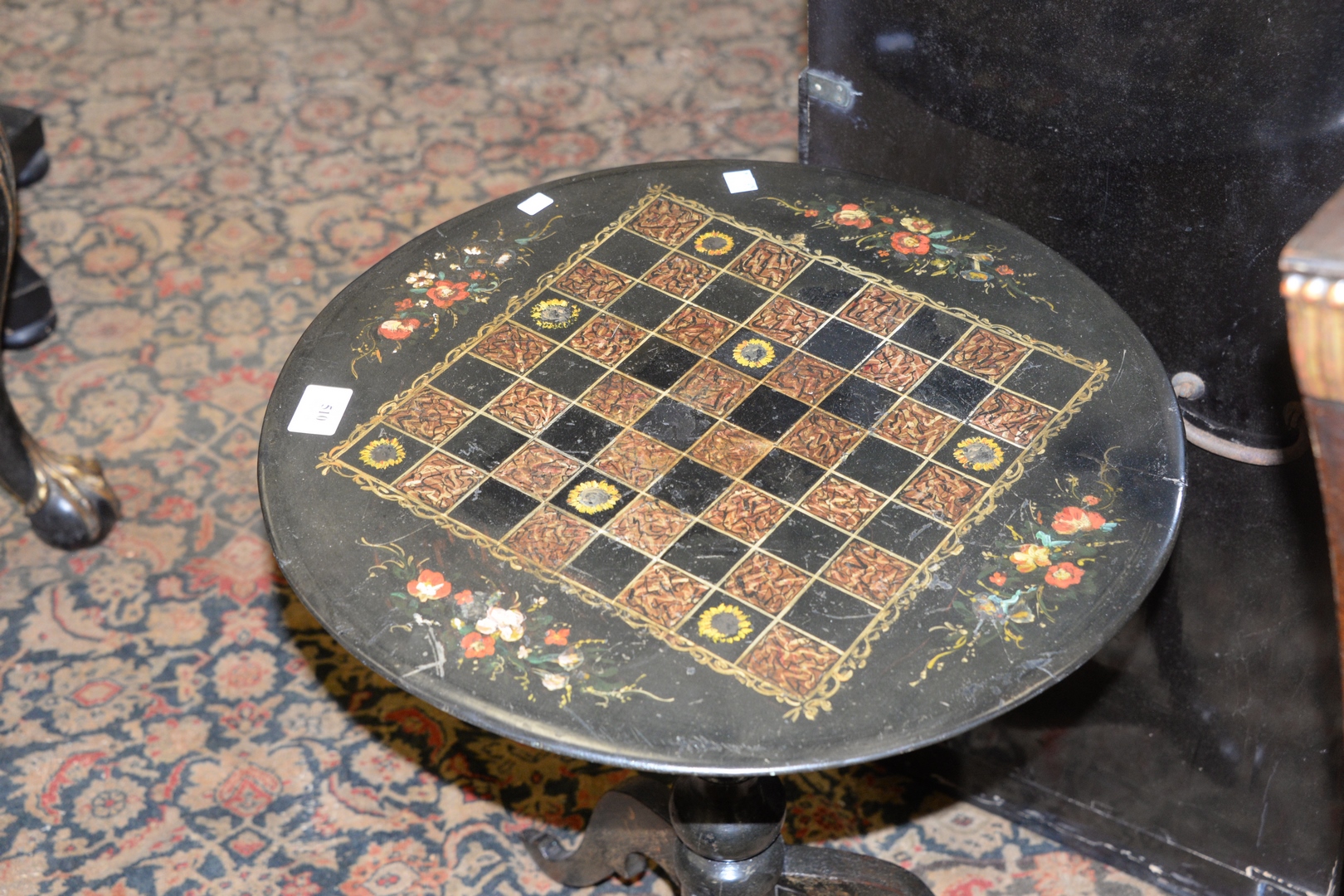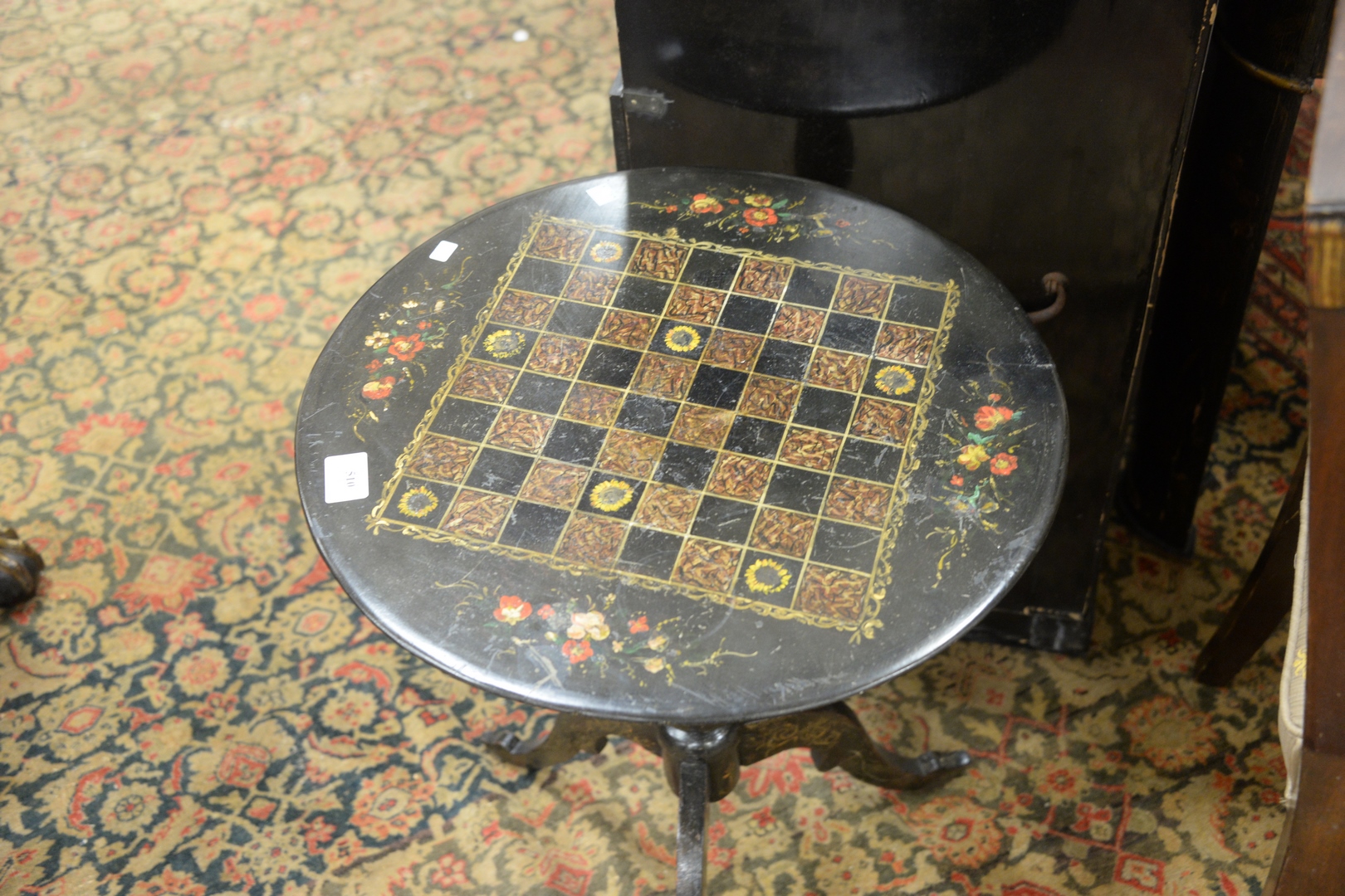 Lot 510: Black Lacquered Stand, having round, porcelain top, with painted game board, height 23 1/4 inches, diameter 19 1/4 inches.