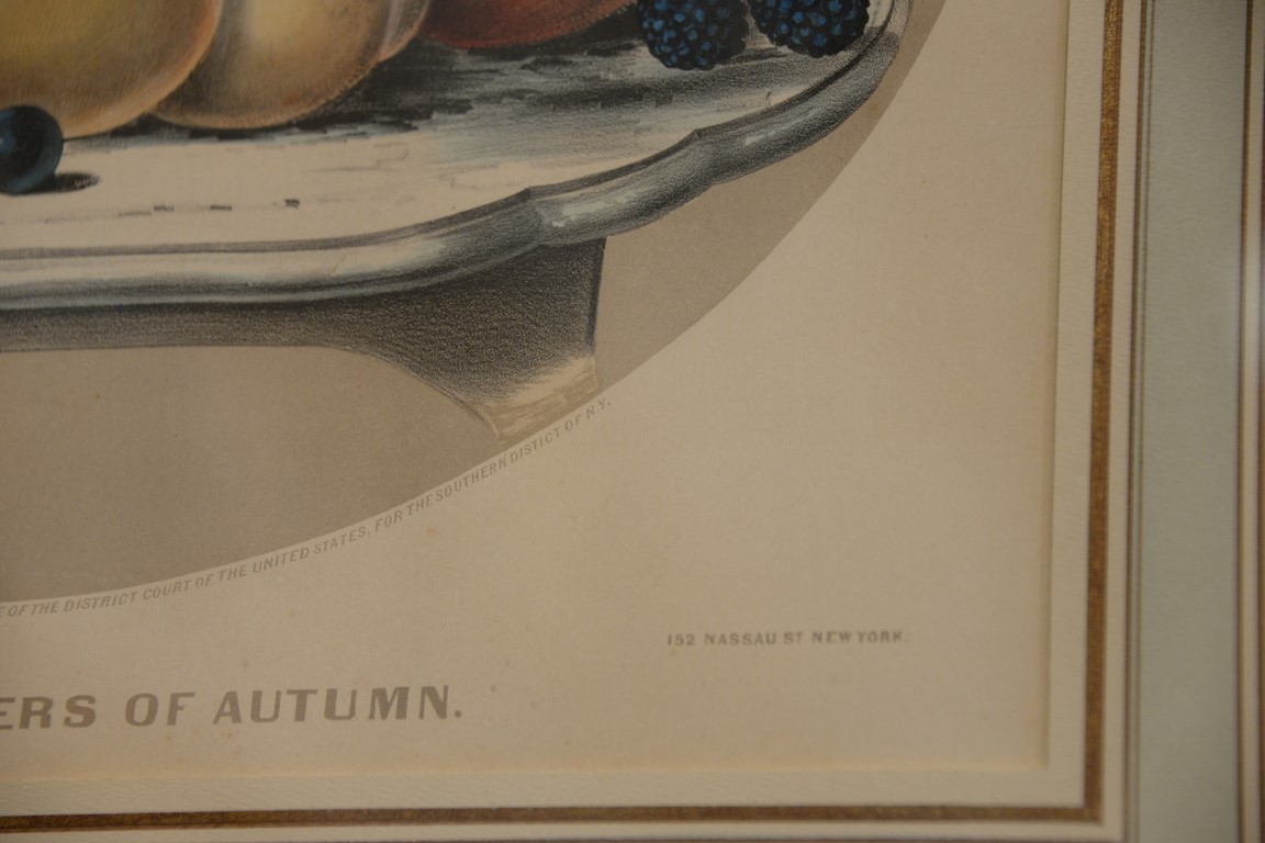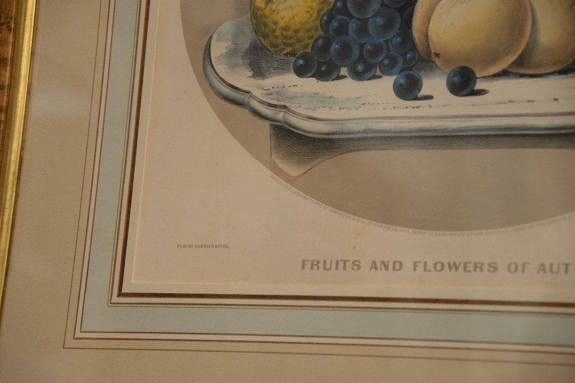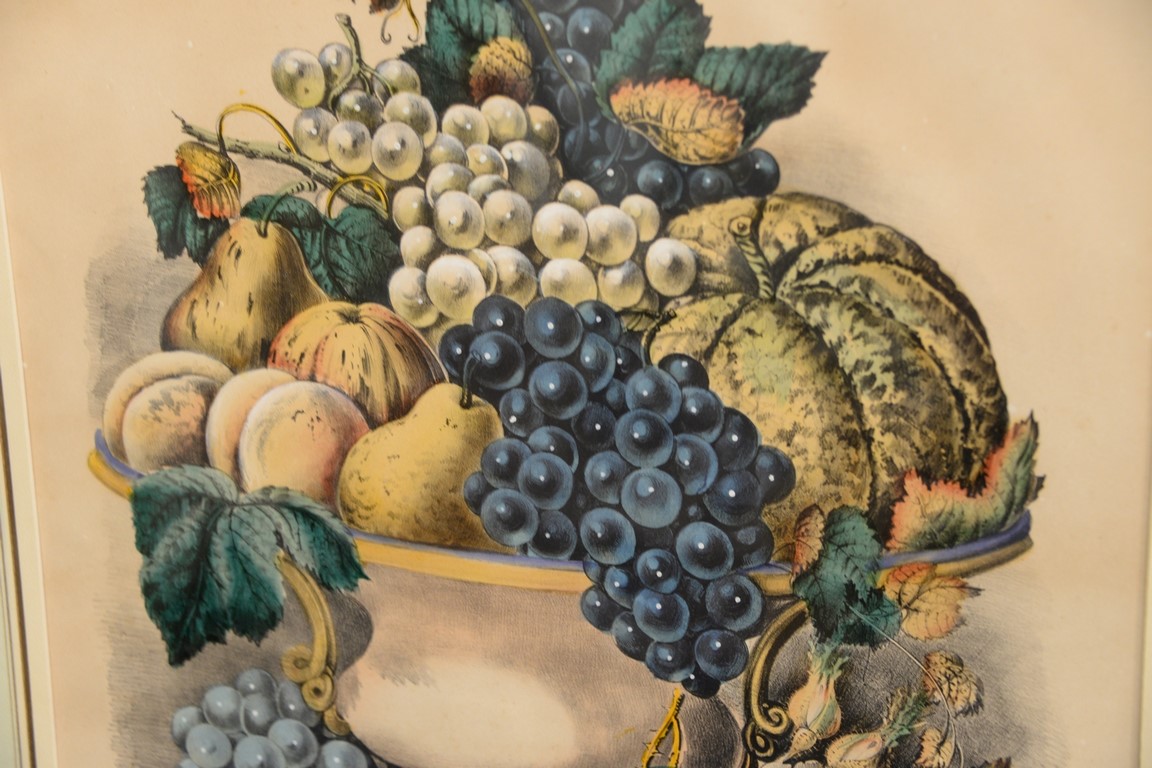 Lot 510: Currier & Ives, two medium folio colored lithographs, Fruits and Flowers of Autumn, sight size 14 3/4 x 15 3/4 Vase of Fruit, sig…