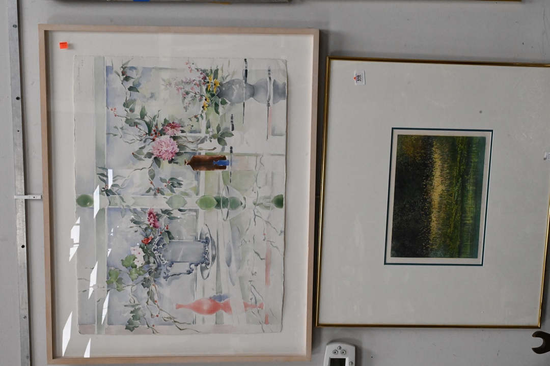 Four Piece Lot, to include watercolor on paper; still life with flowers, signed indistinctly and dated 2003 upper right; Ernest Garthwaite (American, b. 1940), “Mohegan Golden Eagle”, lithograph in colors on paper, signed, titled, and dated in pencil in the lower margin; Ivel Weinmiller (Argentinean, b. 1954), “Forest Hills”, lithograph in colors on paper, signed, titled, and numbered “10/50” in pencil in the lower margin; along with Rolf Rafflewski (German, b. 1943), Parisian Scene, lithograph in colors on paper, signed and numbered “50/150″ in pencil in the lower margin, largest 22 1/2″ x 30”.