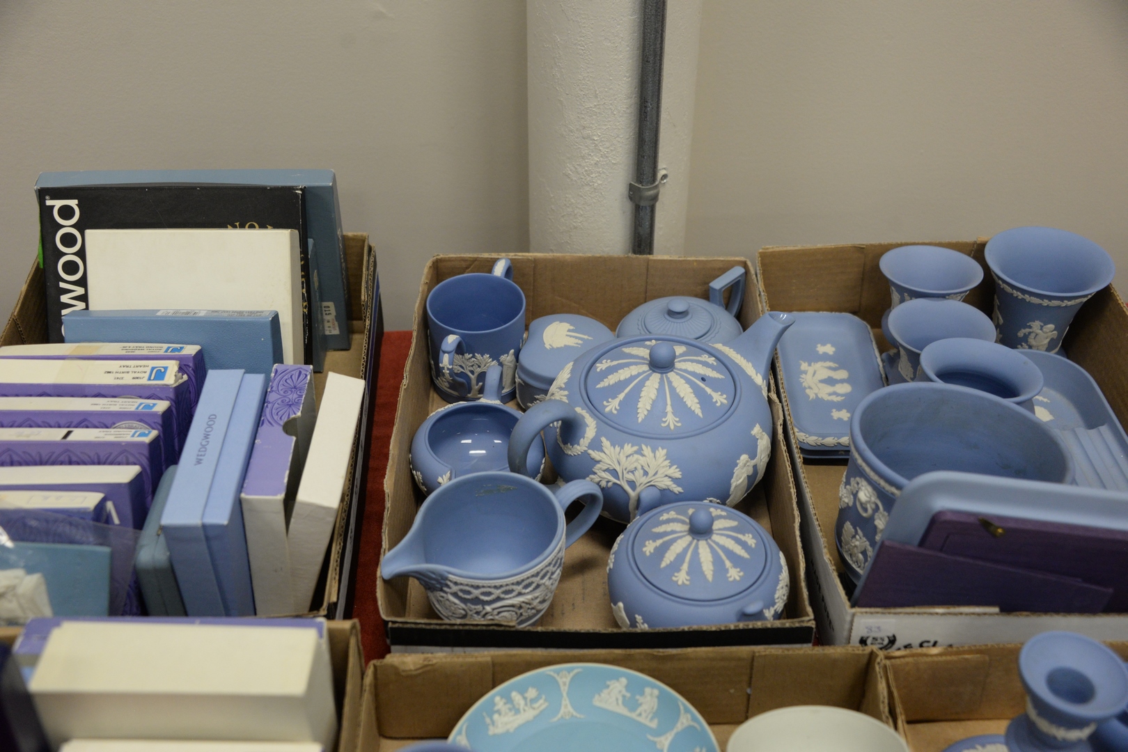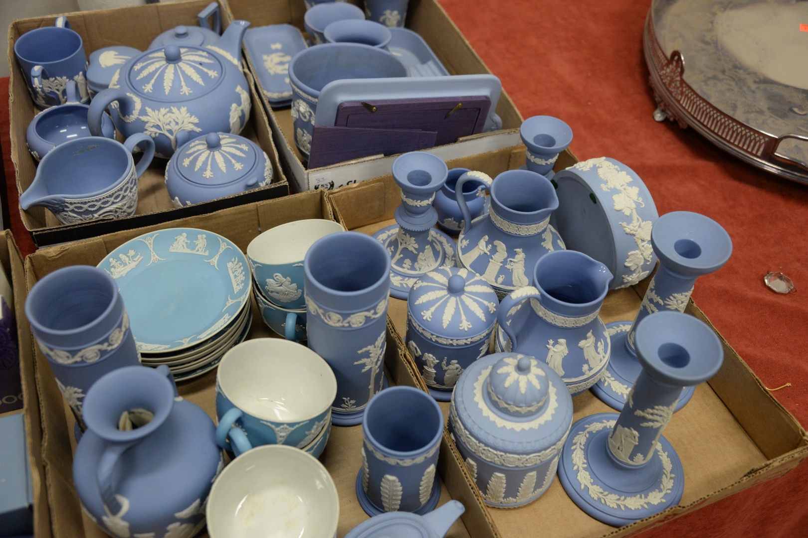 Lot 510: Four Tray Lots of Wedgwood Jasperware, to include vases, candlesticks, urns, teapot, cup, saucers, etc., vases 6 1/2 inches. Provenance: Estate of James Wadhams