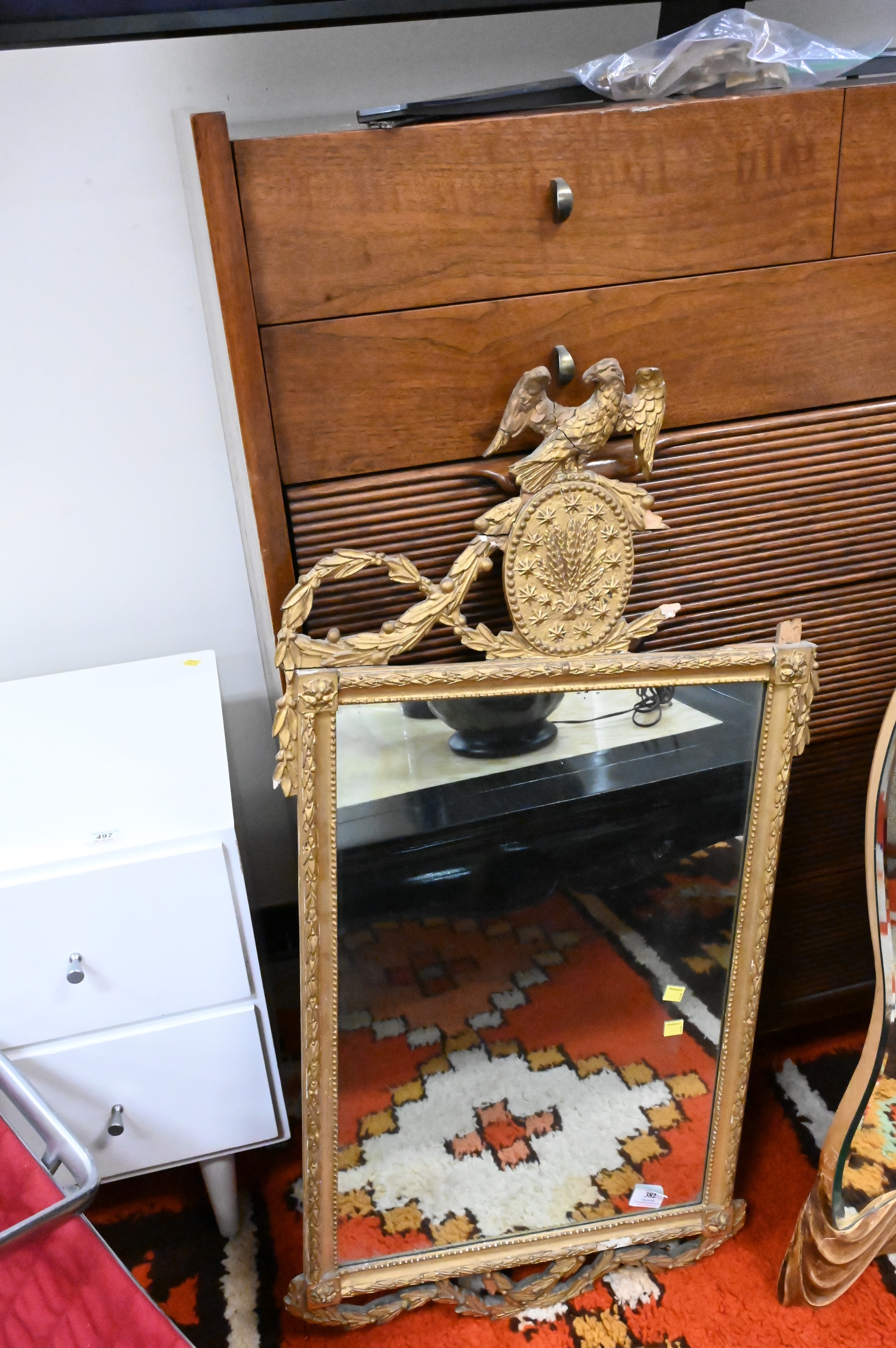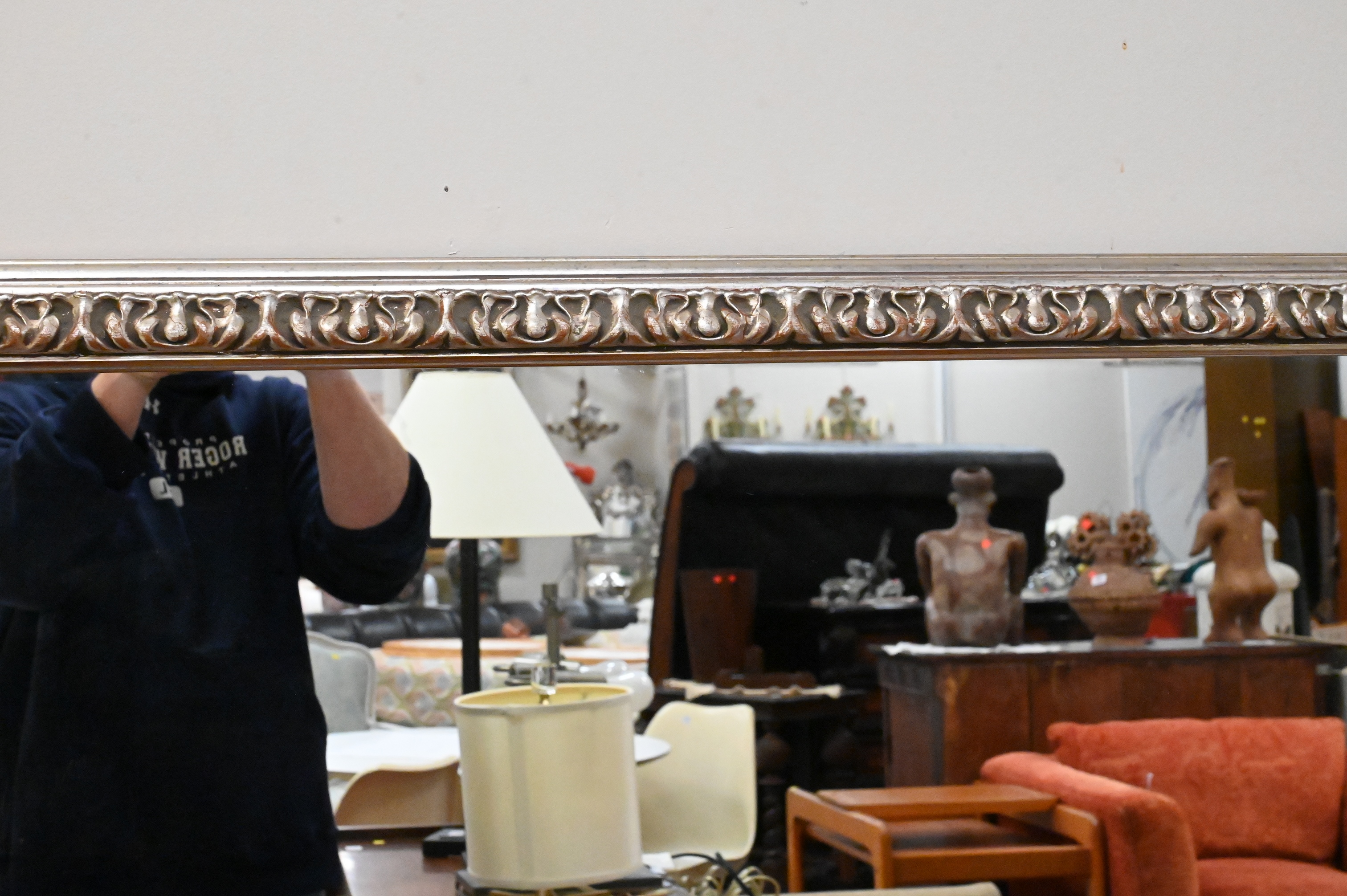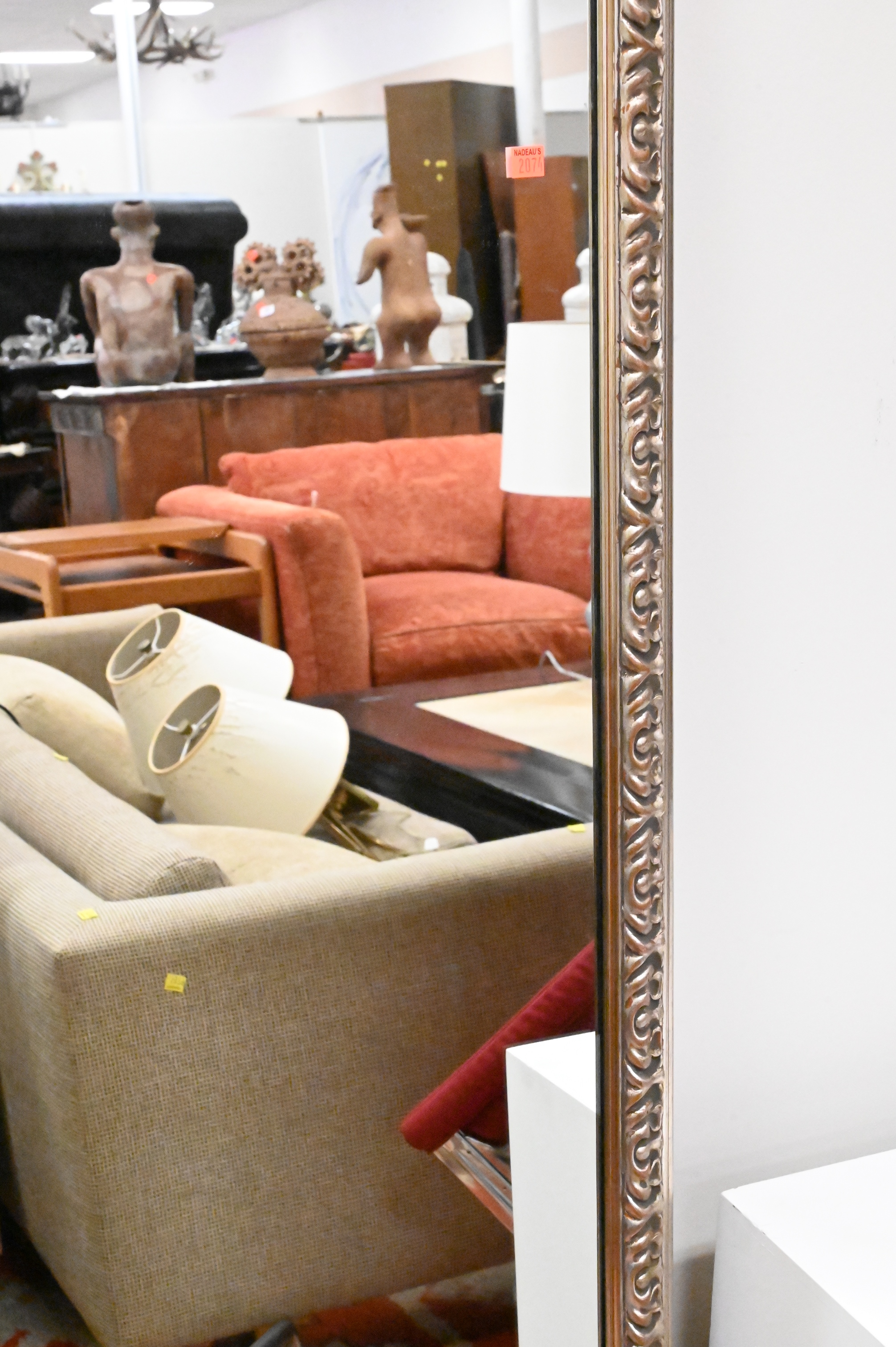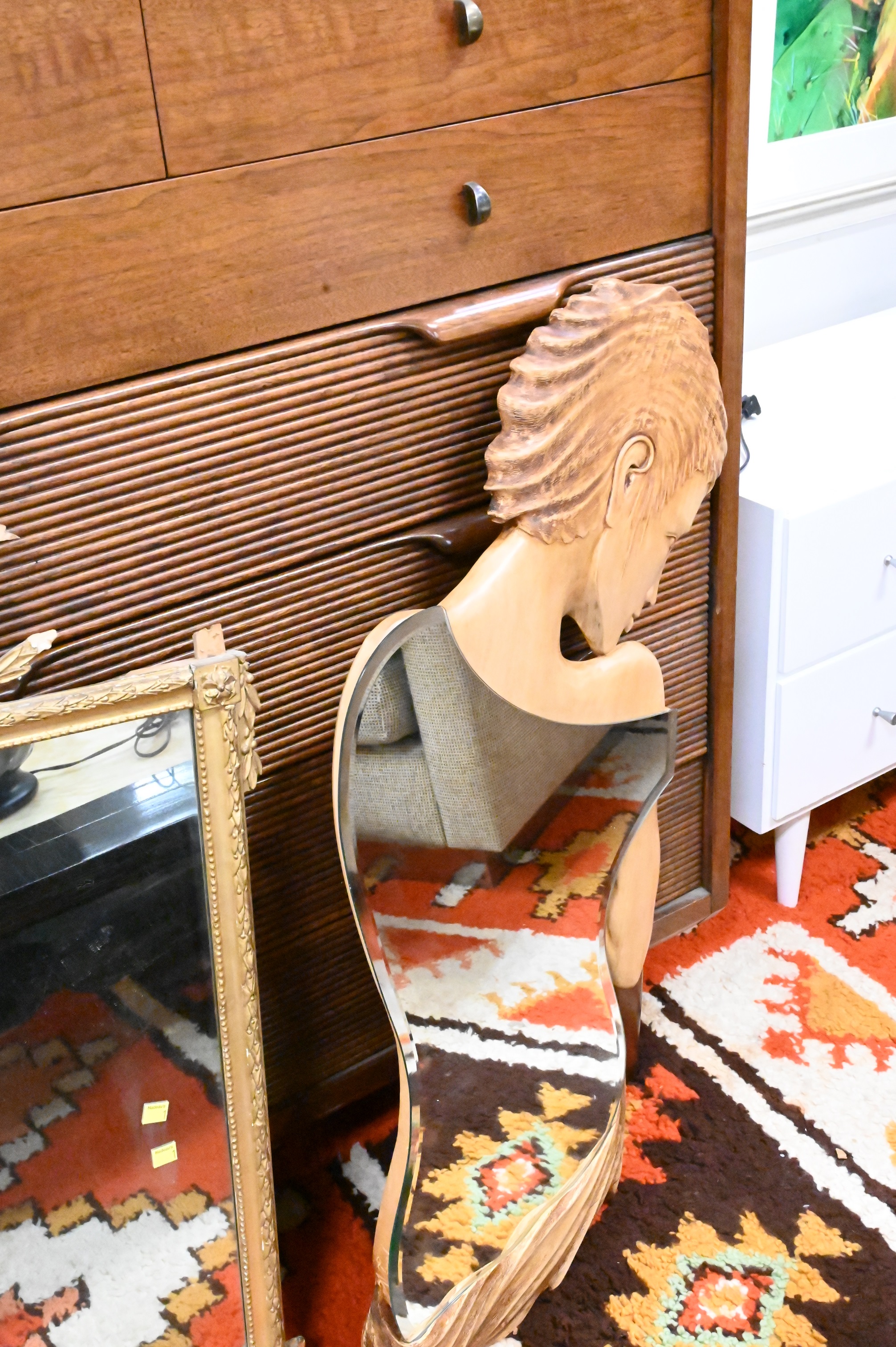 Group of Five Mirrors, to include a carved wood Tyche figural mirror, height 39 inches, an iron mirror, a small round mirror, a gilt Federal style mirror (as is), along with a contemporary silvered framed mirror, 42″ x 58″.