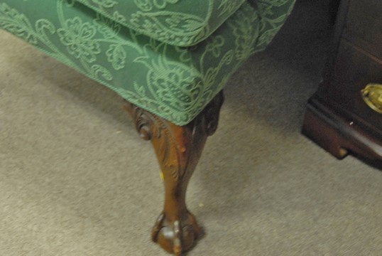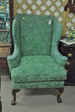 Kittinger Colonial Williamsburg green upholstered wing chair with ball and claw feet.