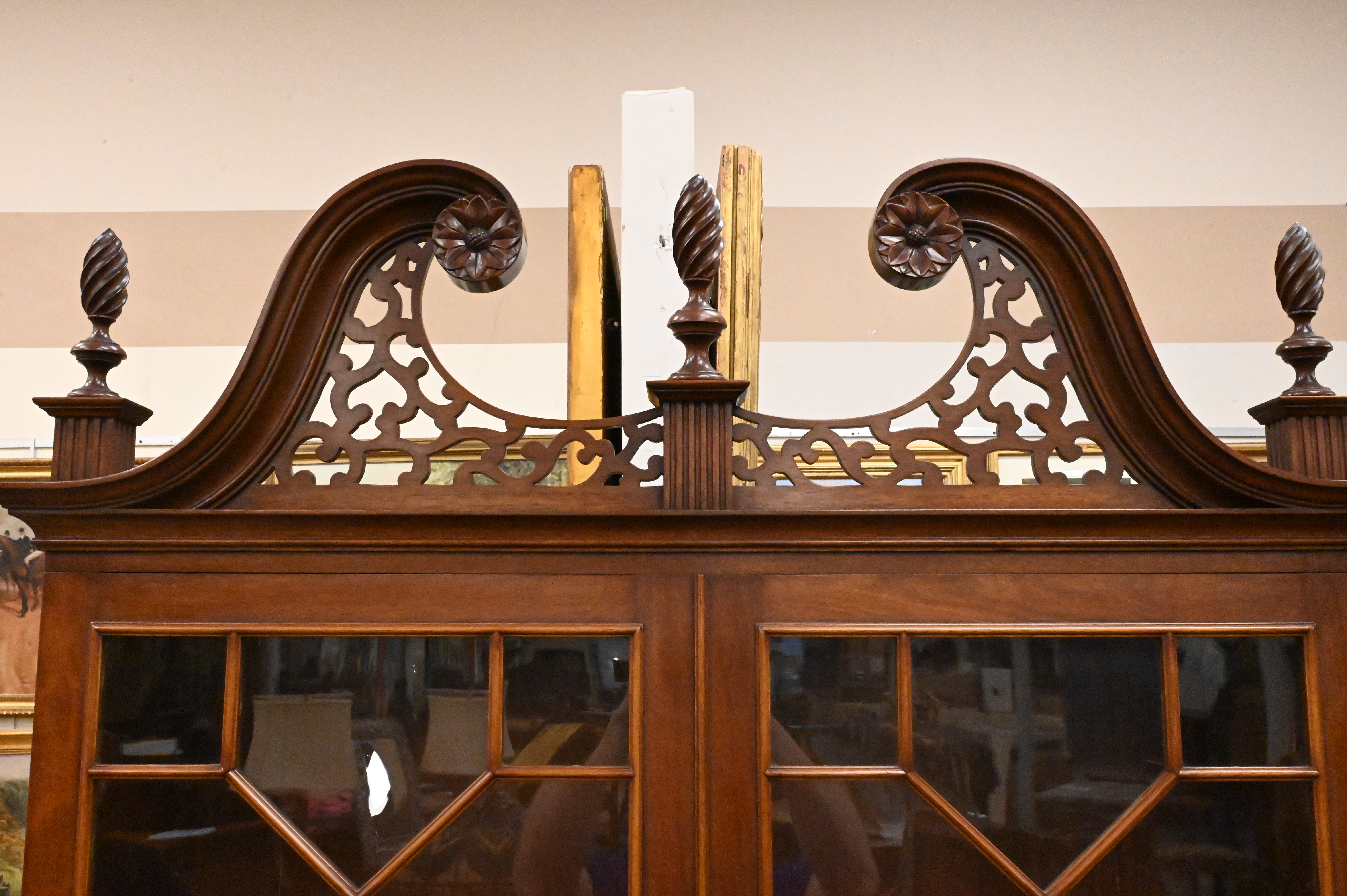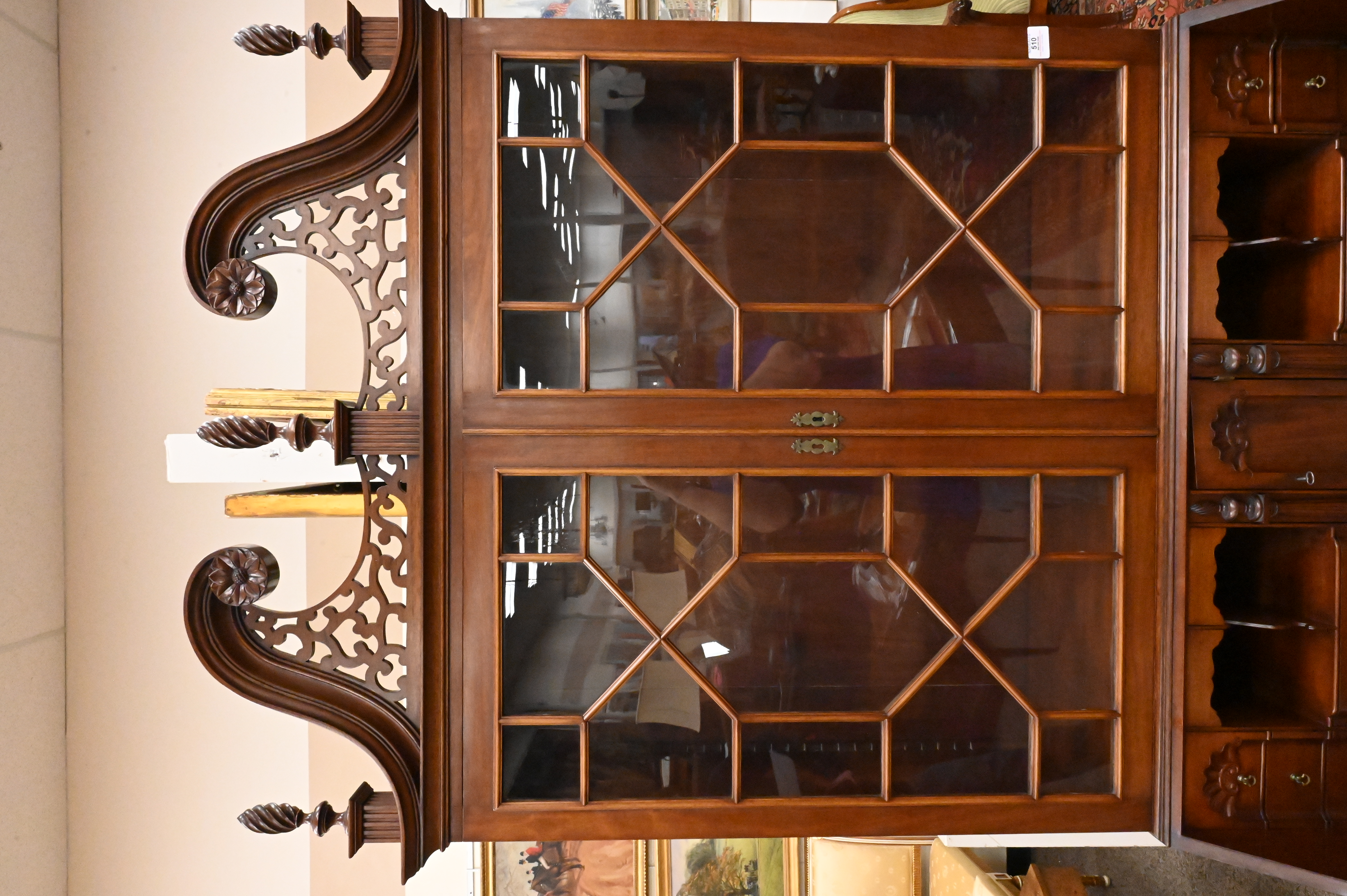 in two parts, upper section having pierced broken arch top with two glazed doors on lower section with slant lid opening to shell carved interior over block front with fluted columns set on ogee feet and brass handles on sides