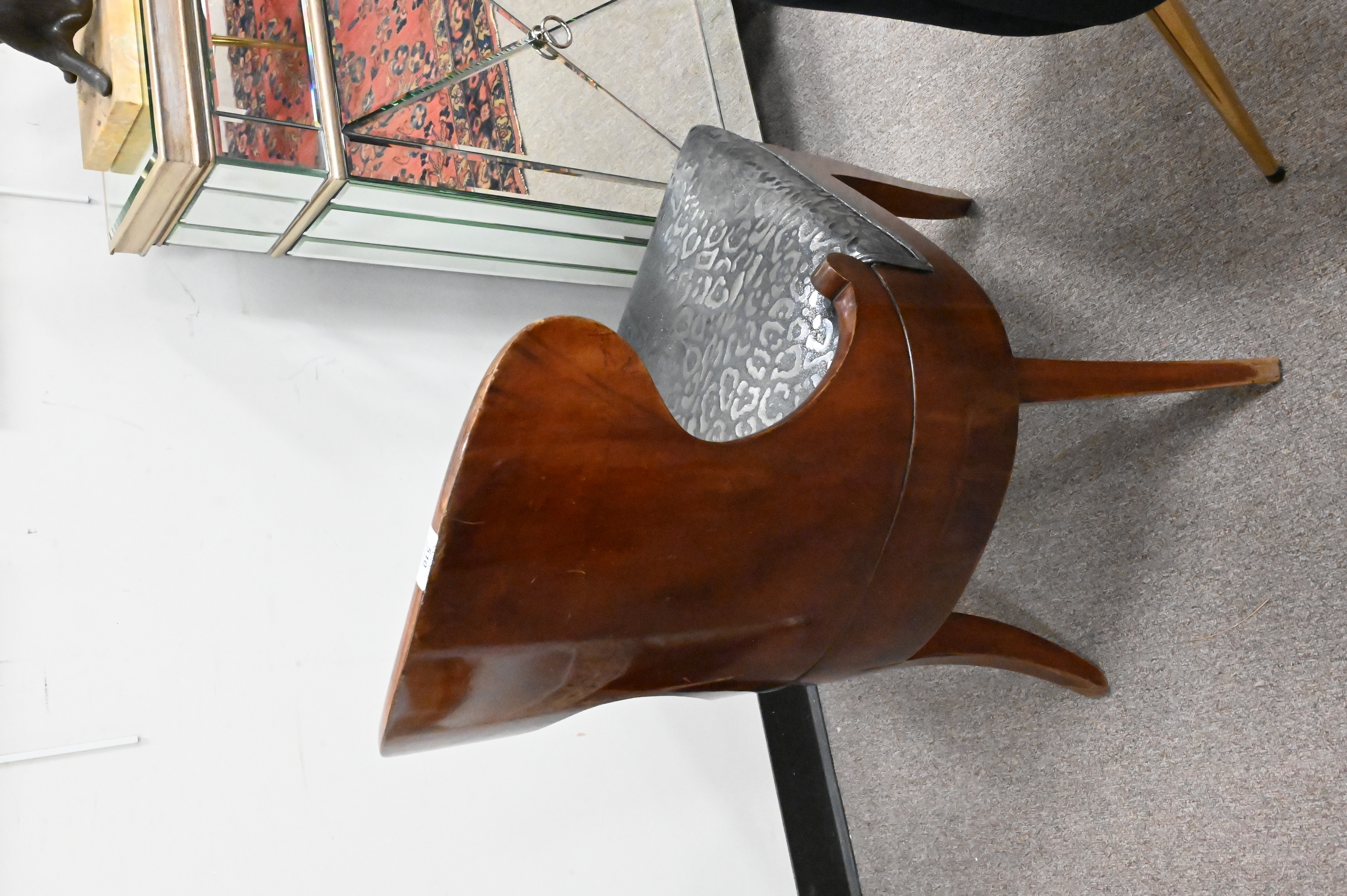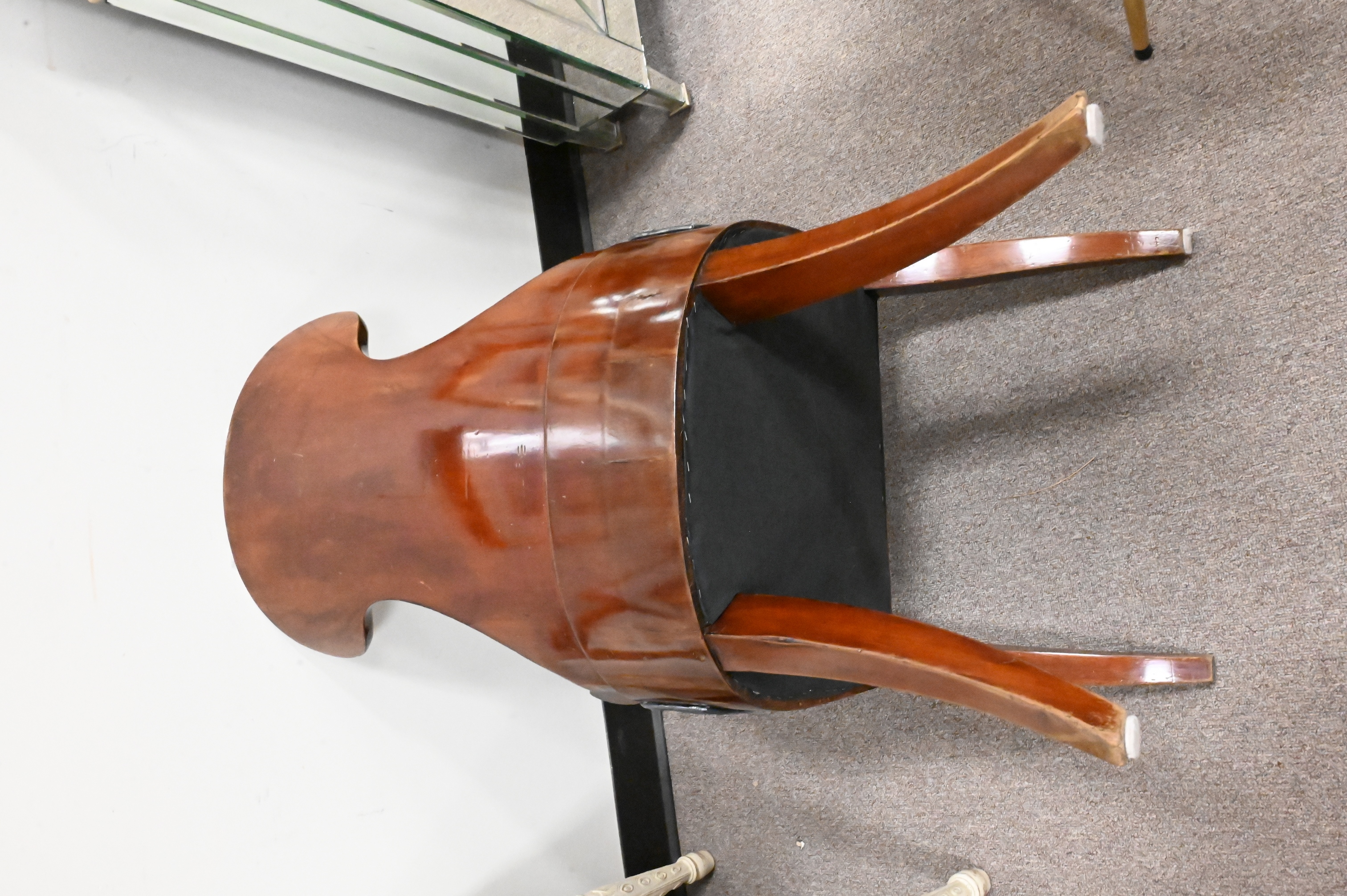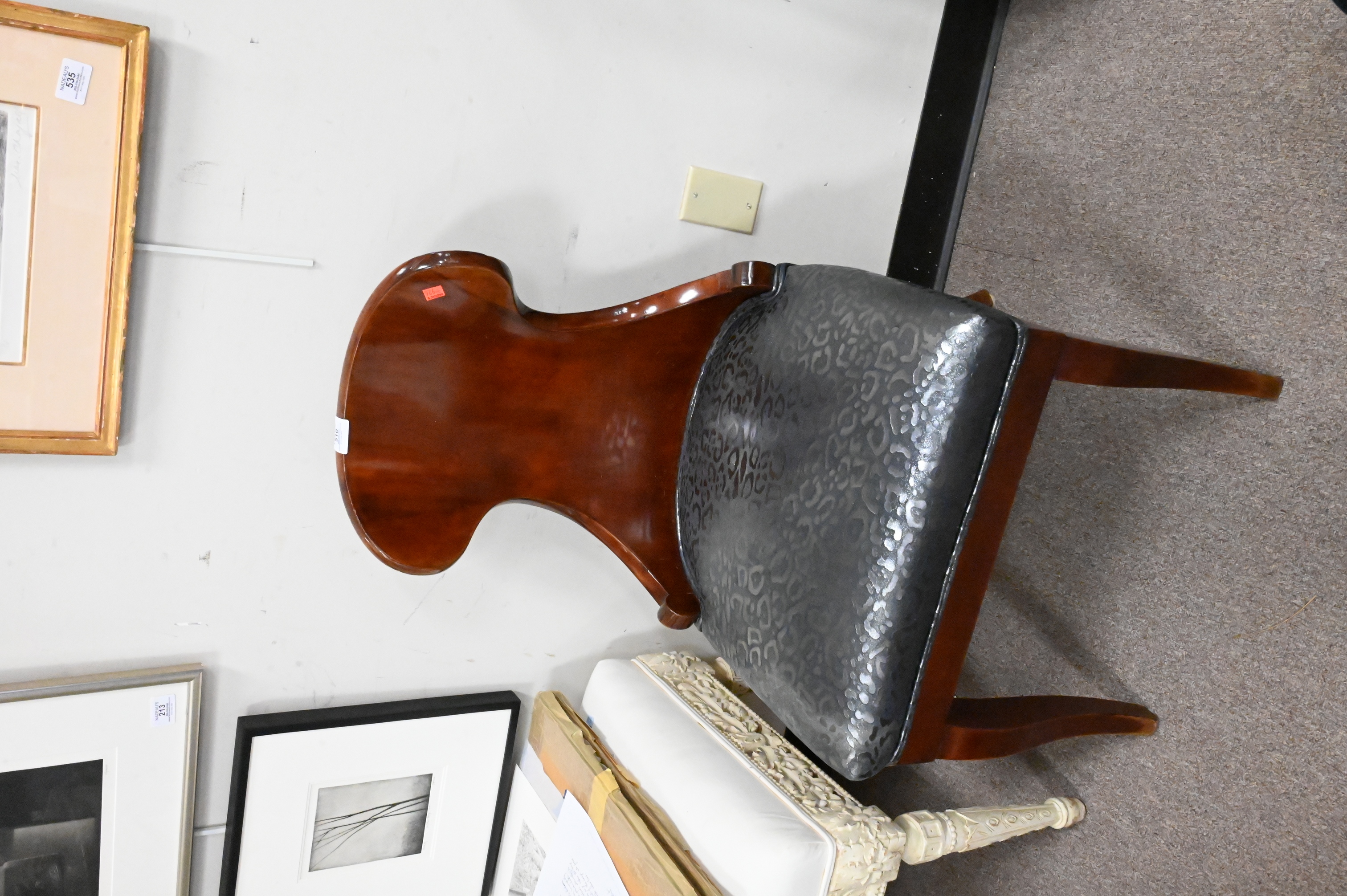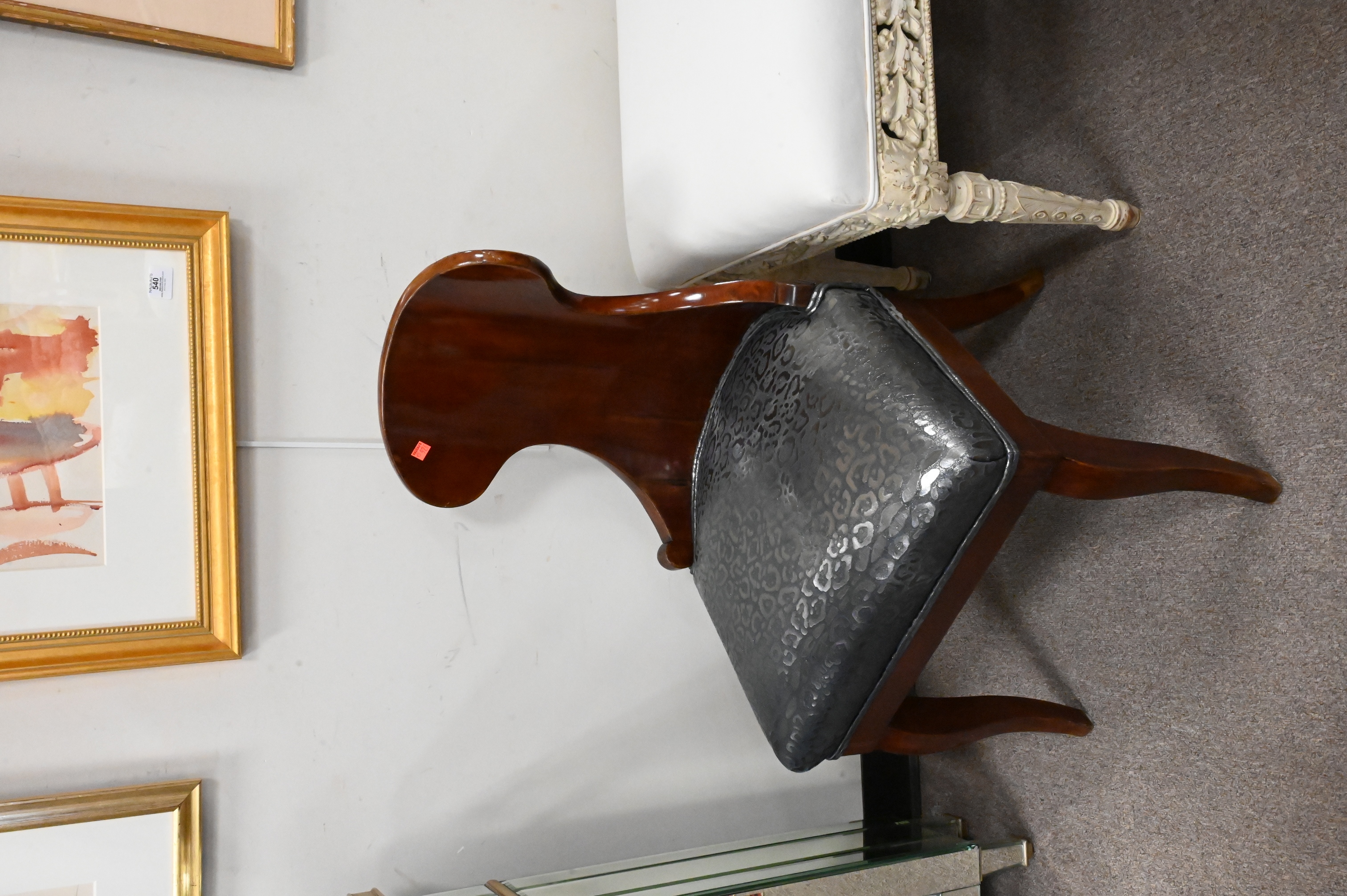 in custom black leopard / cheetah print upholstery over lacquered mahogany wood base and outturned legs