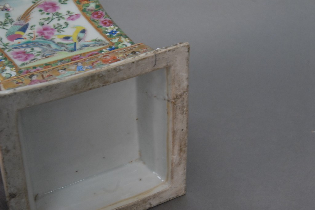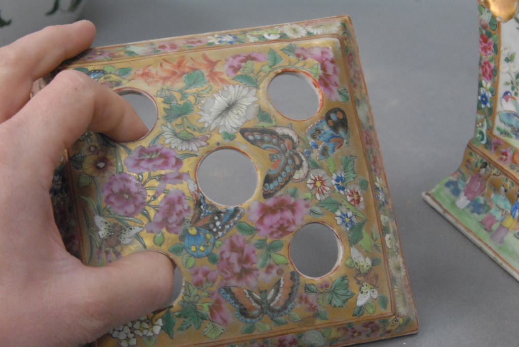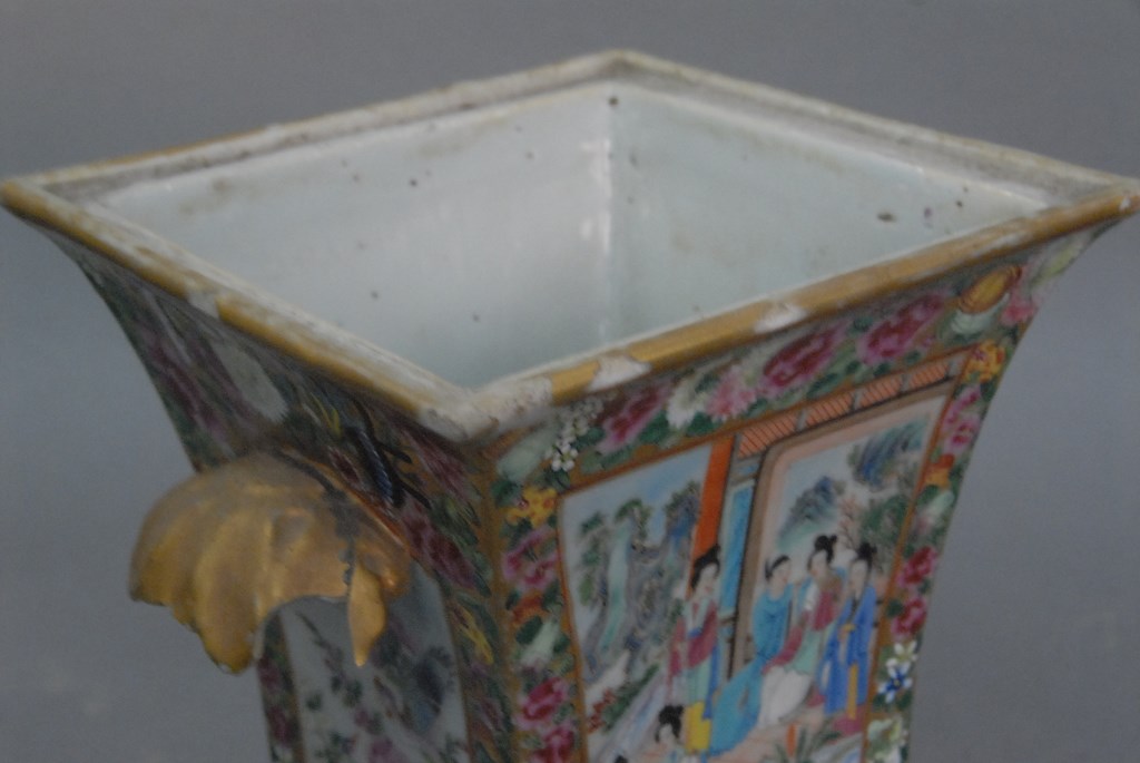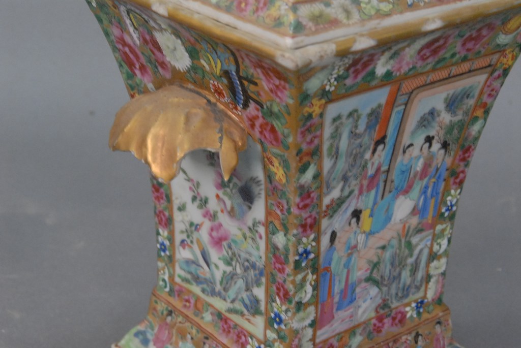 Rose Famille export bough pot with two gold handles one repaired plus small chip. ht. 9in.