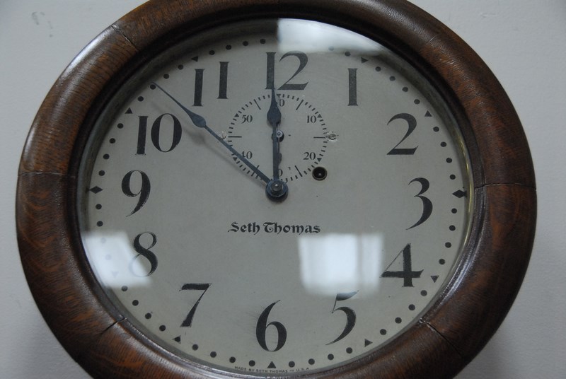 Seth Thomas oak long drop regulator clock. ht. 36in.
