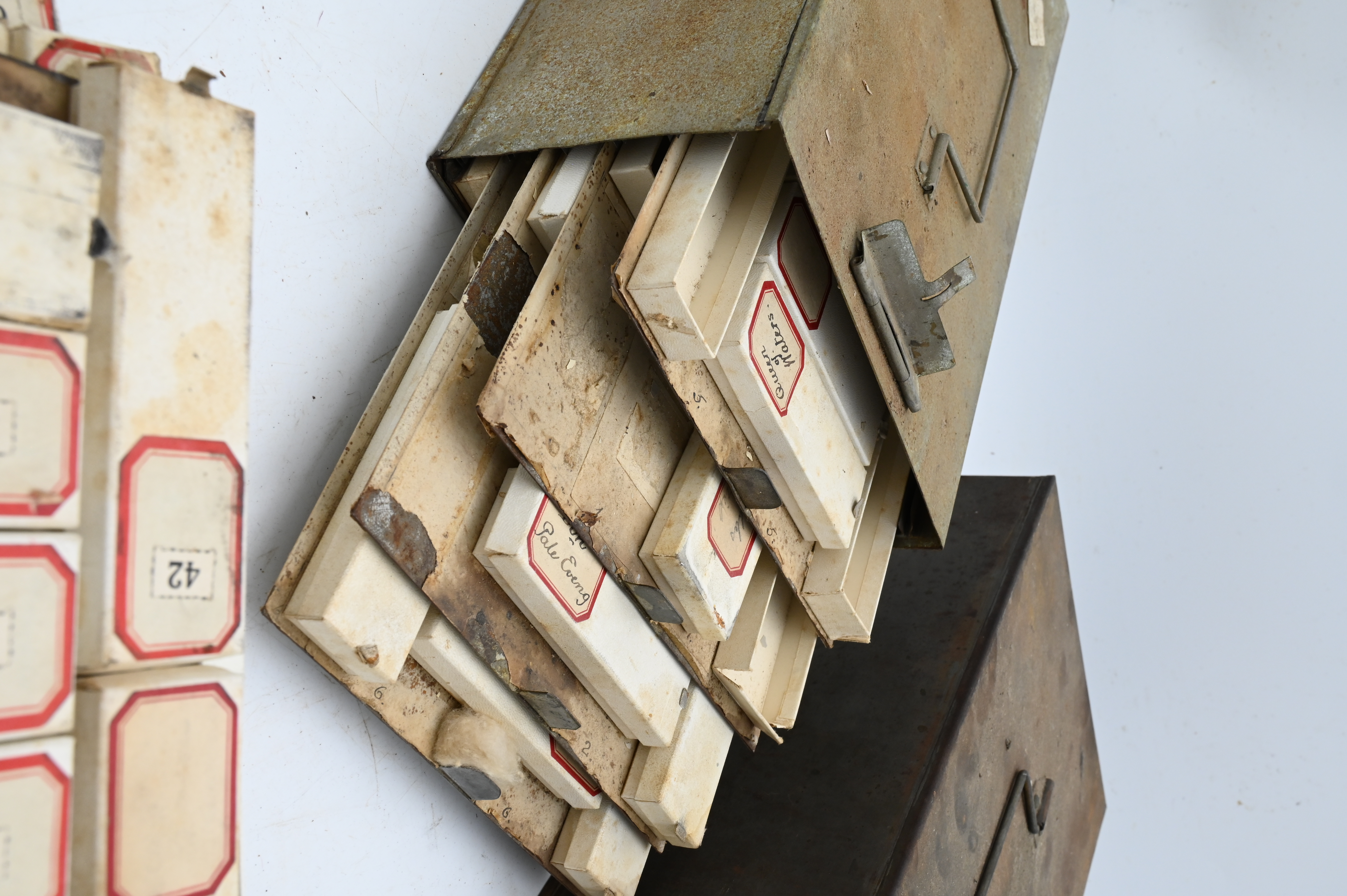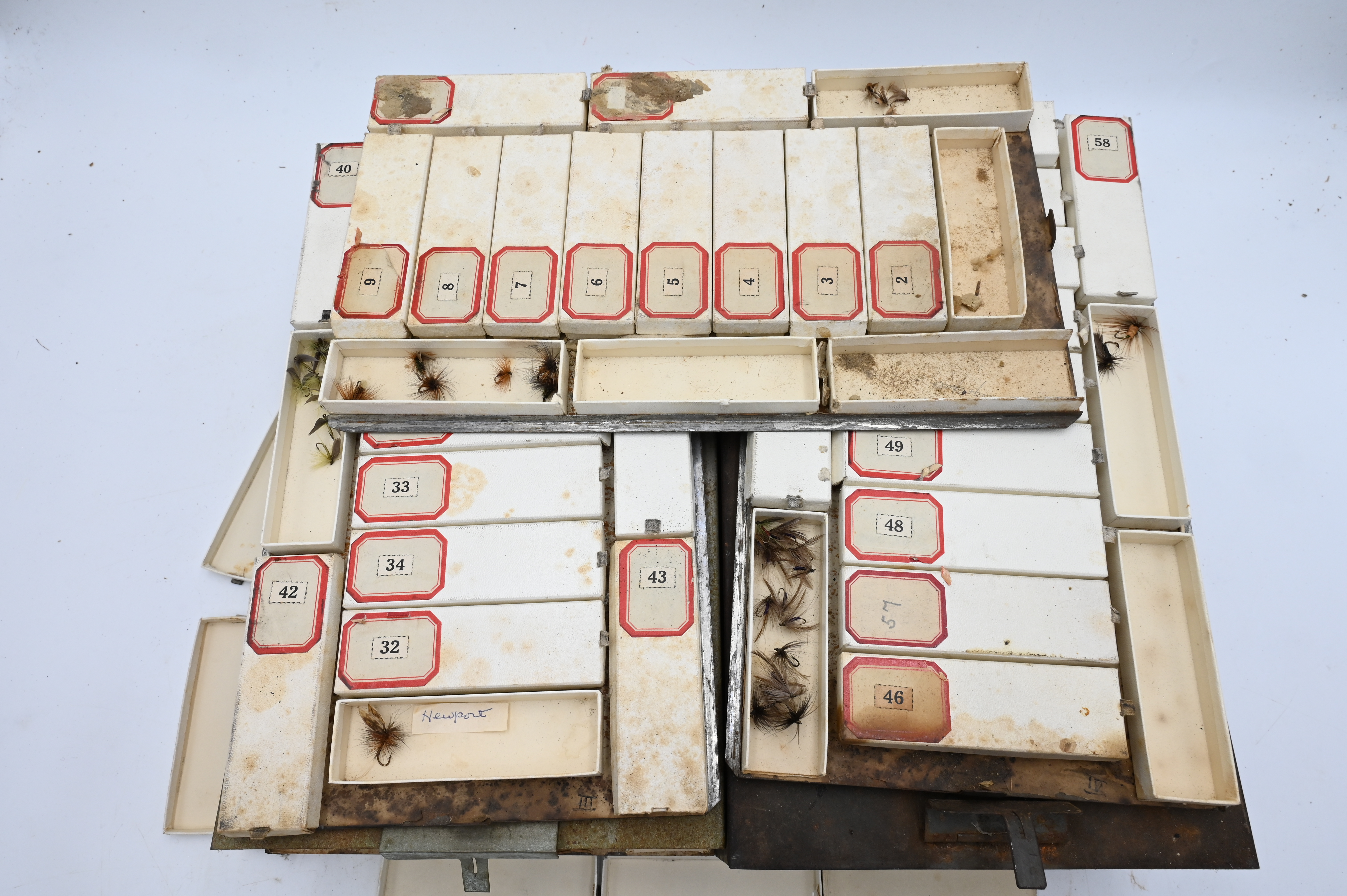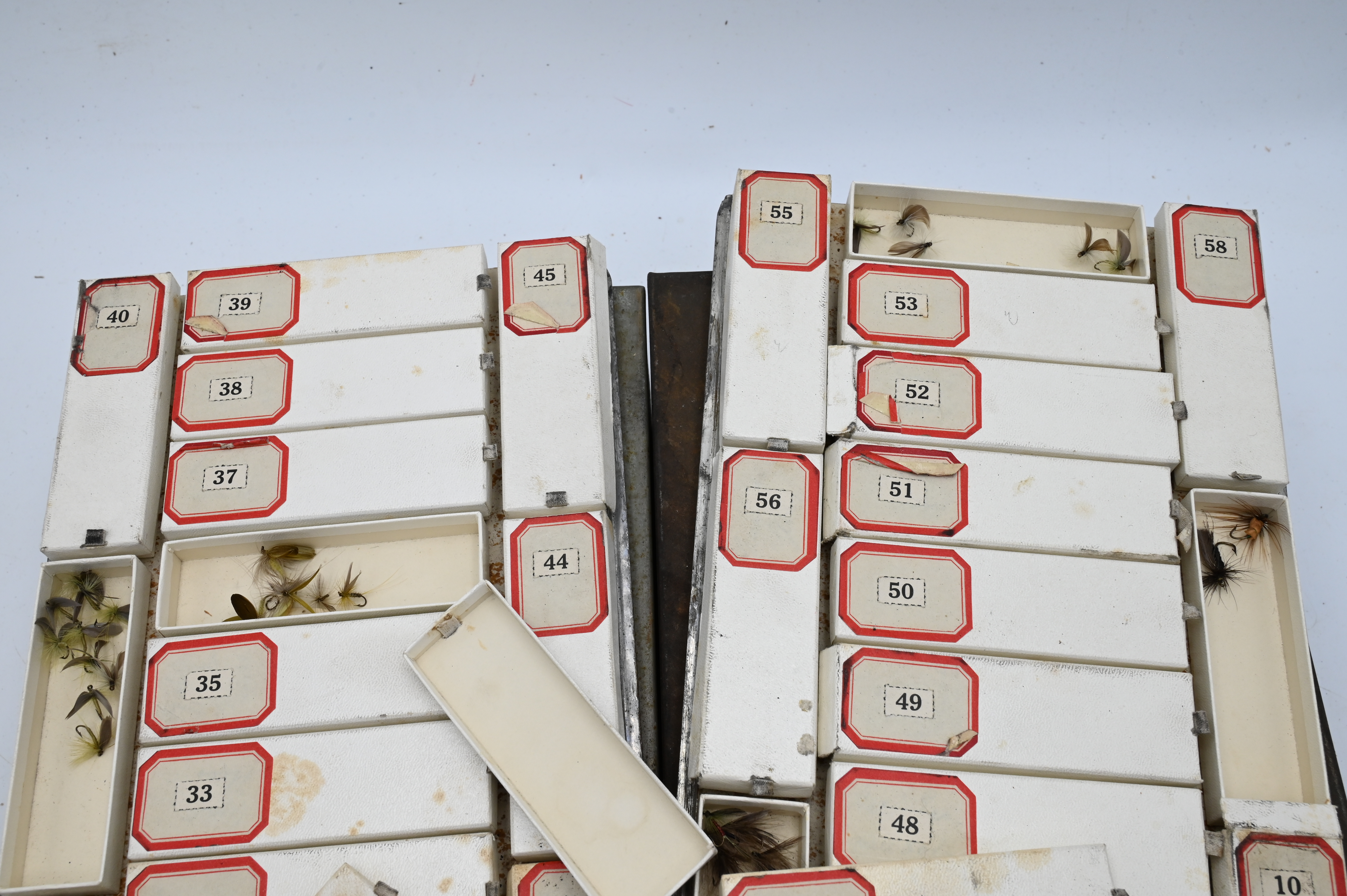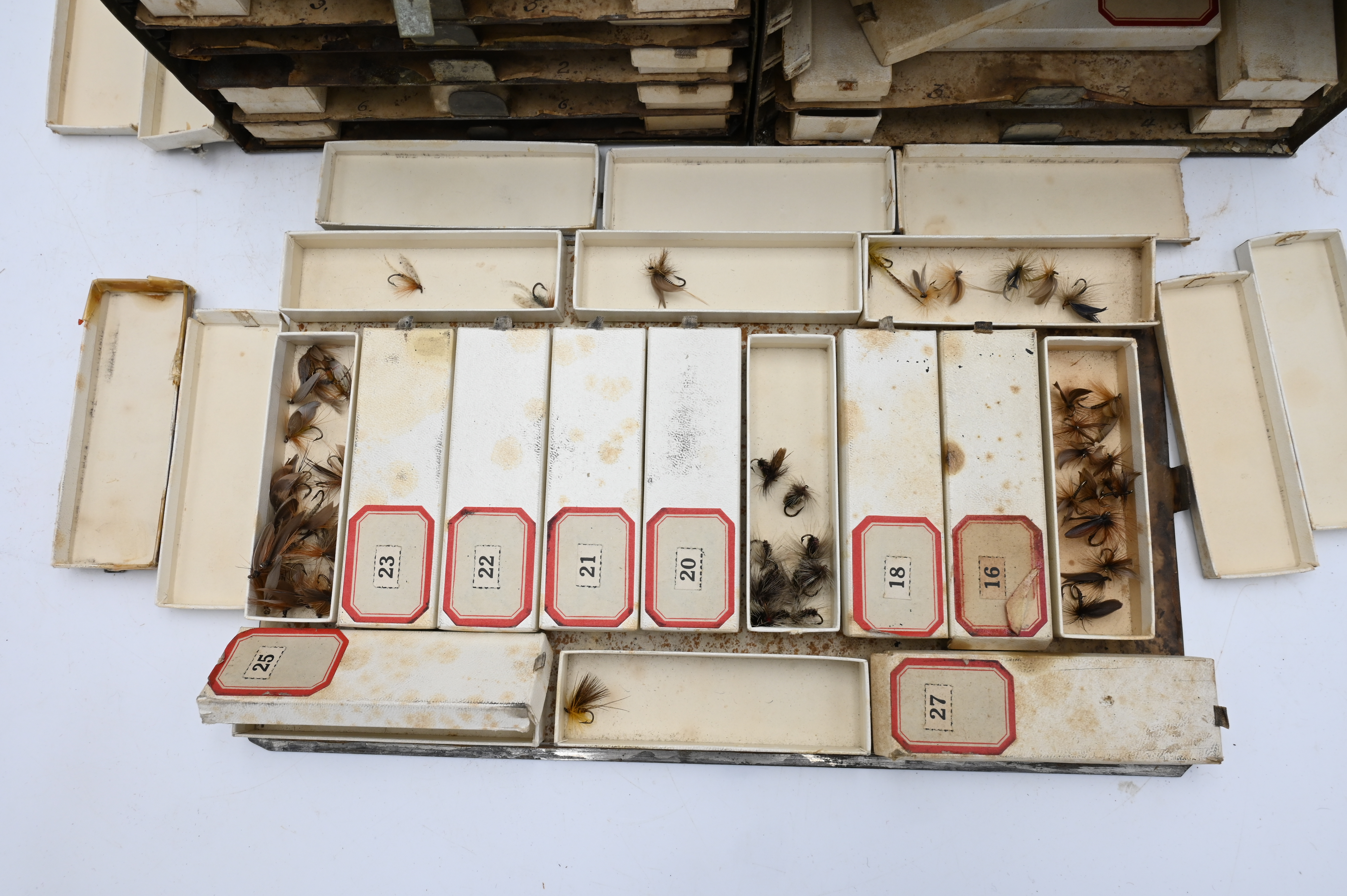 Vintage Store Box of Various Dry Flies, in numbered boxes, five box trays, plus box tray of empty boxes, height 4 1/2 inches, top 7 1/2″ x 12″