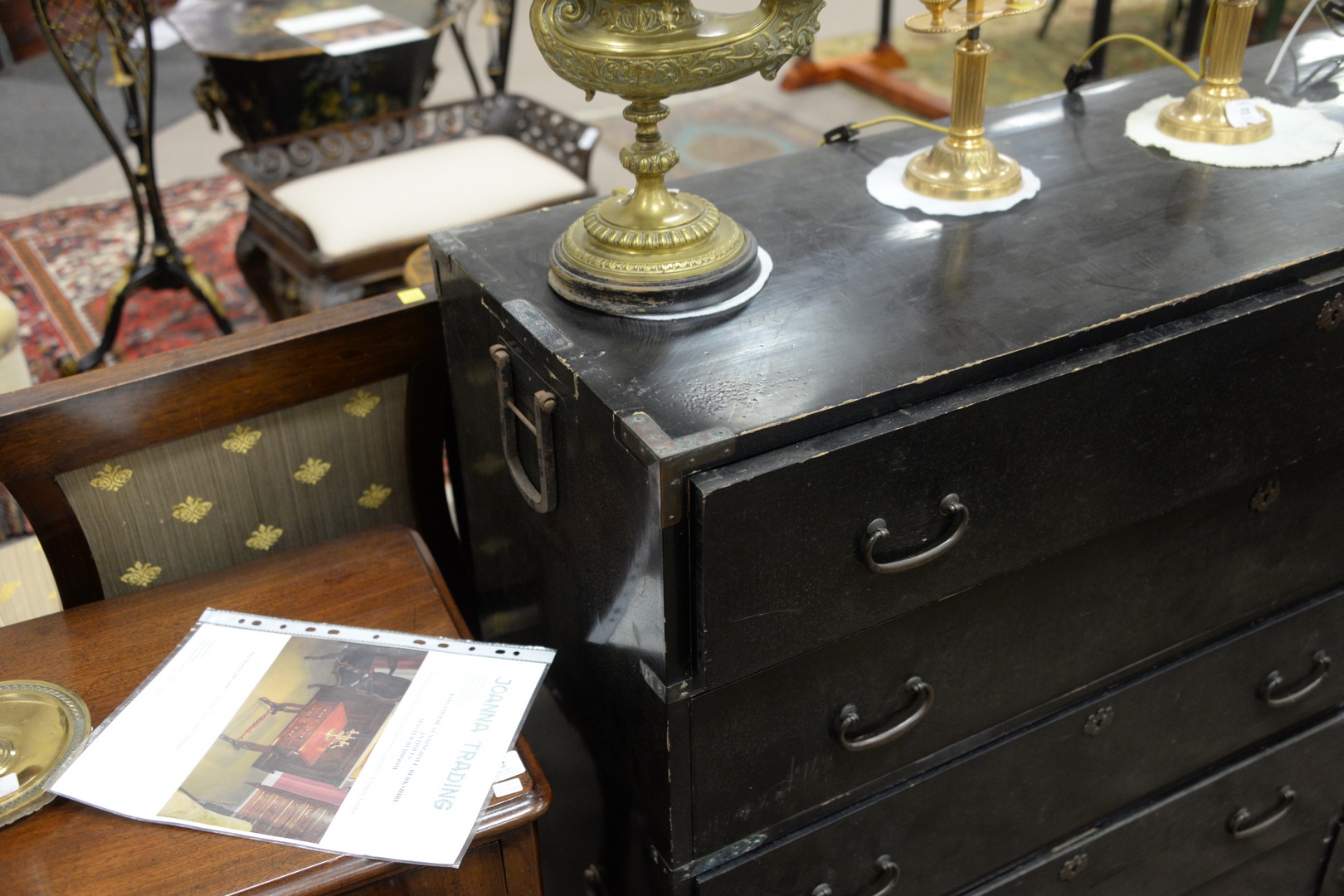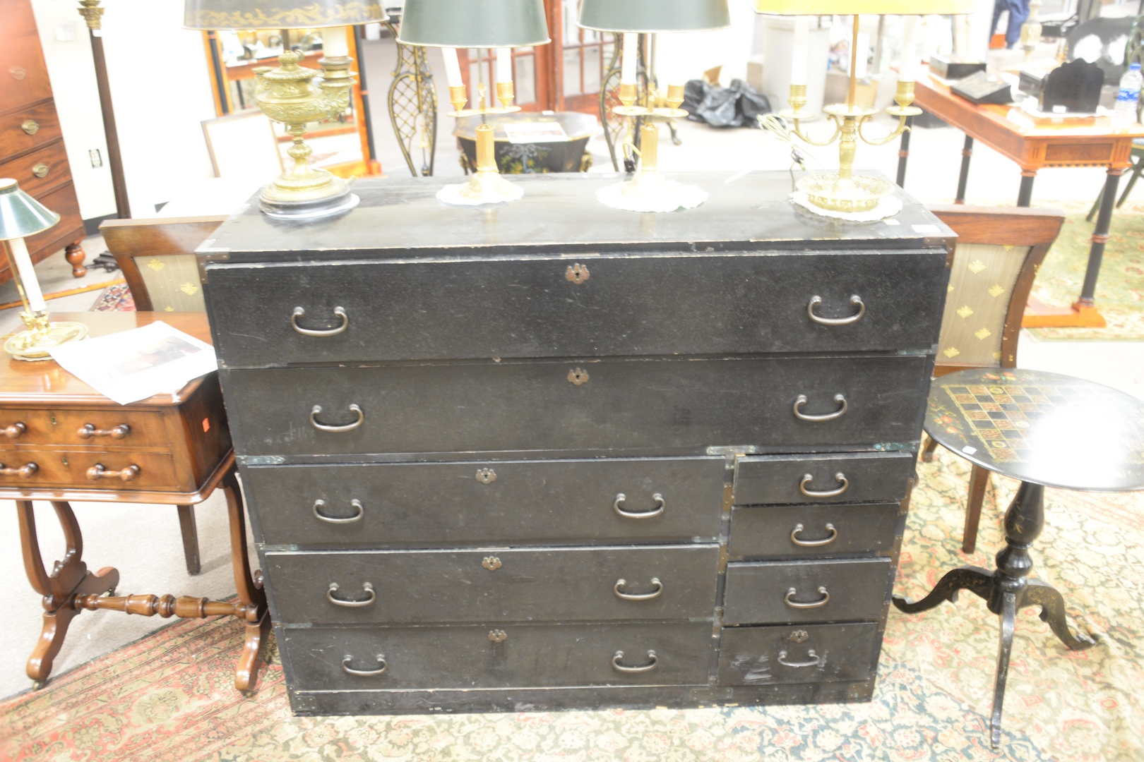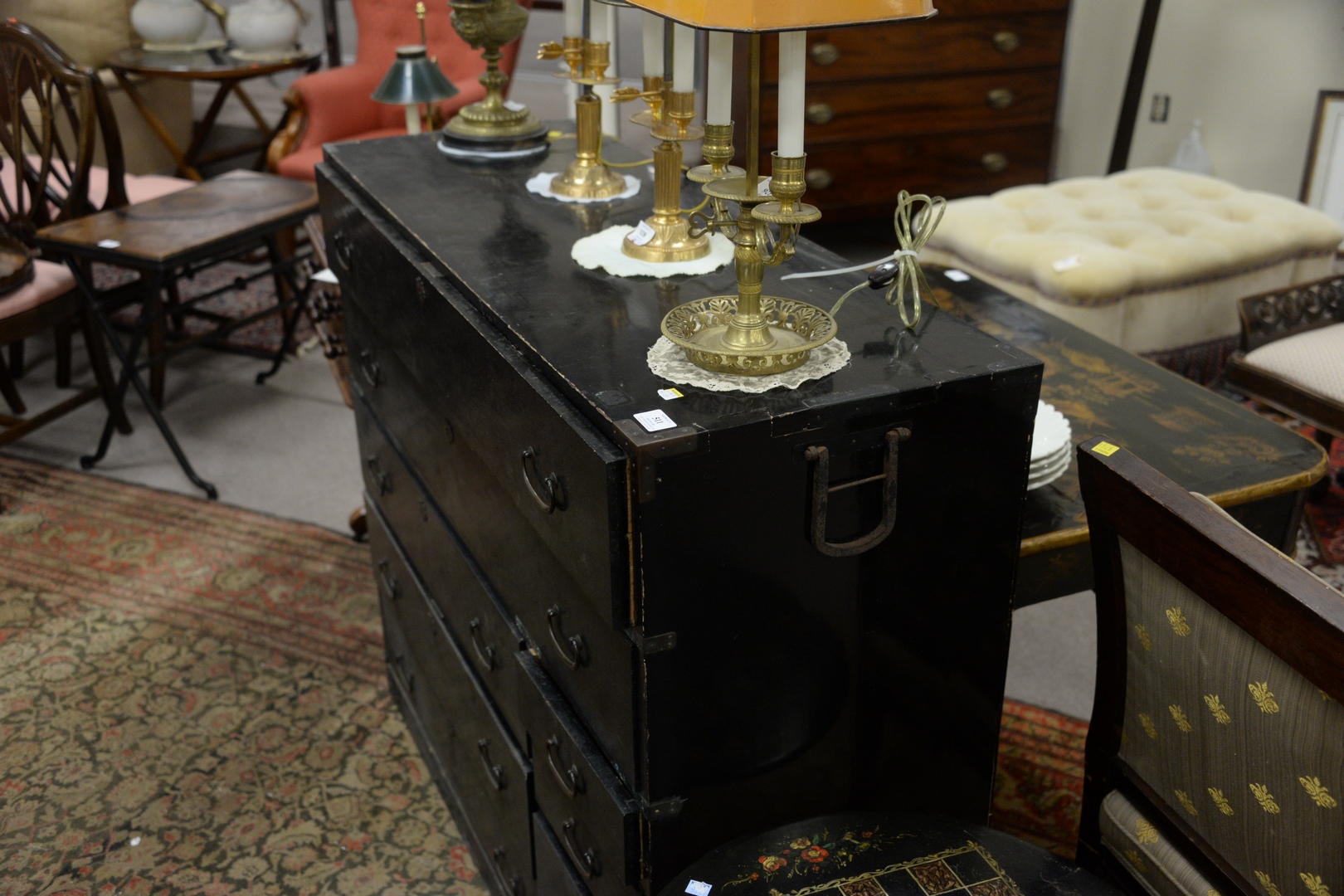 Lot 511: Black Painted Campaign Chest having four drawers and brass mounts width 46 inches, height 39 inches.