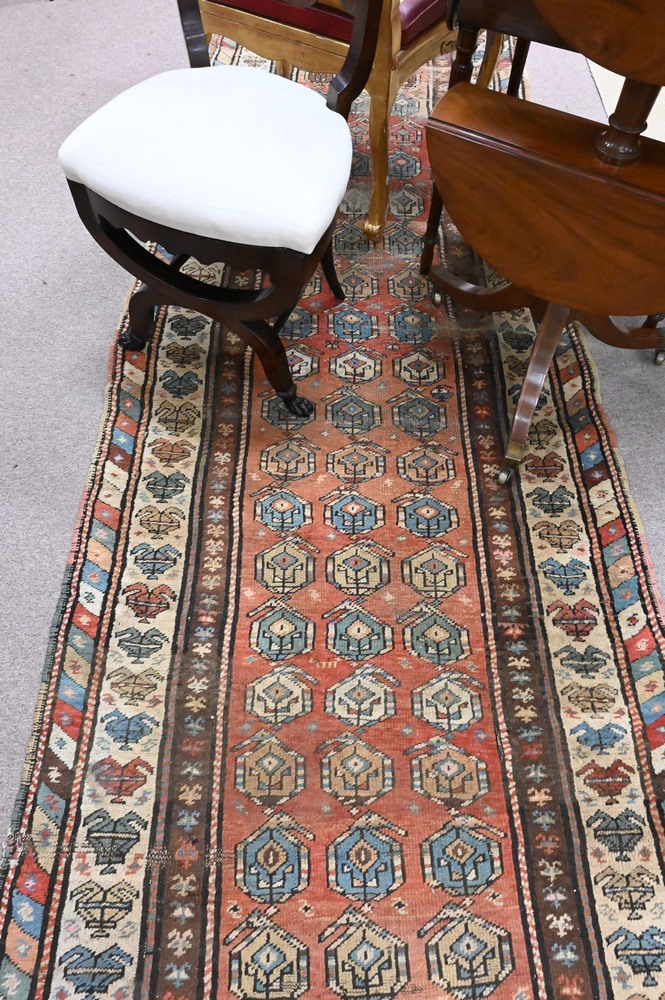 Caucasian Oriental Runner, having some wear, 3′ 6″ x 12′ 4″.
