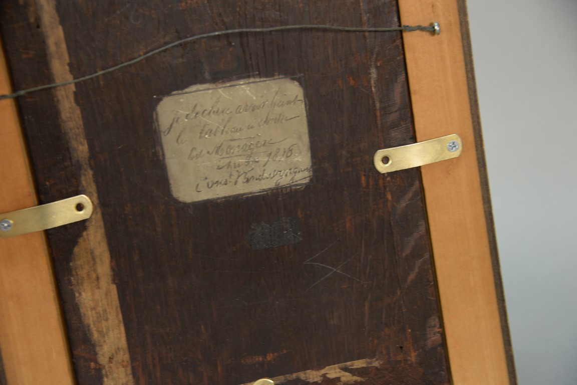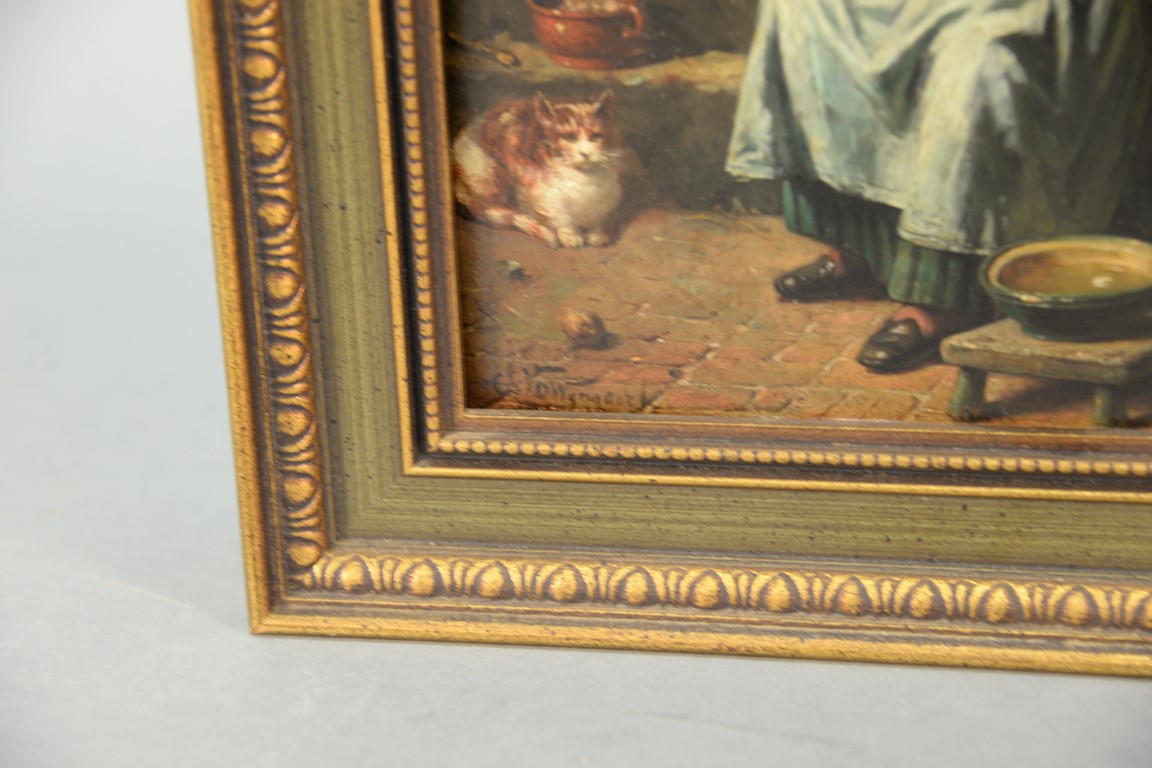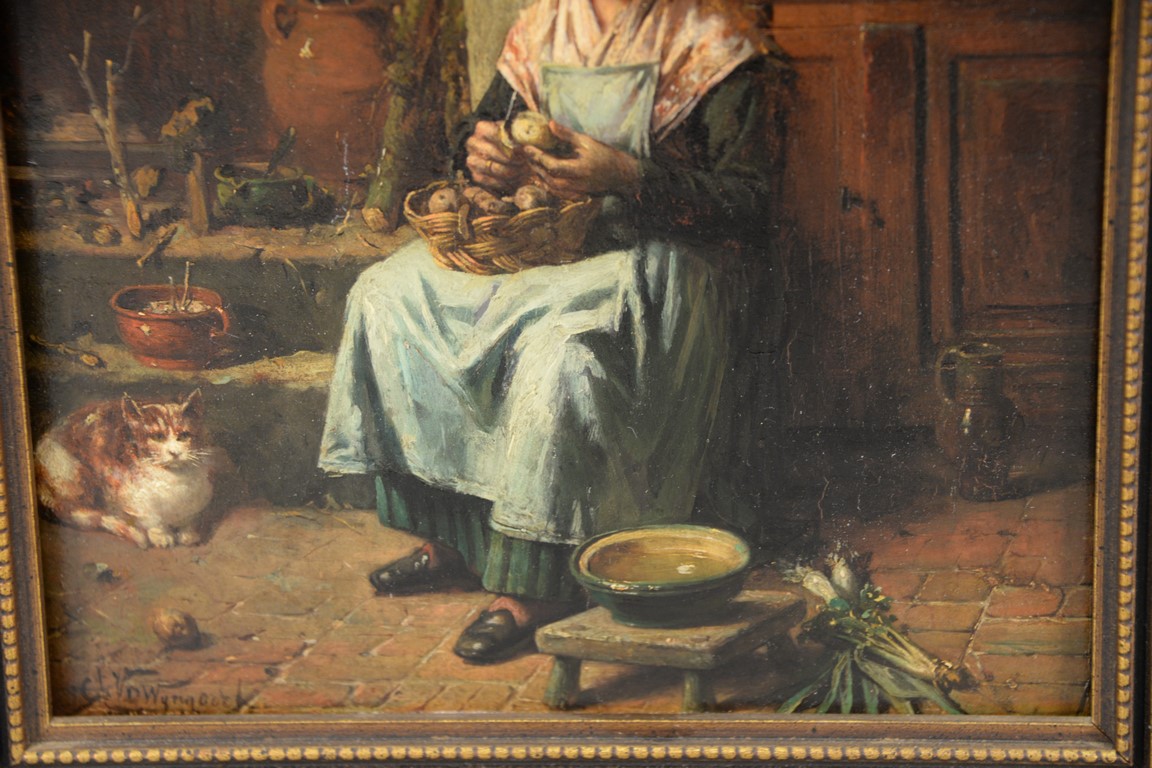 Lot 511: Constant Wyngaert b. 1840 oil on board Interior Woman Peeling signed lower left: Cons. Wyngaert writing on reverse …