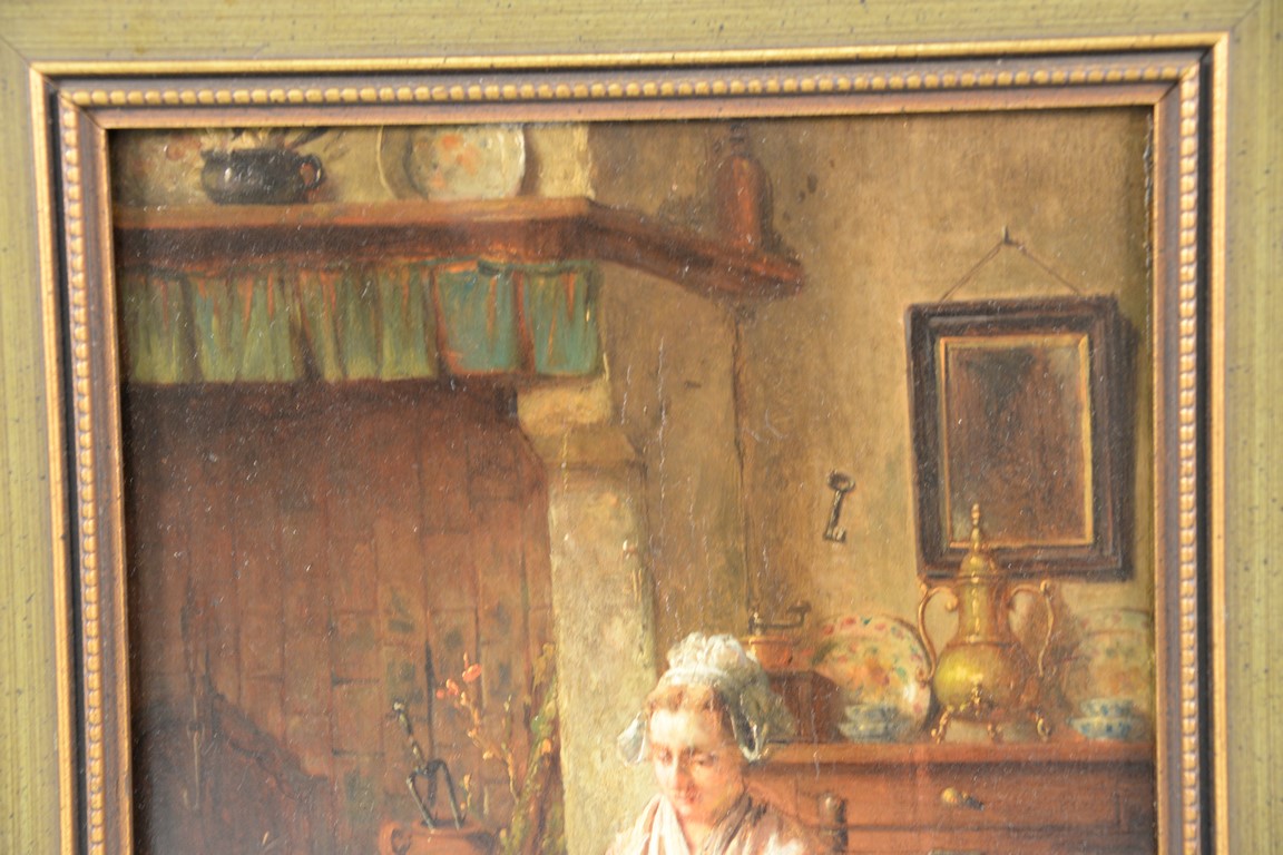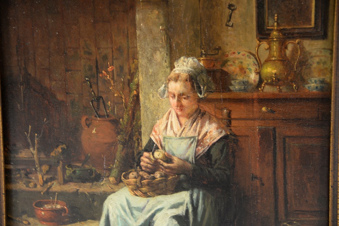 Constant Wyngaert b. 1840 oil on board Interior Woman Peeling signed lower left: Cons. Wyngaert writing on reverse 11 x 8