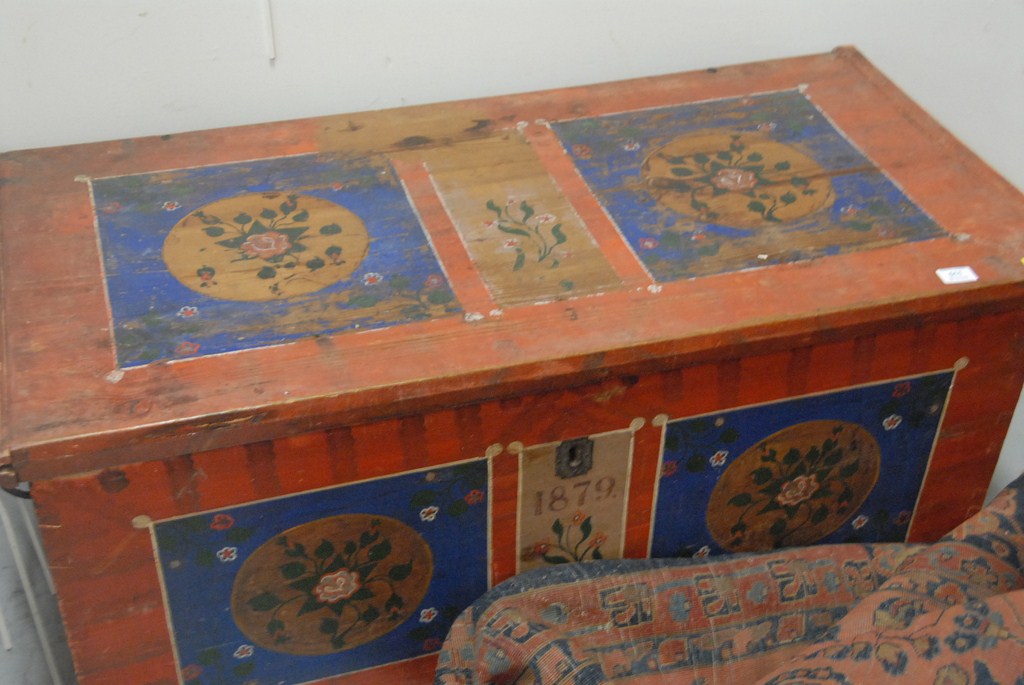 Lot 511: Continental pine lift top primitive chest in original red paint and floral painted panels. ht. 21in. wd. 48in. dp. 23in.