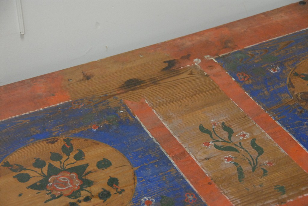 Continental pine lift top primitive chest in original red paint and floral painted panels. ht. 21in. wd. 48in. dp. 23in.