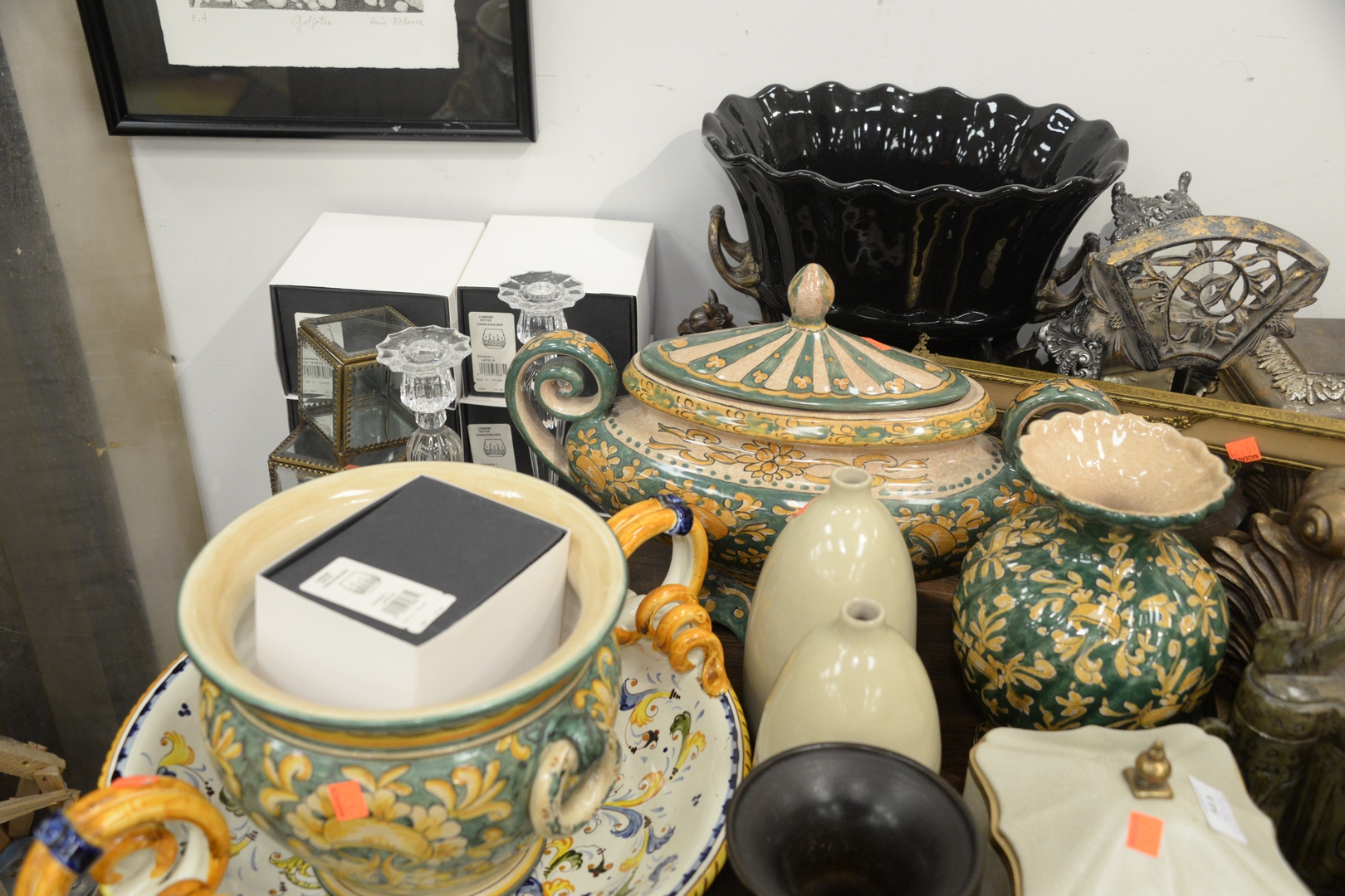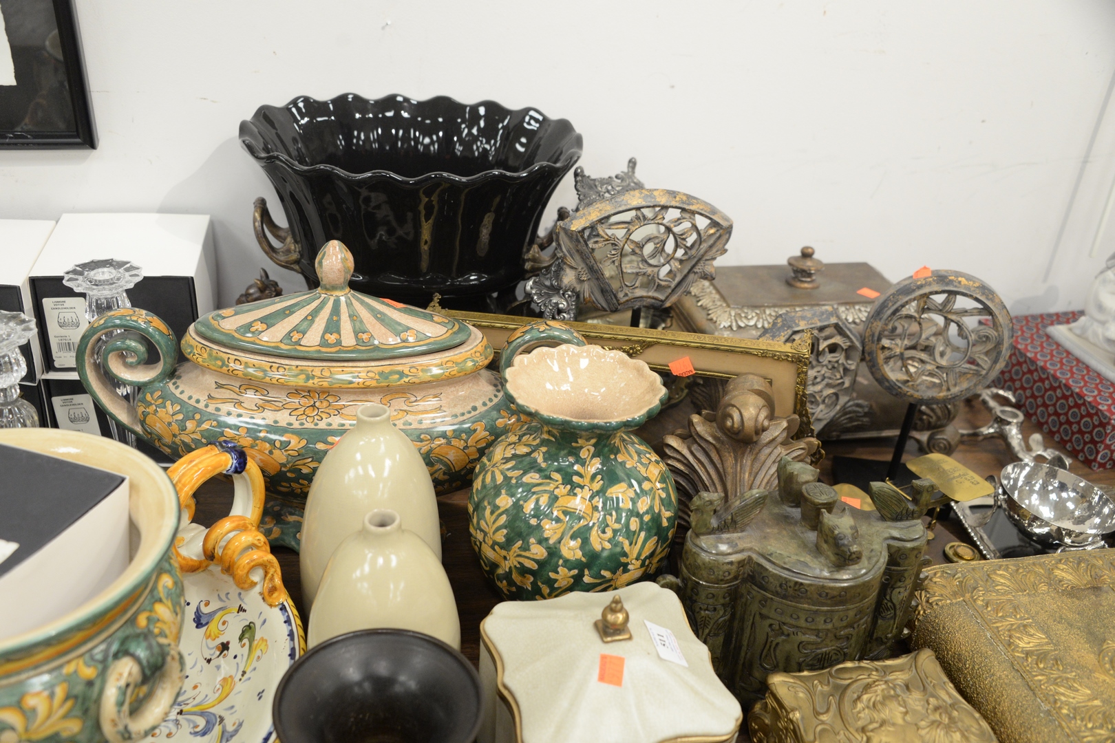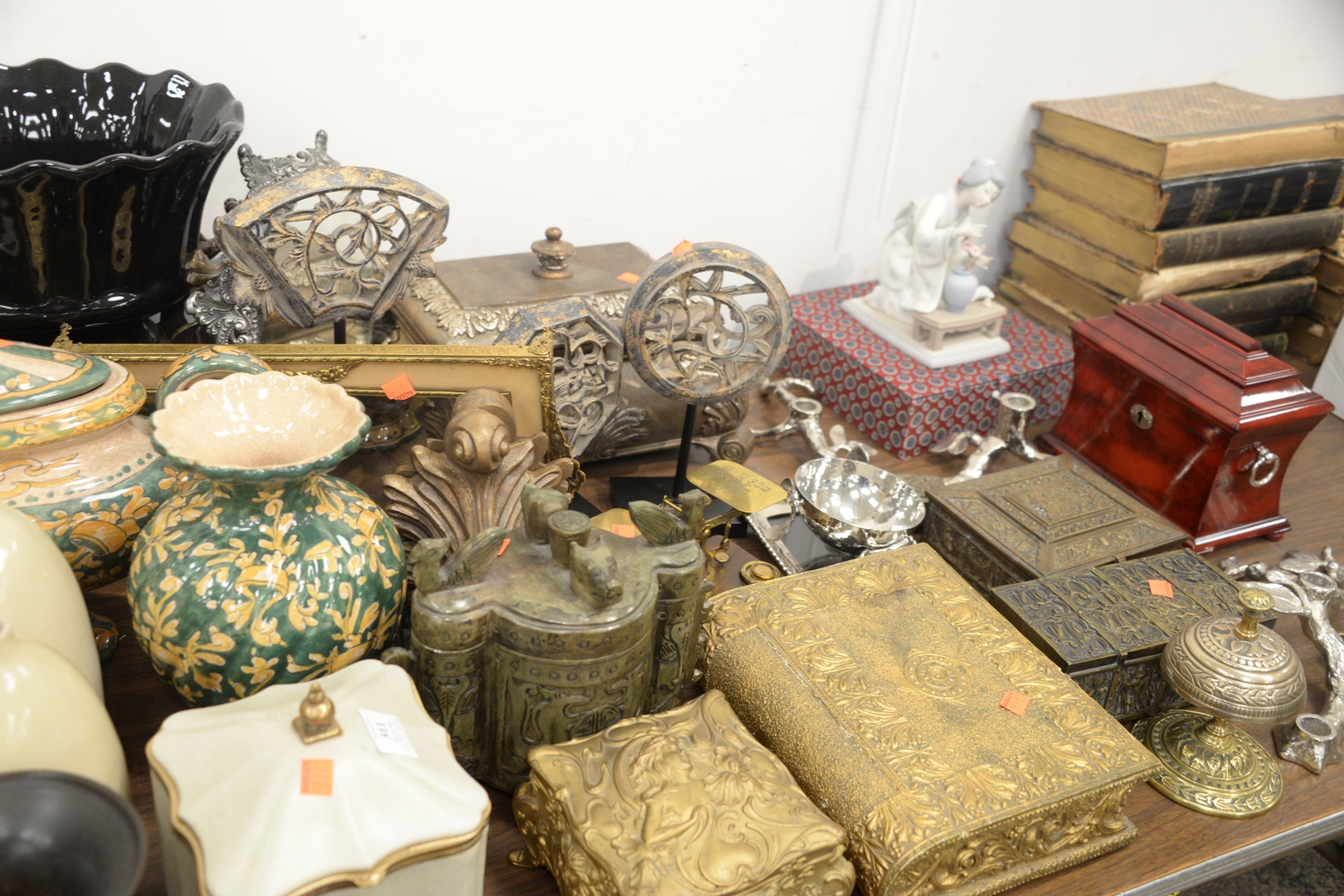 Lot 511: Large Group of Decorative Pieces, to include Majolica, metal work, vases, boxes, bookends, candle holders, Lladro figure (finger as is), along with hardstone box.