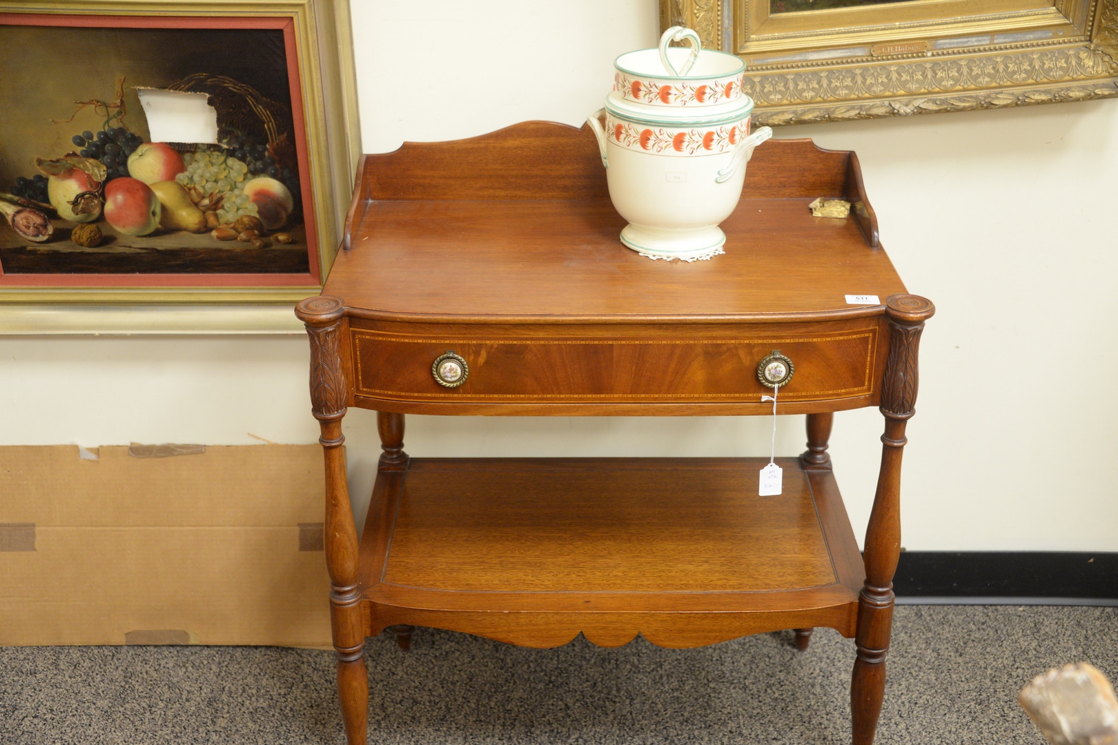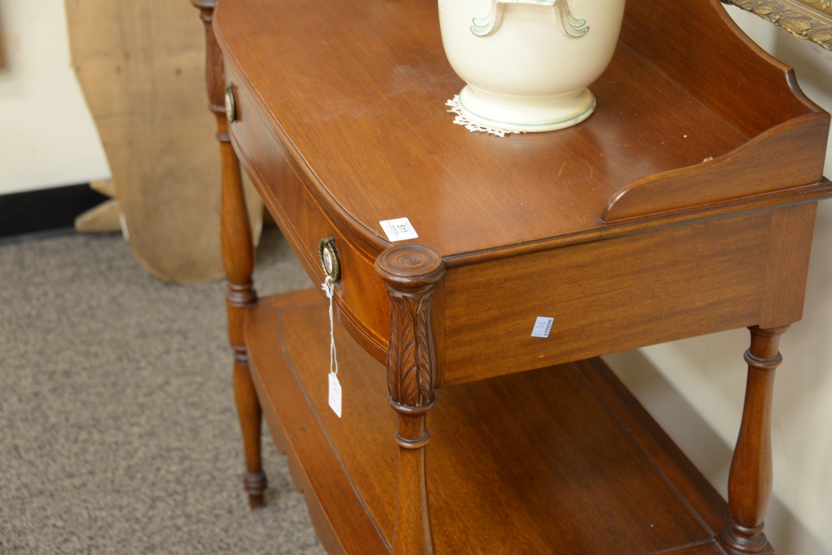 Lot 511: Margolis Mahogany Wash Stand, with gallery back over turret corners over one drawer and one shelf on turned legs, height 35 inches, top 16 1/2 x 30.