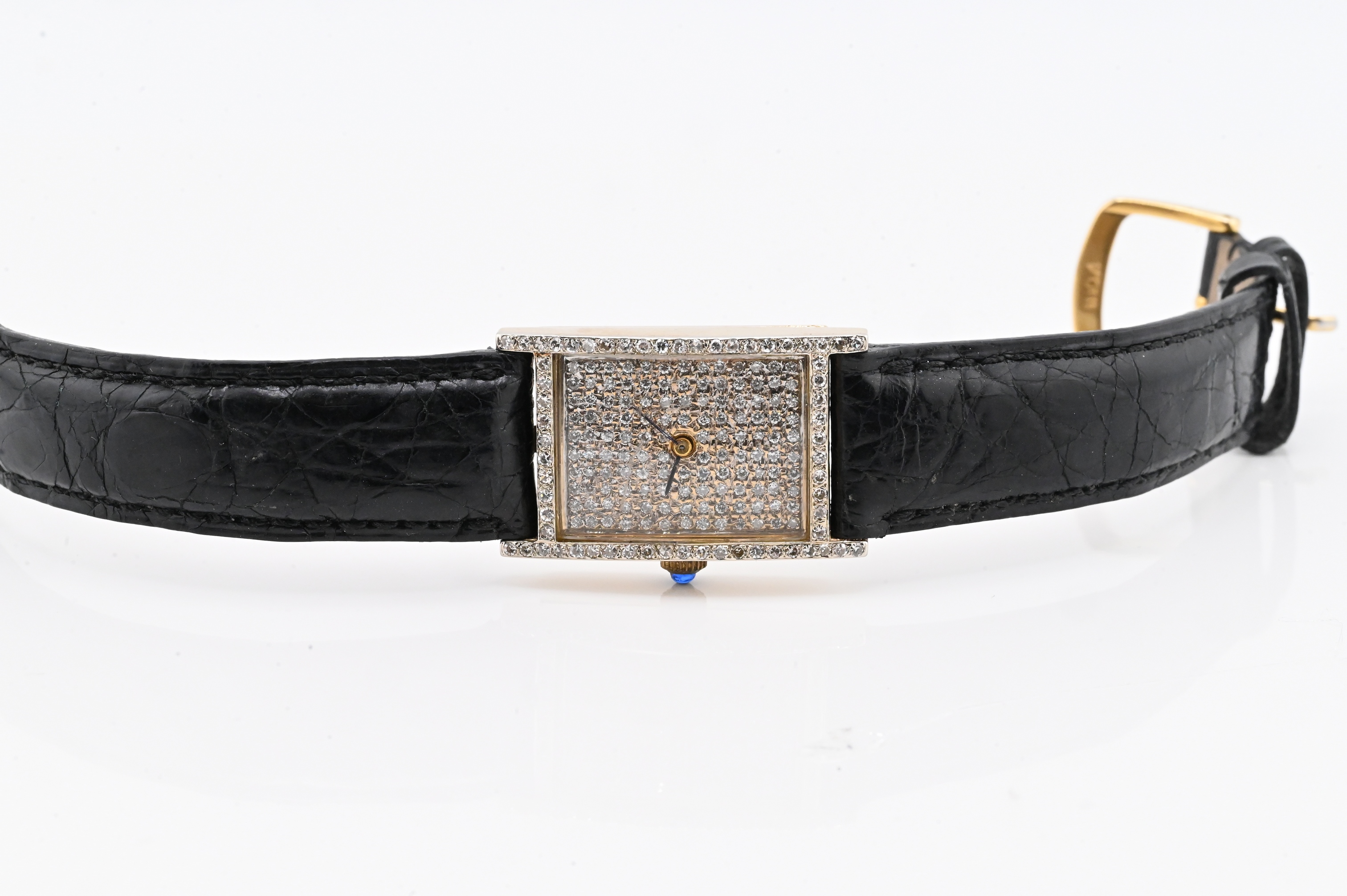 Rectangular 14K gold case, pavé diamond dial and bezel, manual-wind Omega Caliber 620 movement, marked inside case “OMEGA WATCH CO / 14K GOLD / D6786 / 777609” case size 21mm x 34mm set with cabochon sapphire crown, black leather strap
