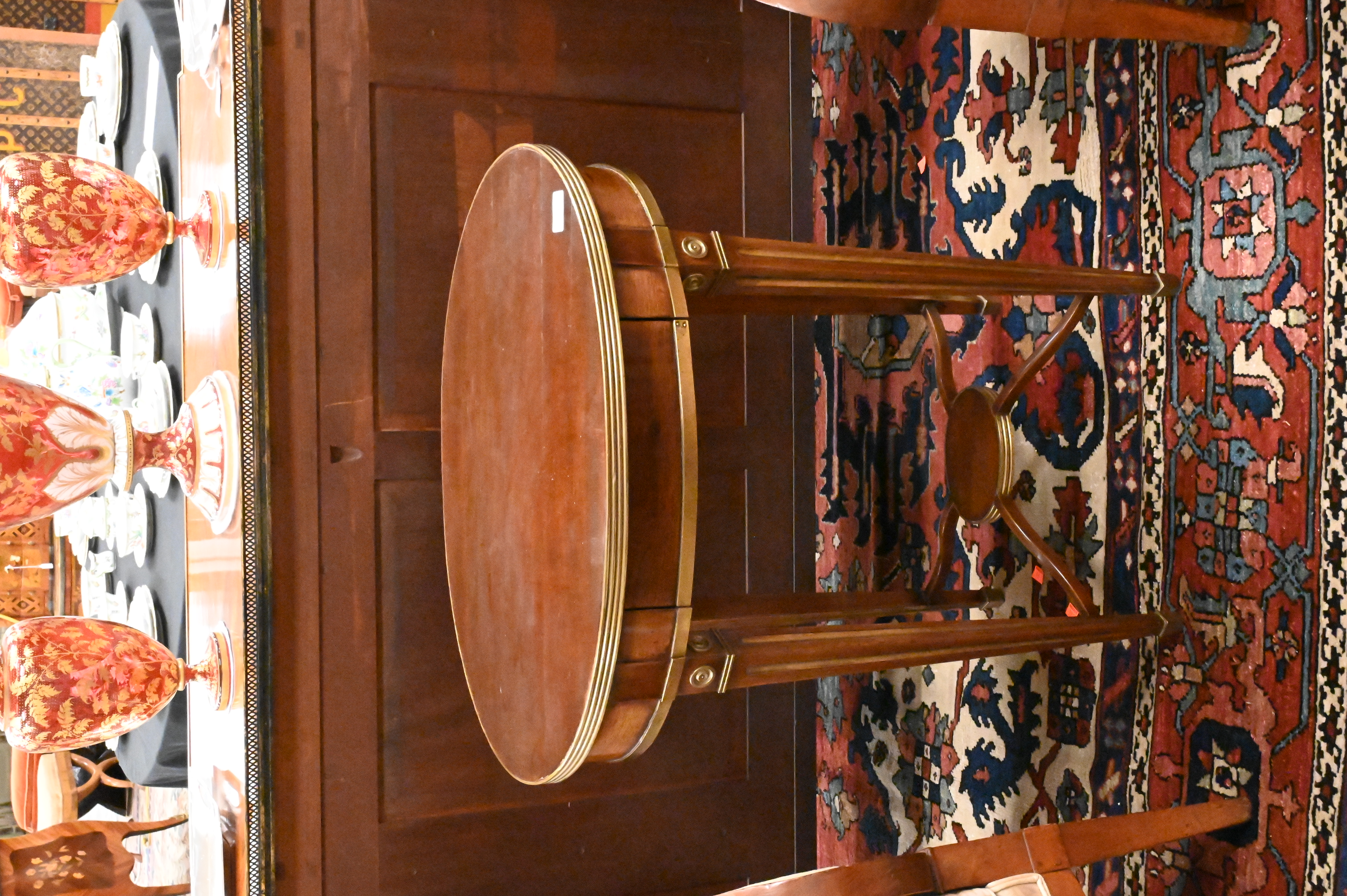 Condition: presents well, age cracks to top, brass bands have been reapplied in some areas, uneven finish to skirt, minor dings to legs