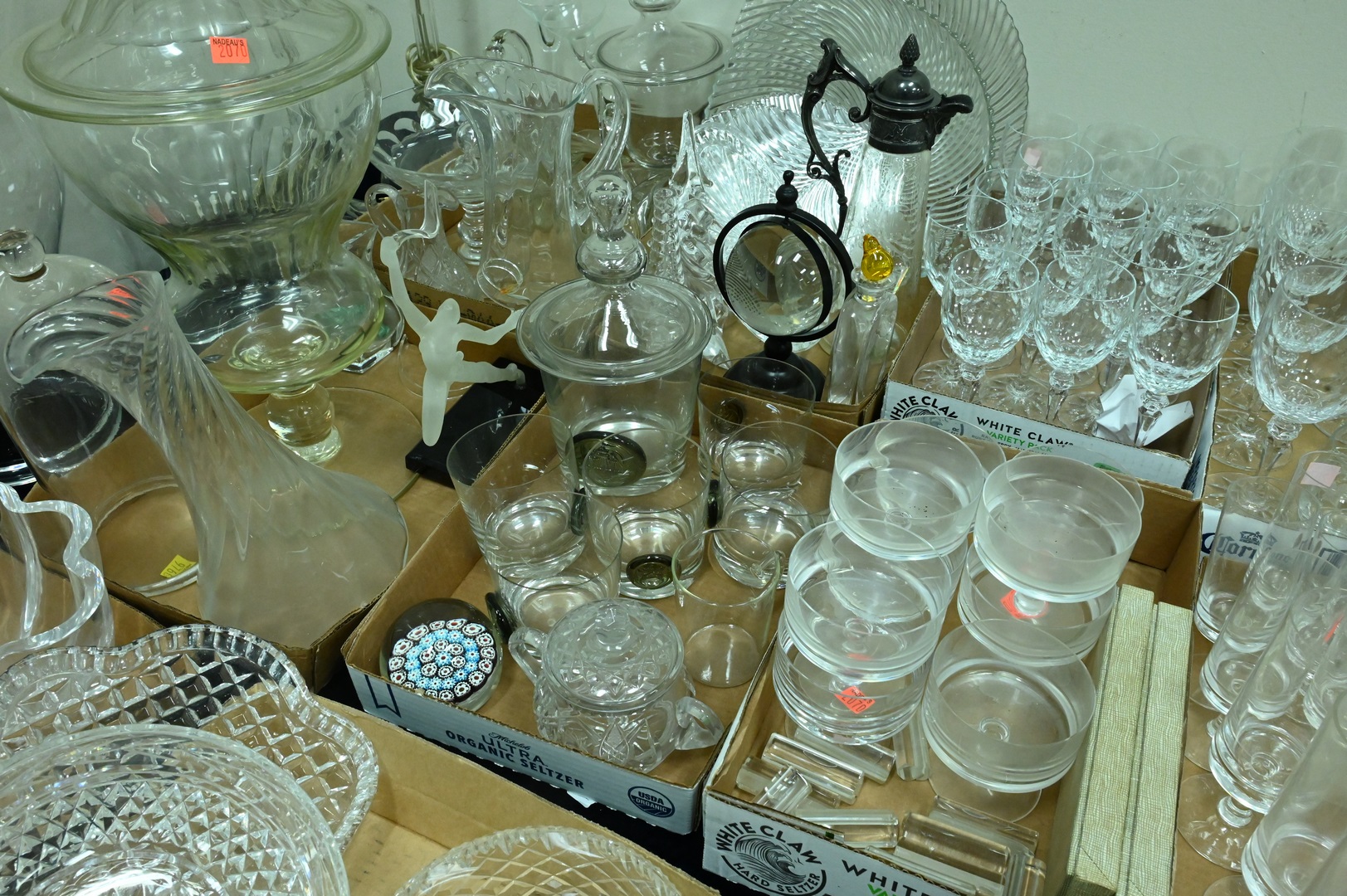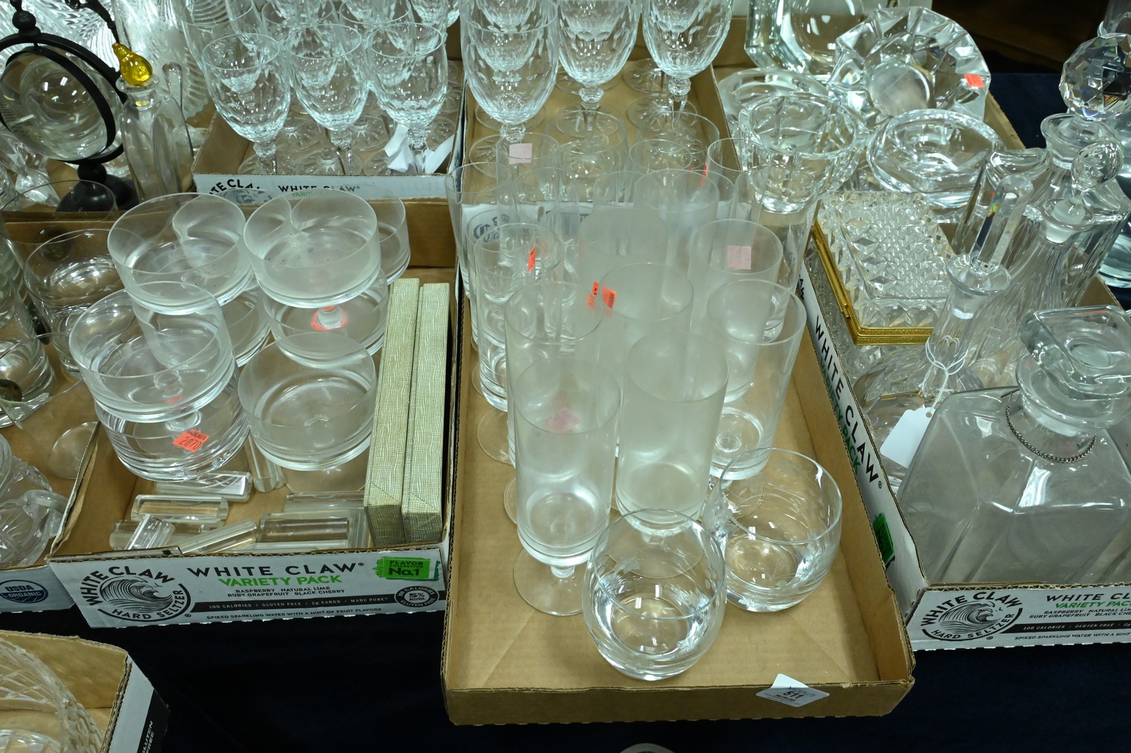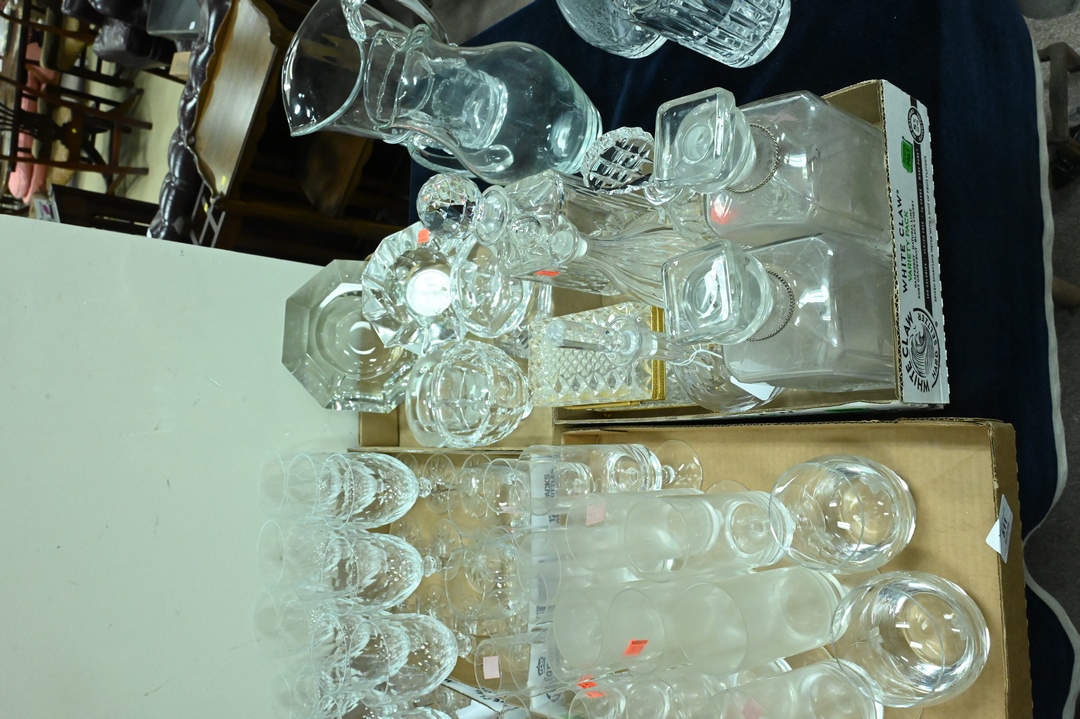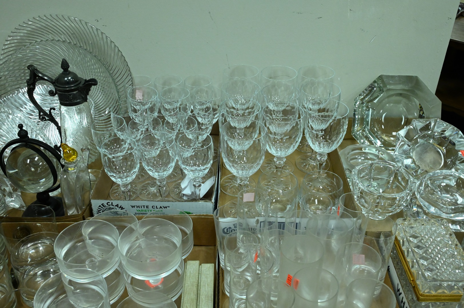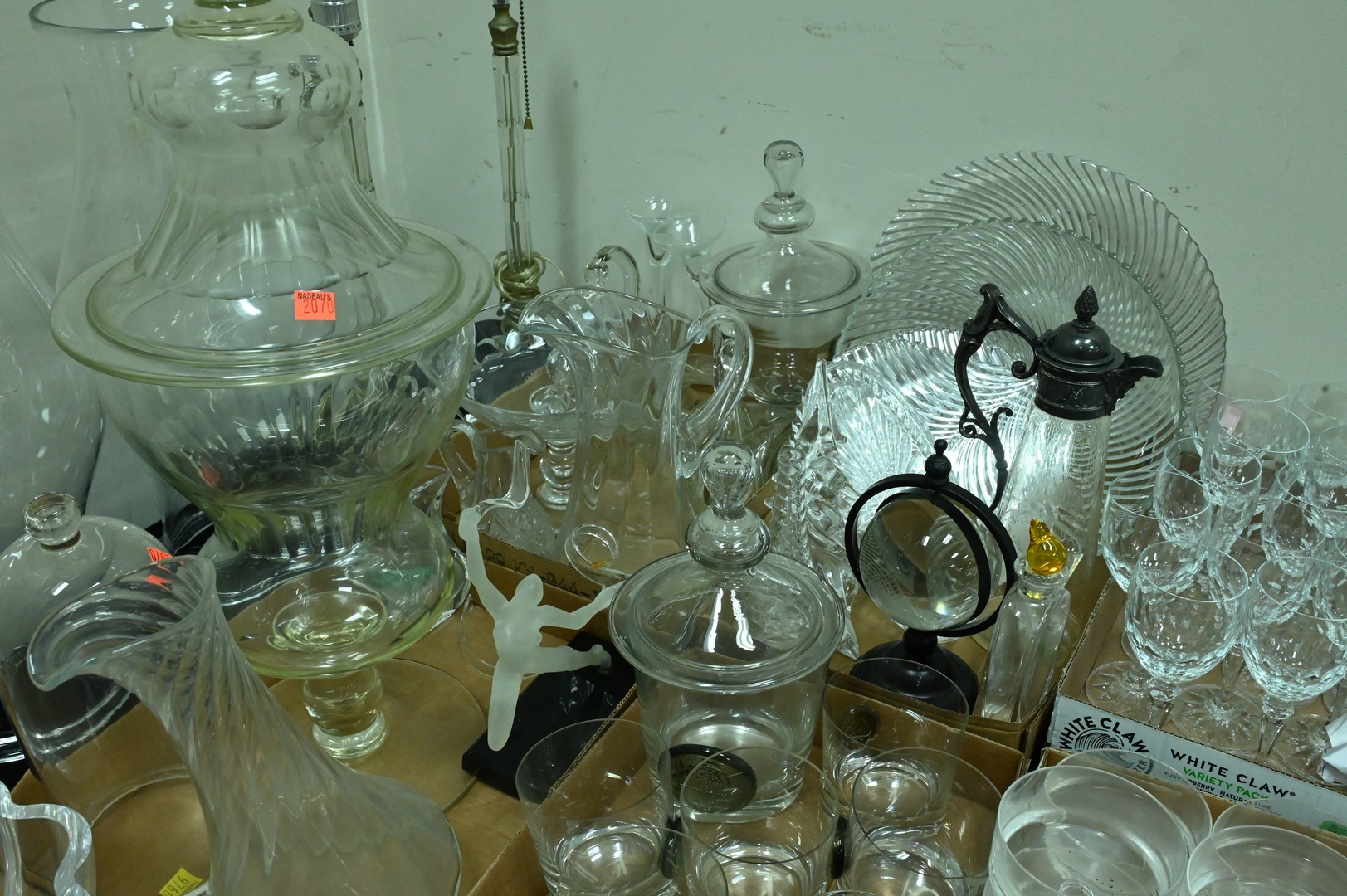 Table Lot of Glass and Crystal, to include stemware, pitchers, urns, bowls, hurricane shades, etc.