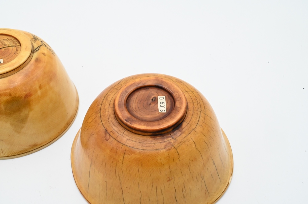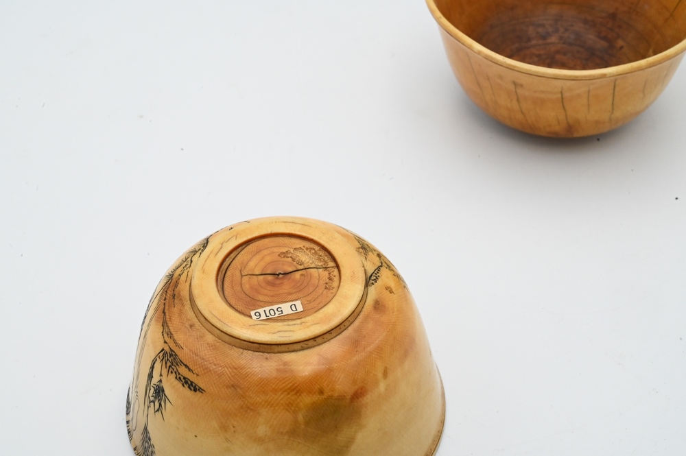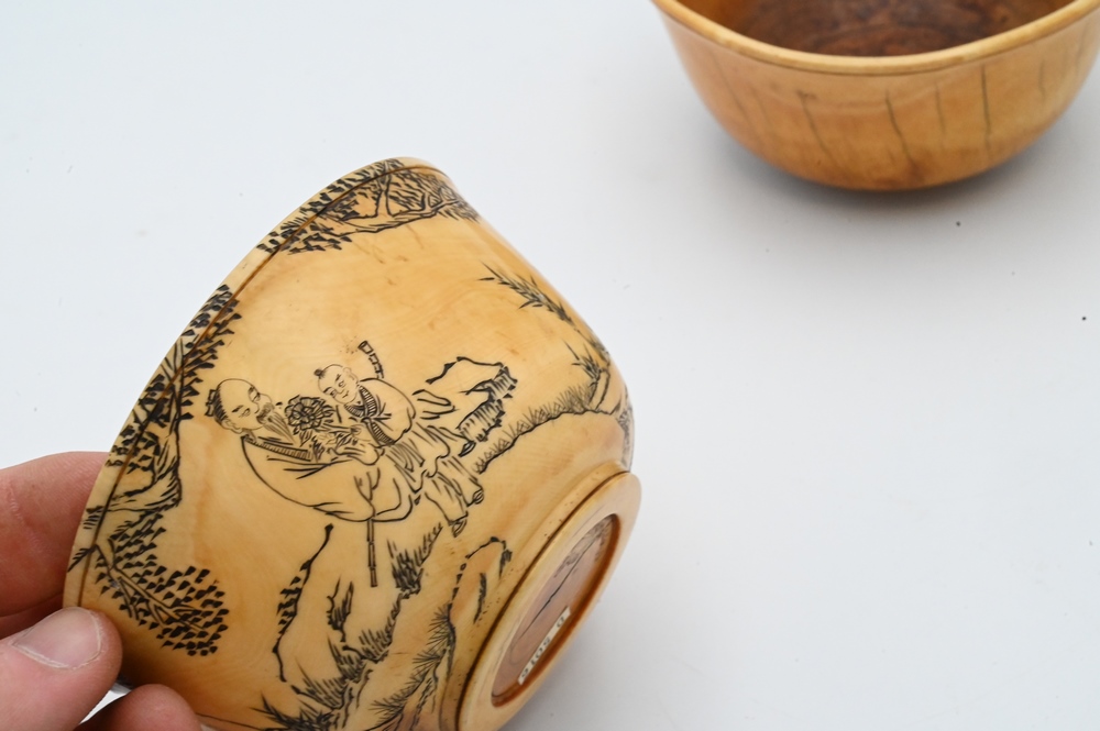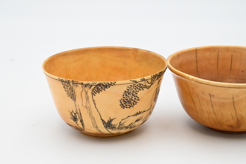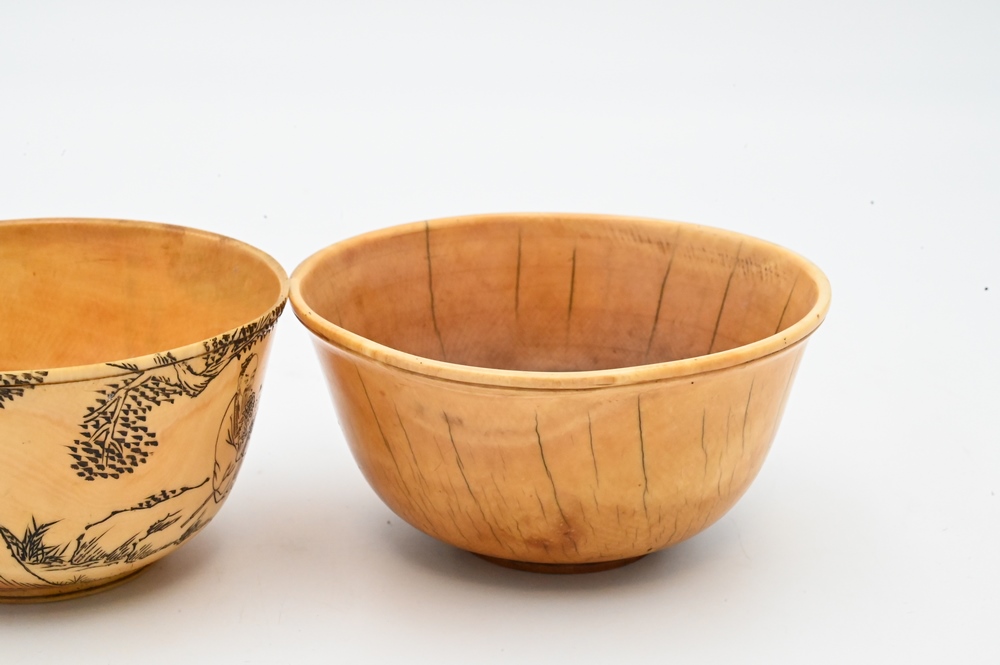 Two Carved Ivory Bowls, to include one having etched scene with figures, 19th century or earlier, height 2 1/4 inches. Please note: Items containing ivory cannot be purchased or shipped by bidders residing outside of the United States or California, Hawaii, Nevada, New Jersey, New York, Washington, Oregon, or District of Columbia. If an ivory item is purchased by a bidder in one of the above mentioned locations or attempts to ship ivory to one of the above mentioned locations, bidder will forfeit the item and be responsible for any incurred fees such as a restocking fee.