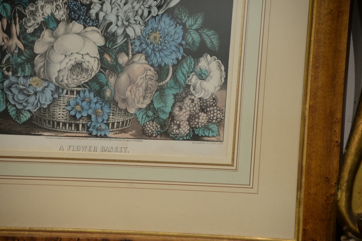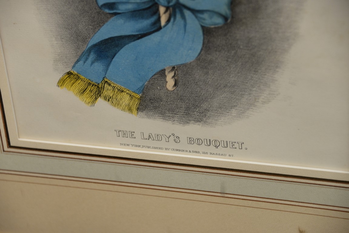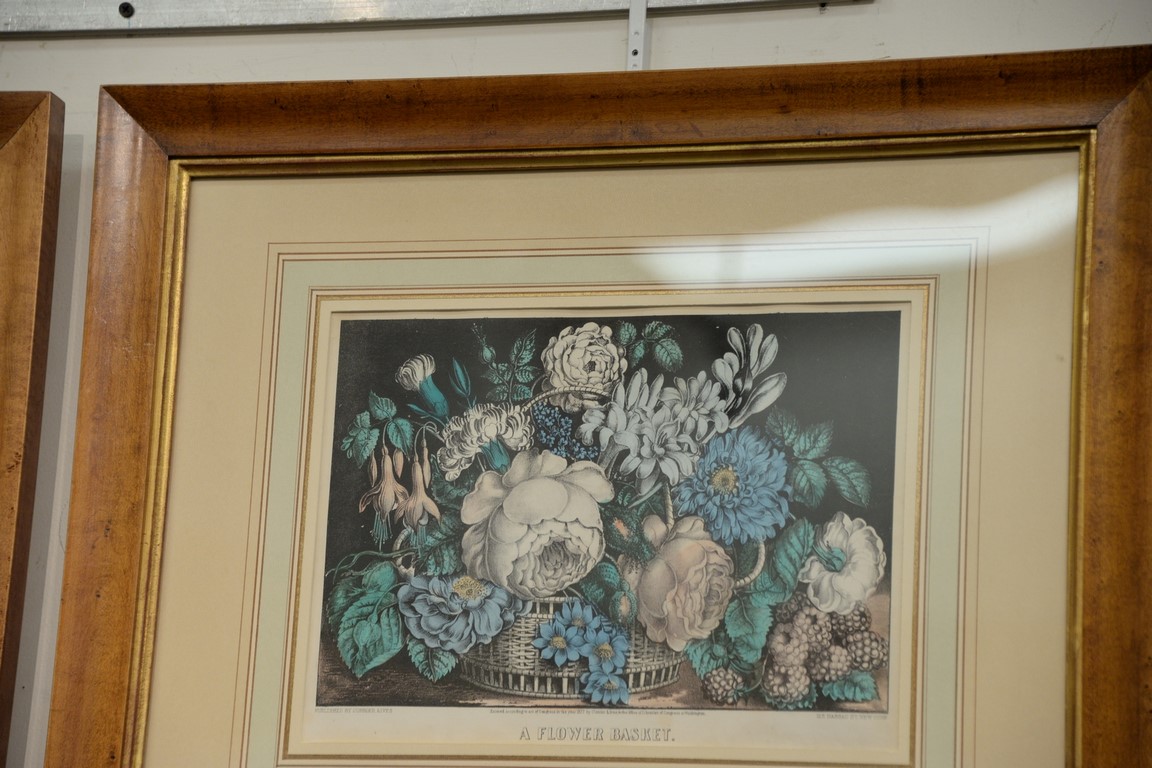 Currier & Ives, set of three colored lithographs, A Wreath of Flowers sight size 14 1/4 x 10 1/2, The Lady’s Bouquet sight size 13 3/4 x 9 1/2, A Flower Basket sight size 9 1/2 x 13, all framed and matted in birdseye maple frames by Wesley Allen Framemakers Provenance: Property from Credit Suisse’s Americana Collection