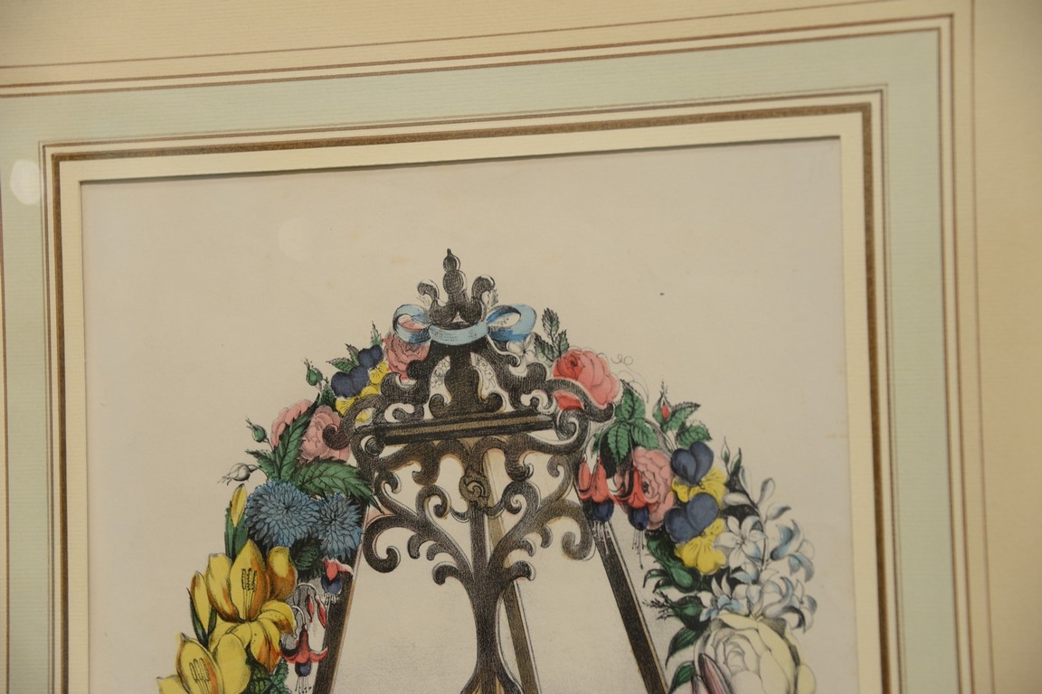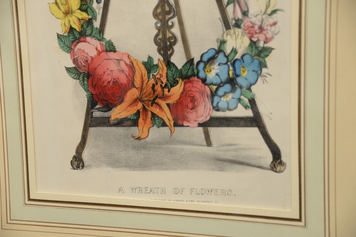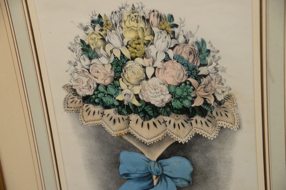 Lot 512: Currier & Ives, set of three colored lithographs, A Wreath of Flowers sight size 14 1/4 x 10 1/2, The Lady’s Bouquet sight size 13…