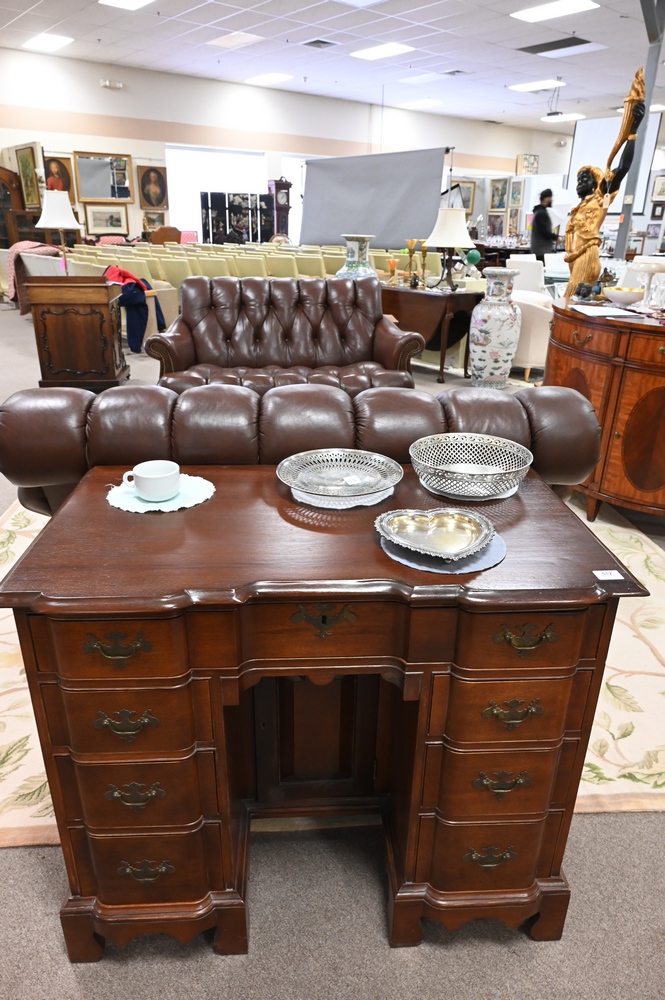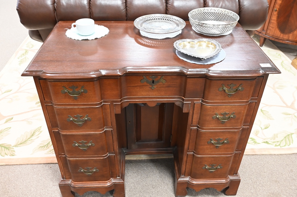 Lot 512: Custom Mahogany Benchmade Chippendale Style Blockfront Kneehole Desk, height 31 inches, top 21″ x 37 1/2″.