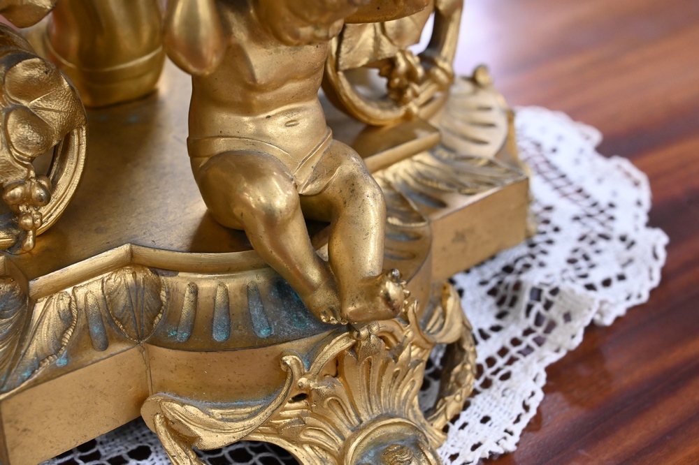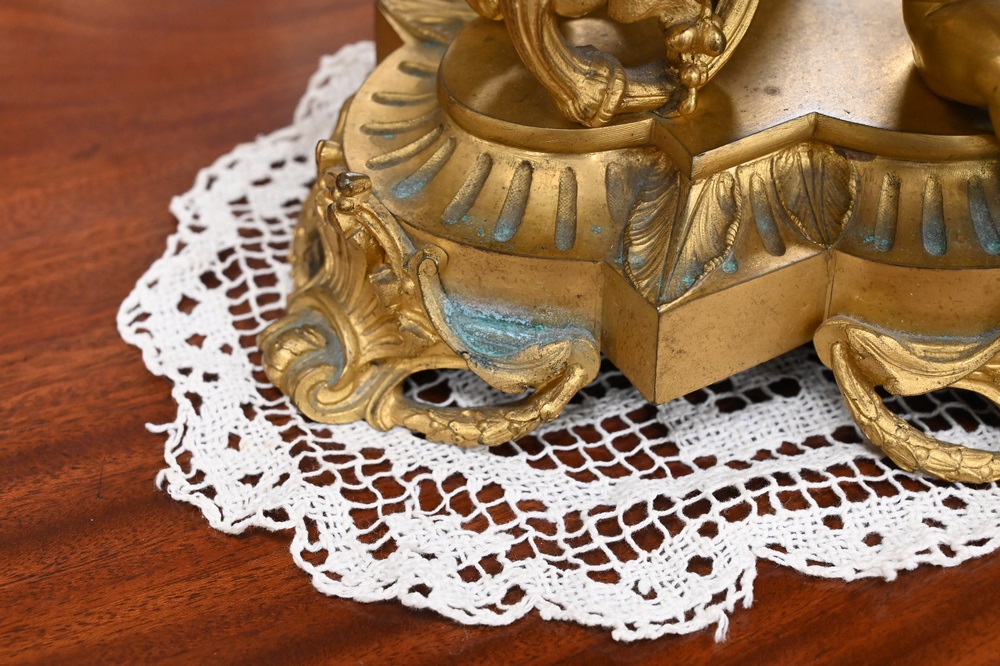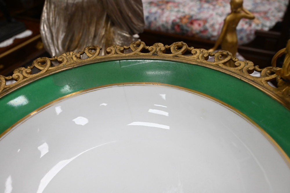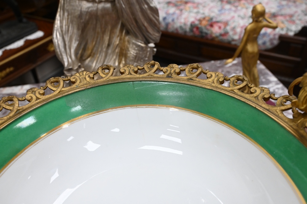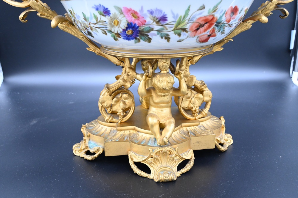 Large French Porcelain Center Bowl, having ormolu bronze scrolling handle on figural base, modeled as two putti figures holding up the bowl, height 14 inches, width 19 inches, (repaired bowl).