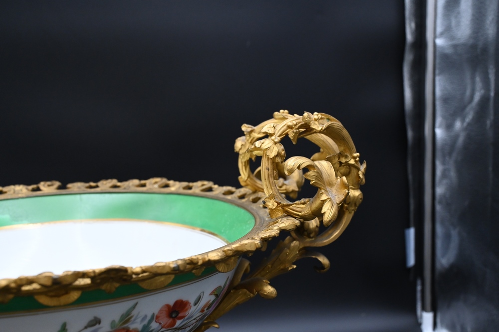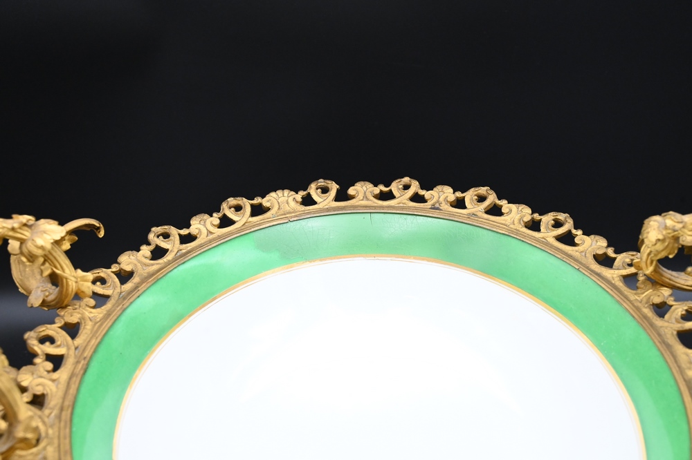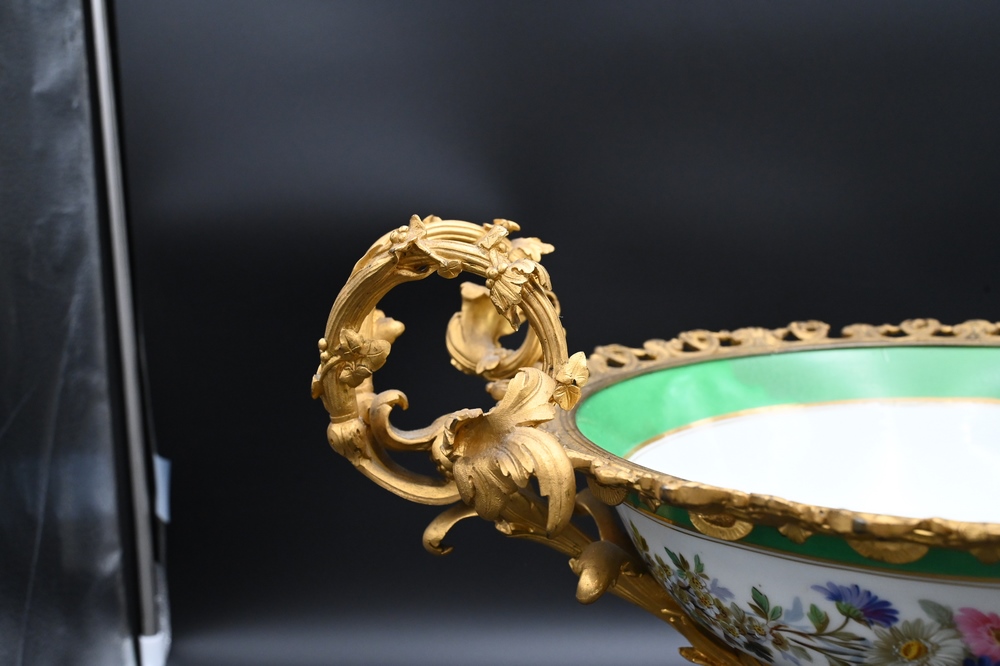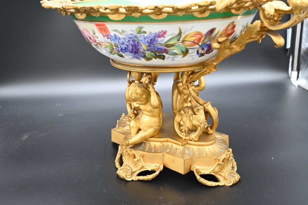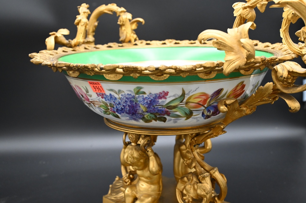 Lot 512: Large French Porcelain Center Bowl, having ormolu bronze scrolling handle on figural base, modeled as two putti figures holding up t…