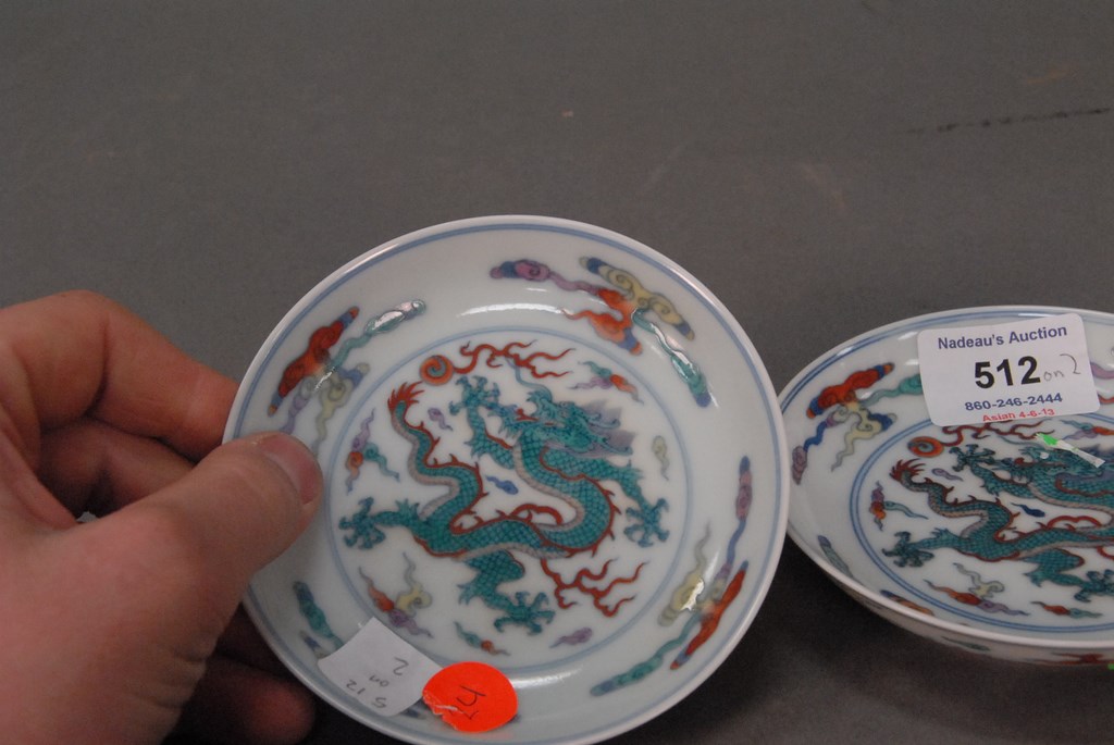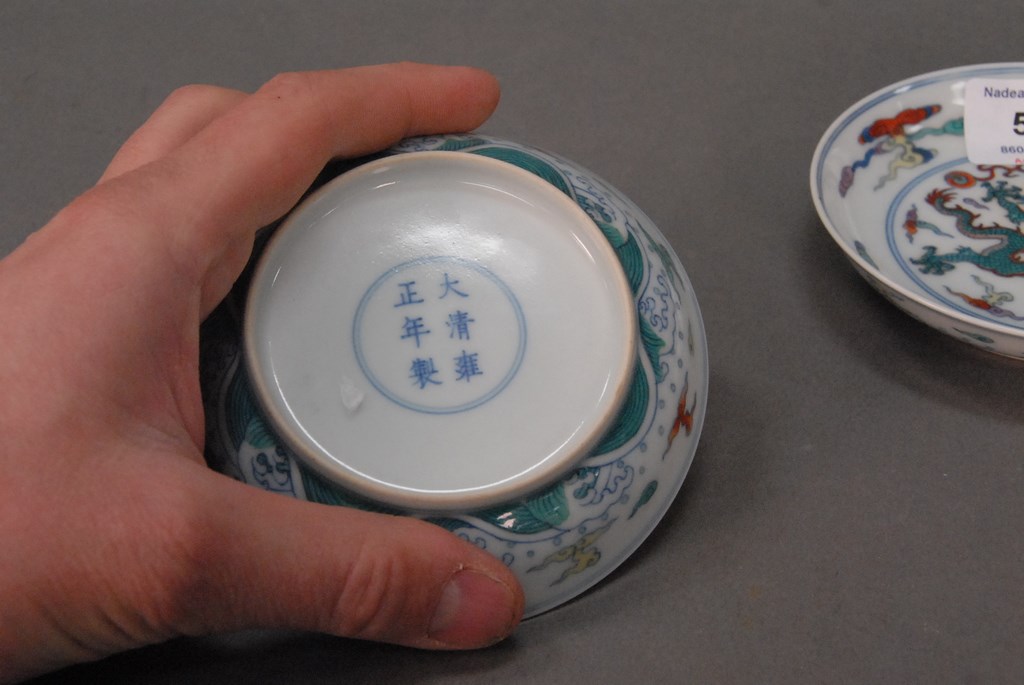 Pair of five claw dragon saucers with Yong-Cheng mark on bottom.