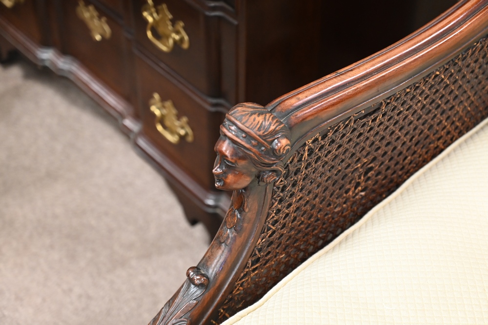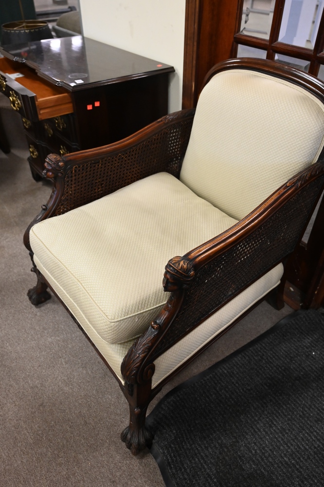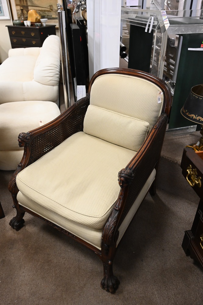Lot 512: Pair of Mahogany Armchairs, having upholstered seat and back, caned sides, female head hand rests set on hairy paw feet (caning imperfections), height 35 1/2 inches, width 29 inches.