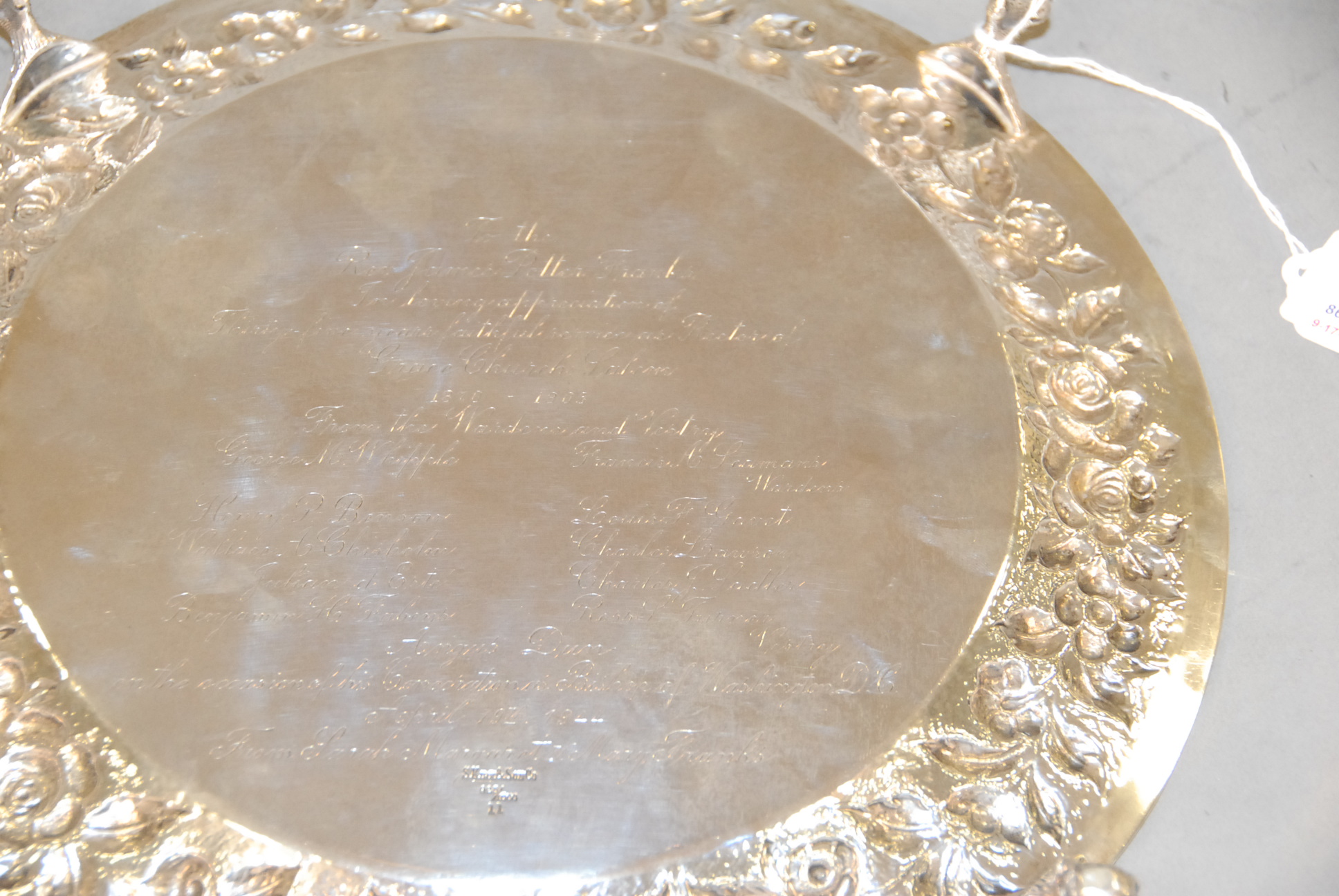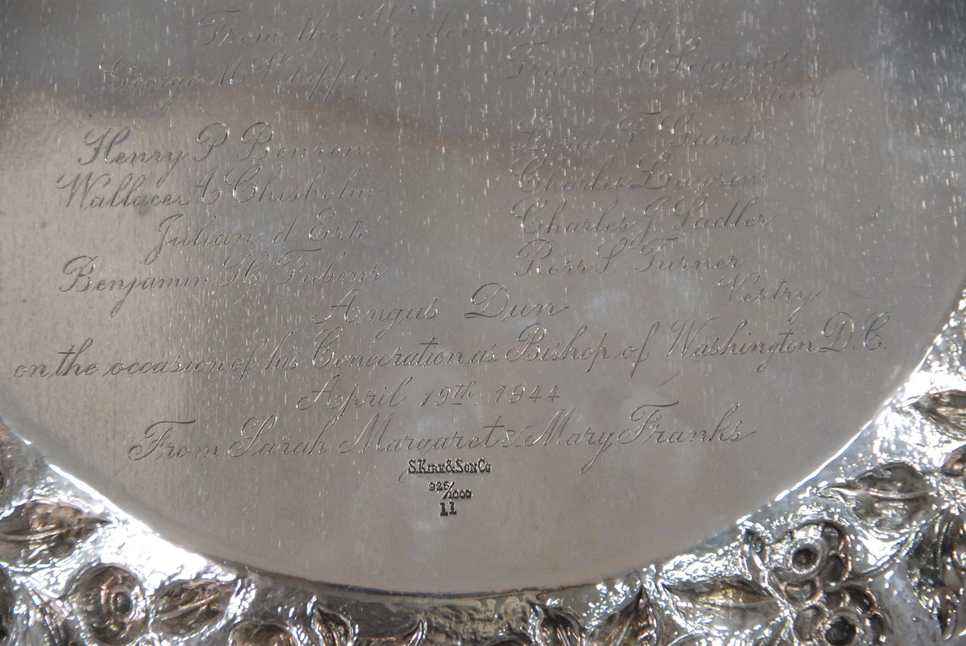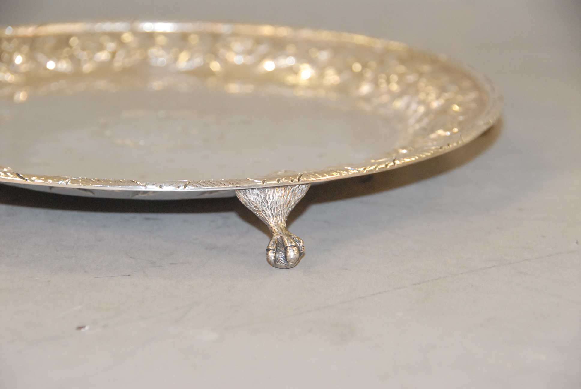 S. Kirk & Sons sterling silver round tray on ball and claw feet with repousse border, monogrammed.