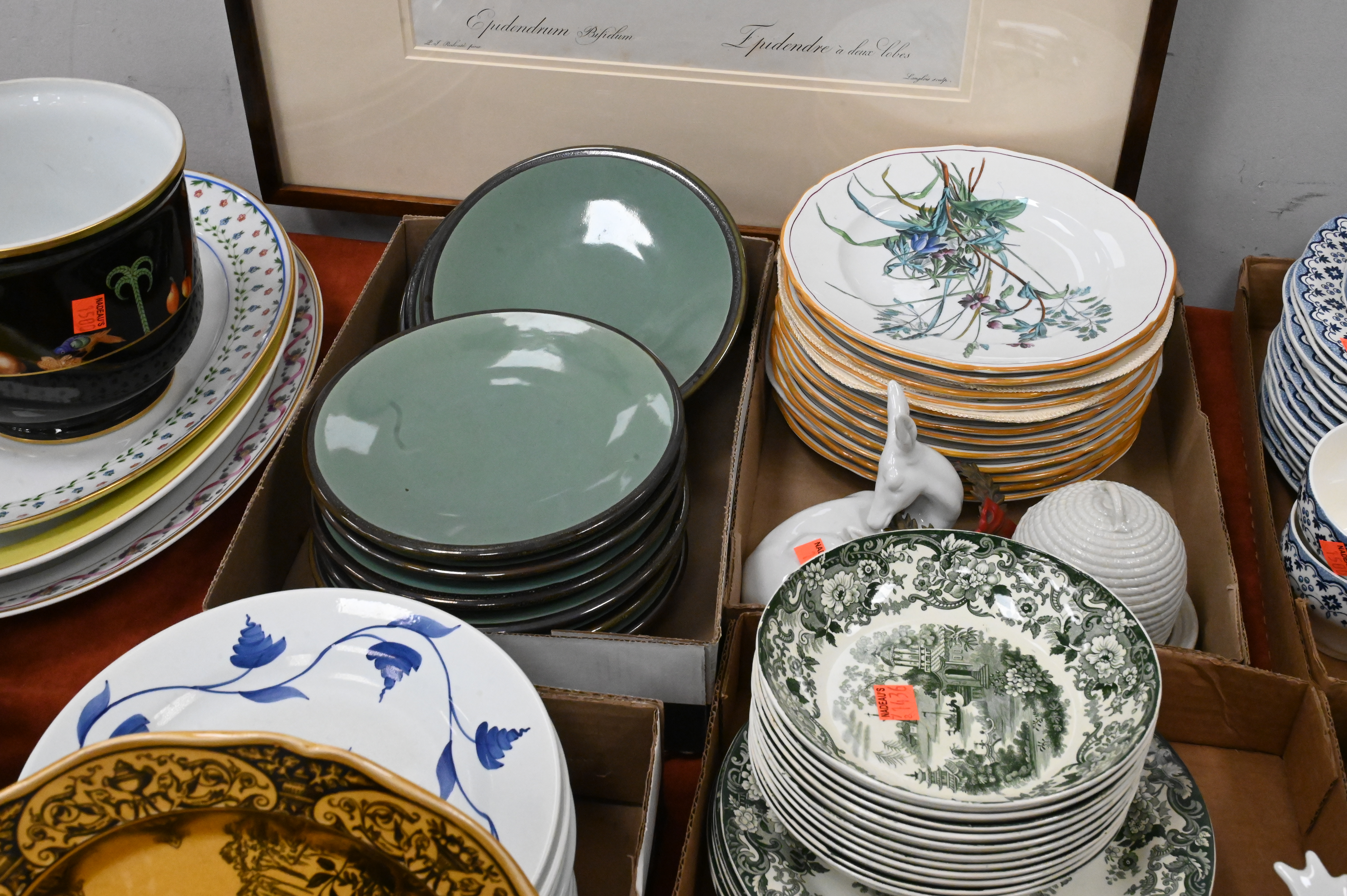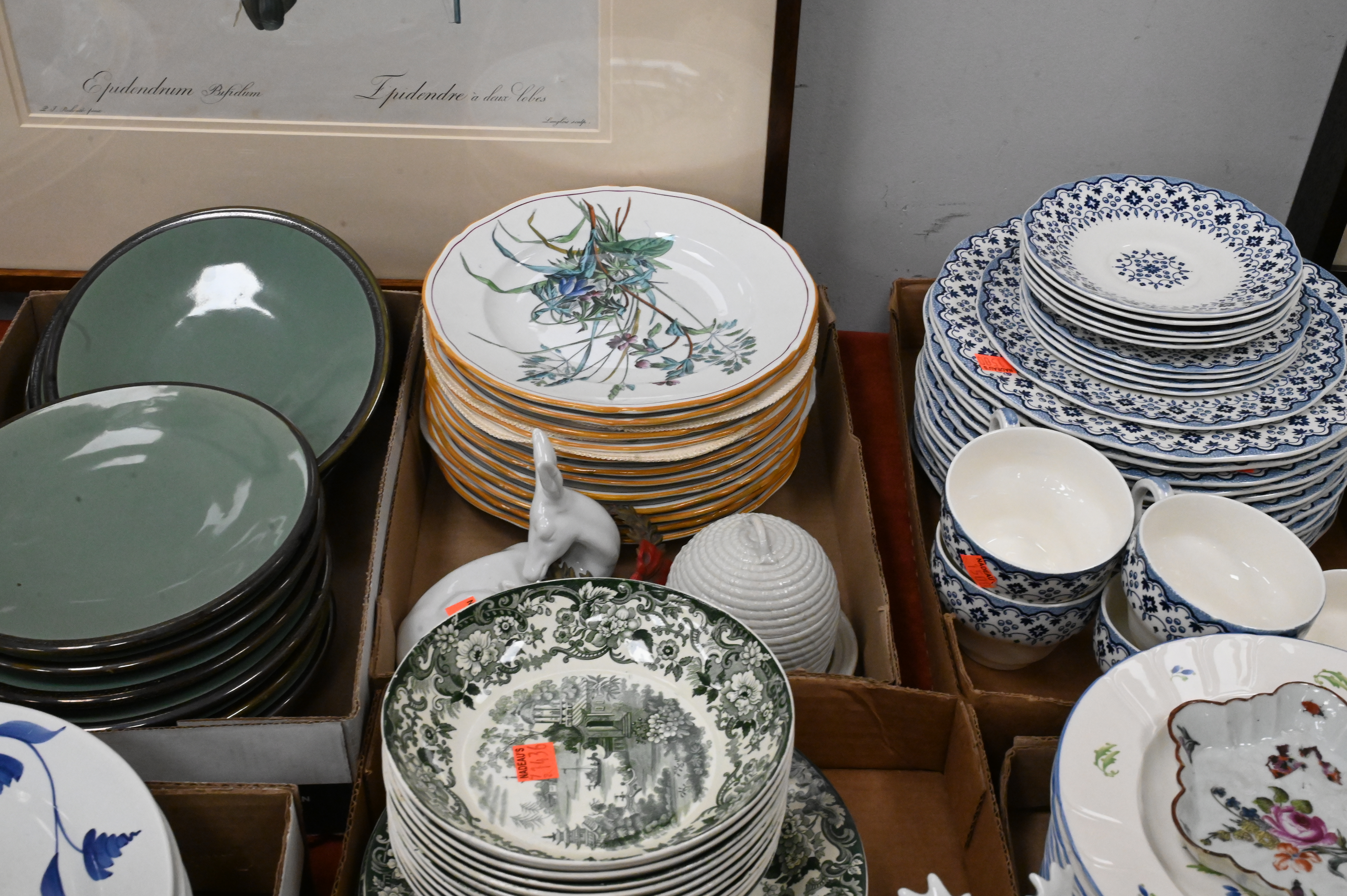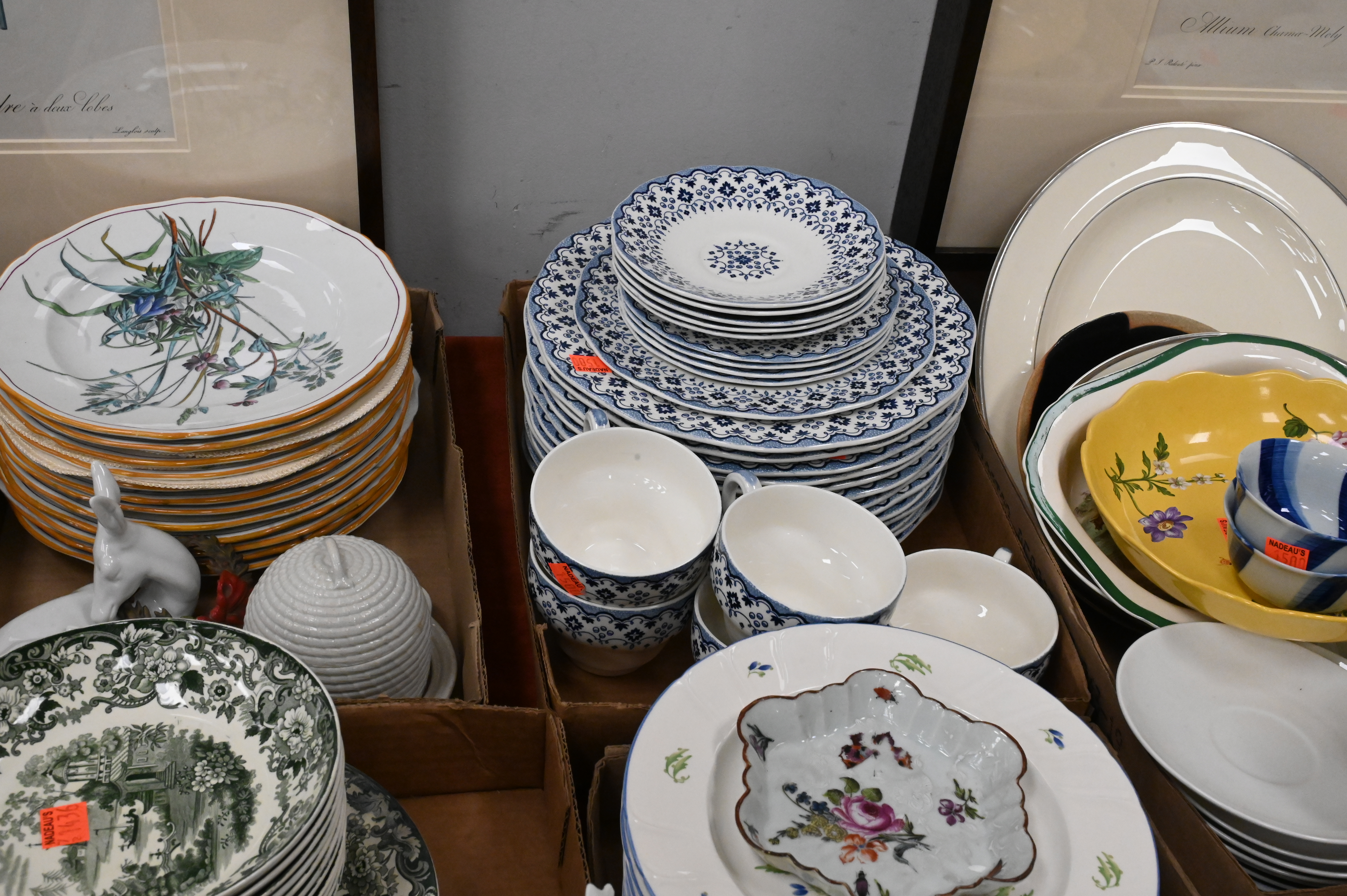 Seven Tray Lots of Assorted Porcelain and China, to include a set of six porcelain De Choisy plates, Wedgwood rabbit plate, along with miscellaneous porcelain and china.