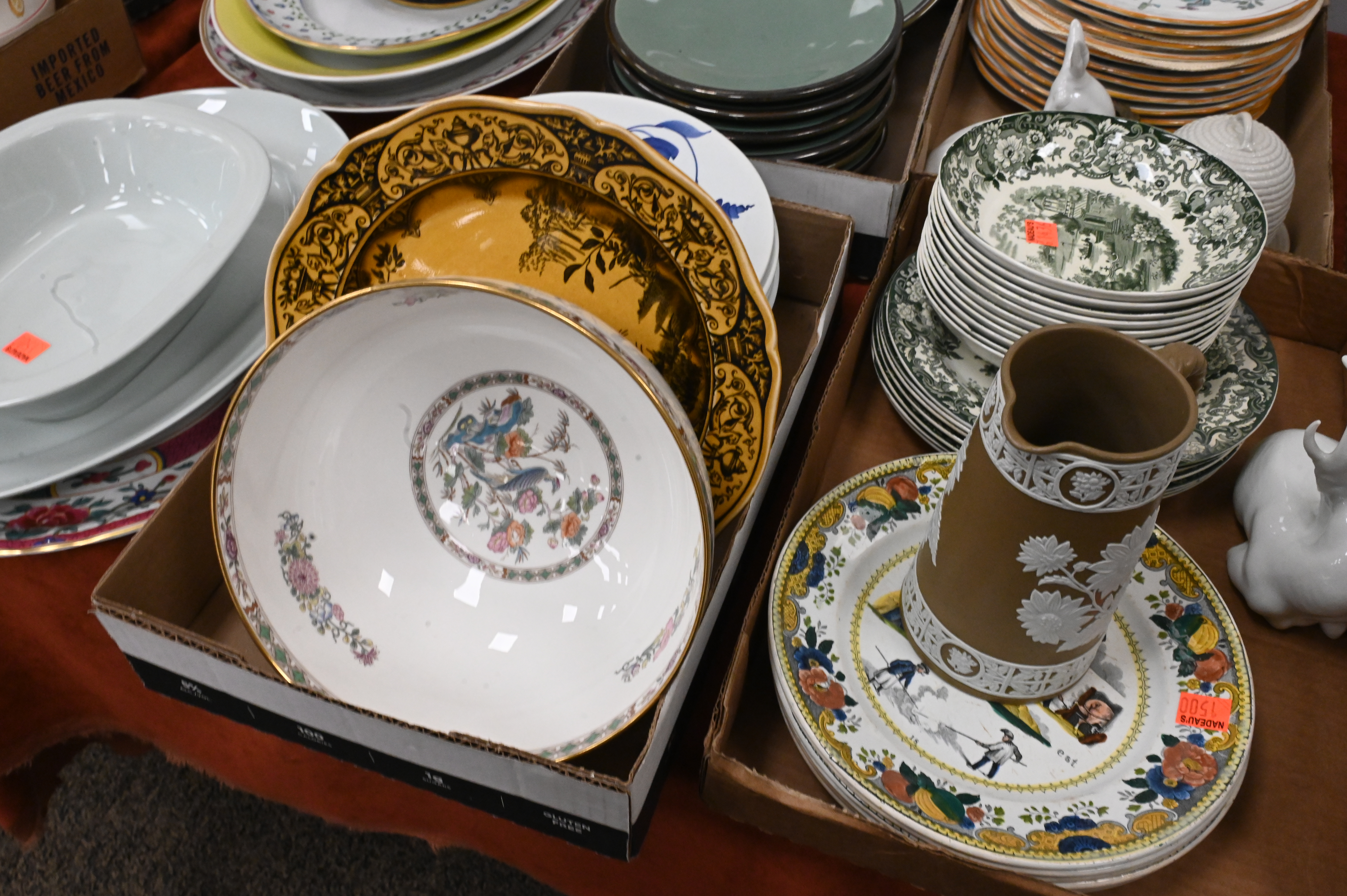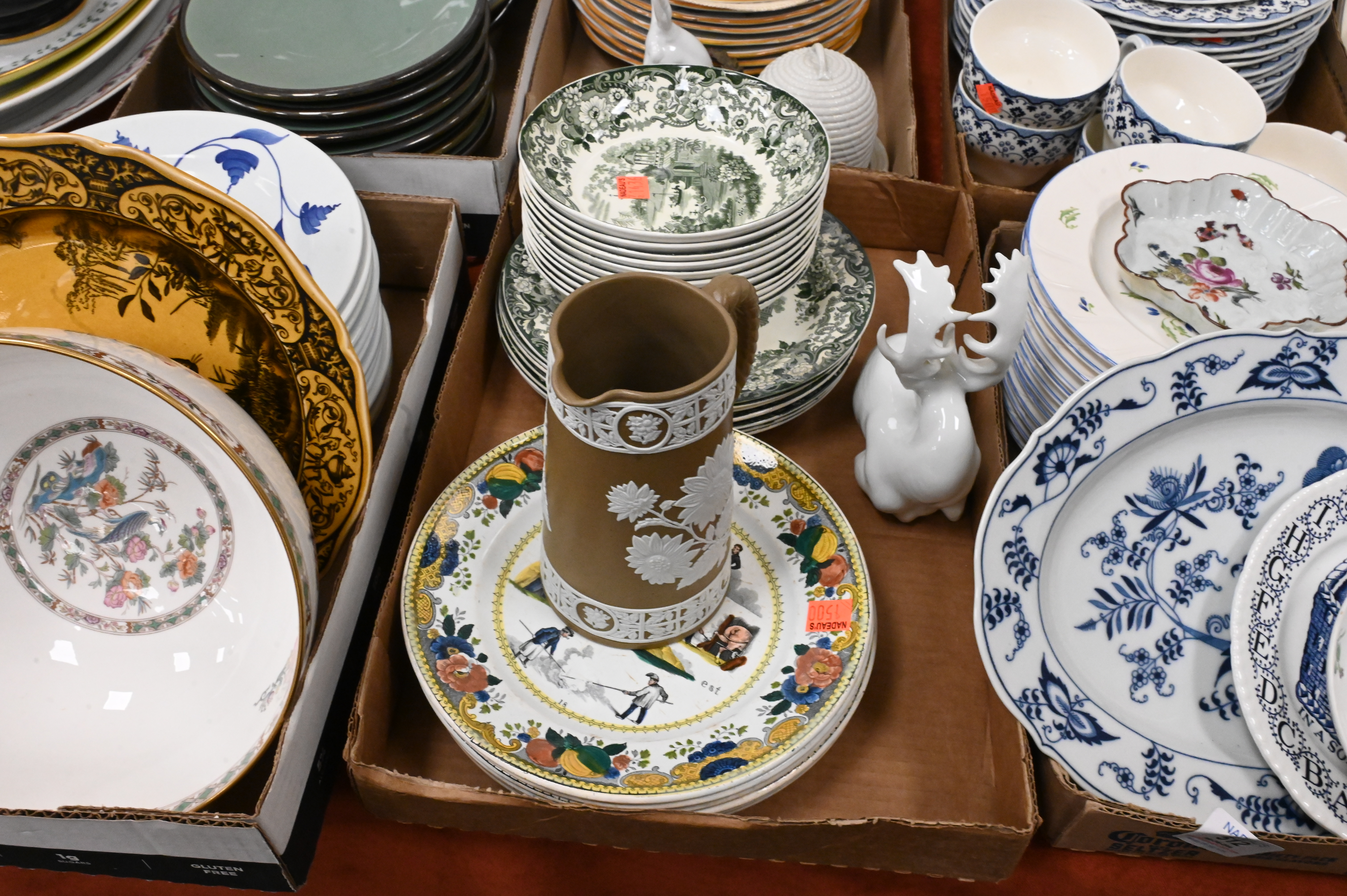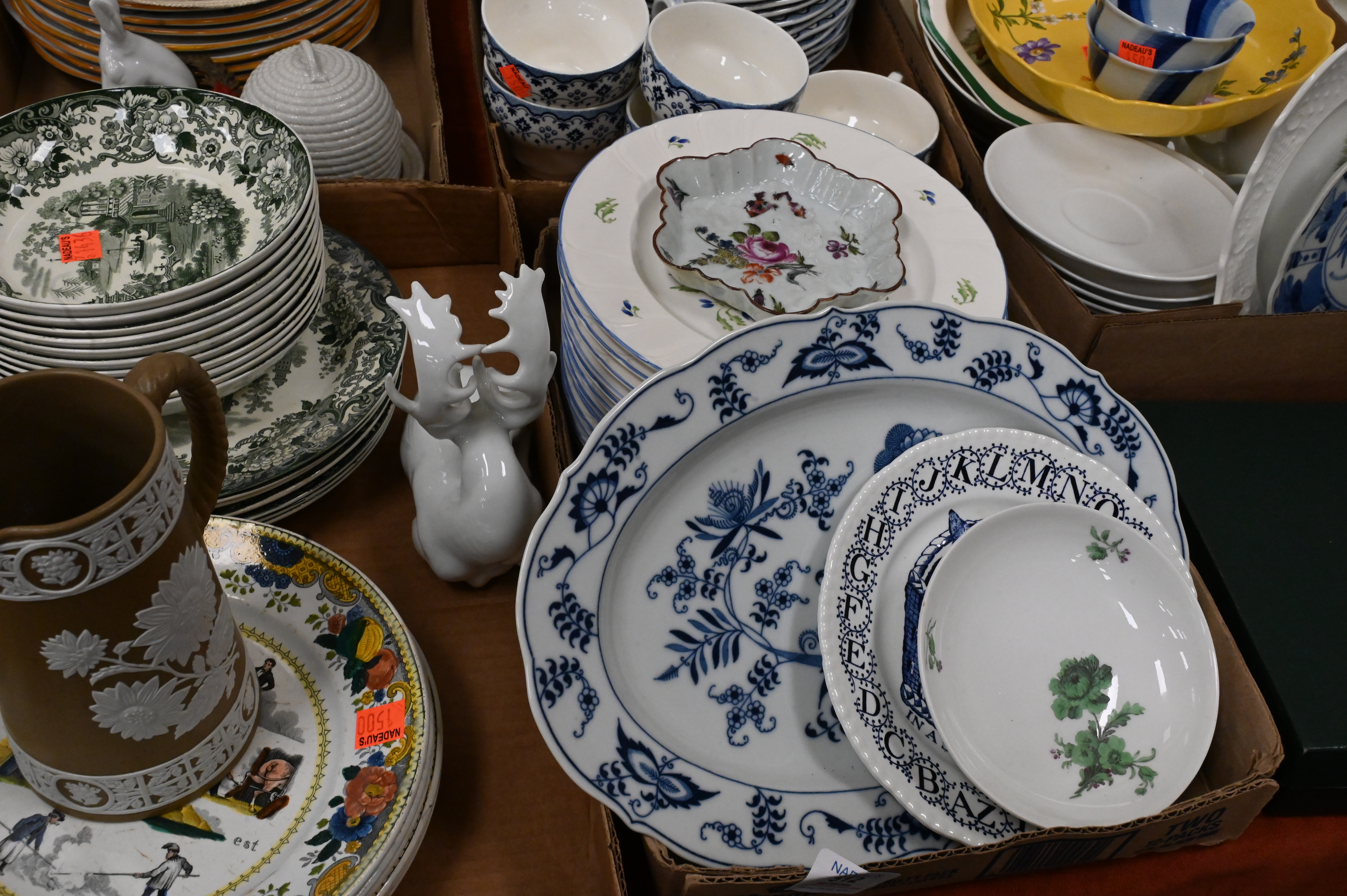 Seven Tray Lots of Assorted Porcelain and China, to include a set of six porcelain De Choisy plates, Wedgwood rabbit plate, along with miscellaneous porcelain and china.