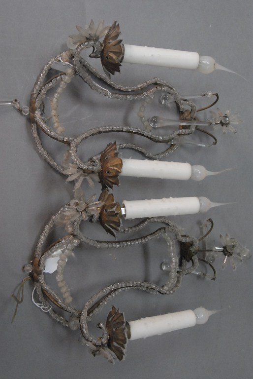 Lot 512: Three piece lot hanging crystal hall lite and pair metal and glass sconces. Provenance: From prominent Woodbridge, Connecticut fa…..