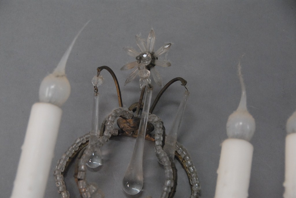 Three piece lot hanging crystal hall lite and pair metal and glass sconces. Provenance: From prominent Woodbridge, Connecticut family collection.