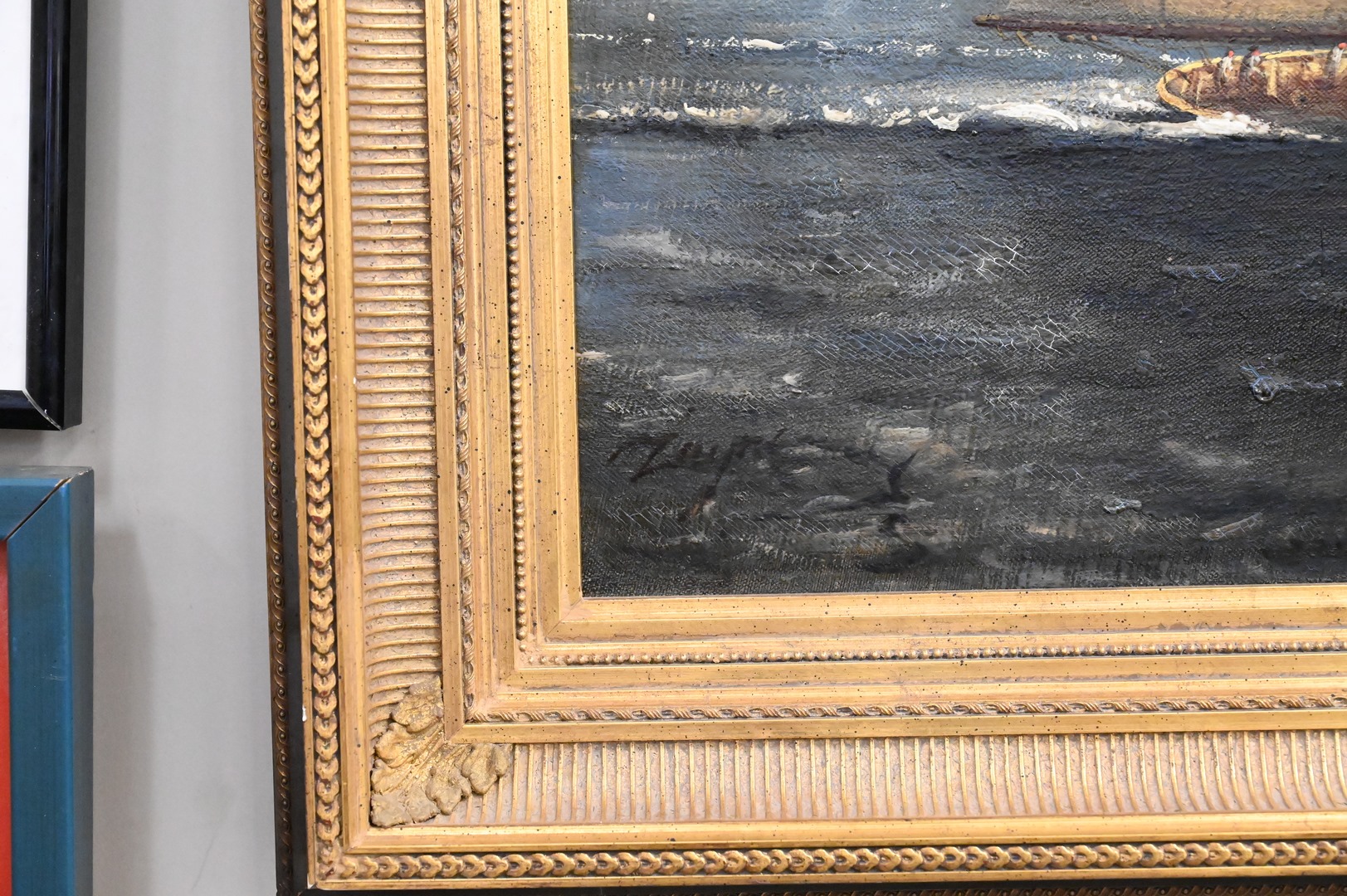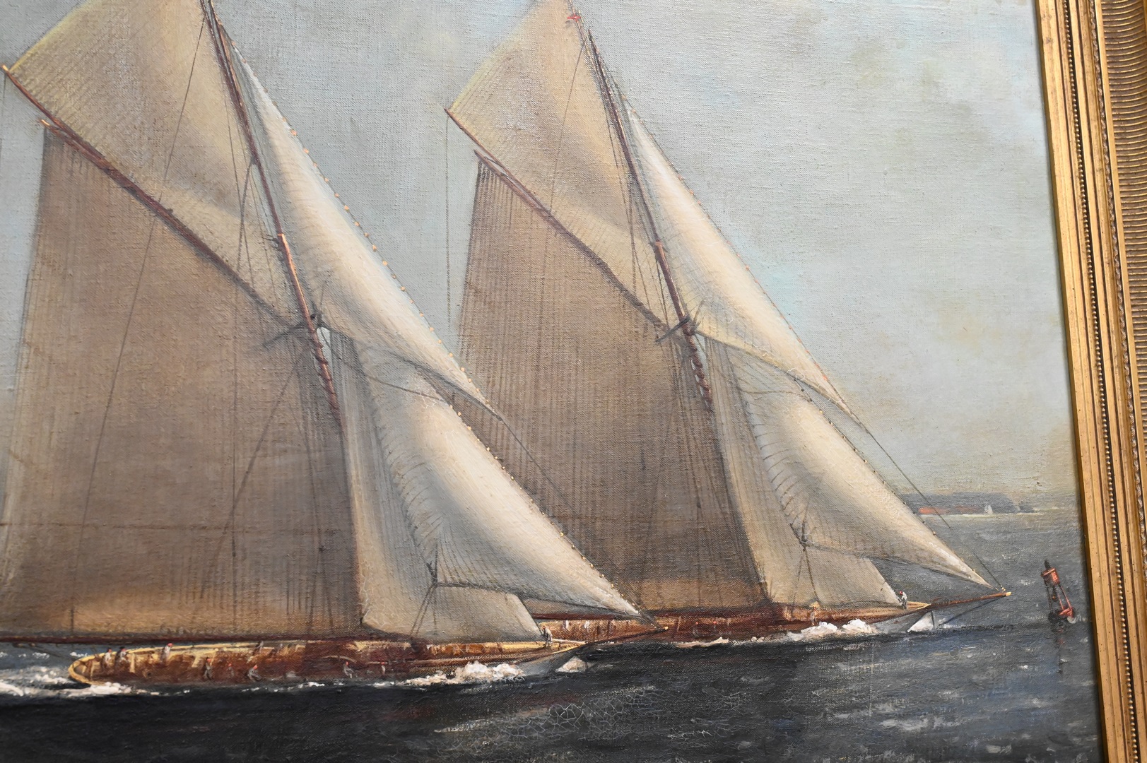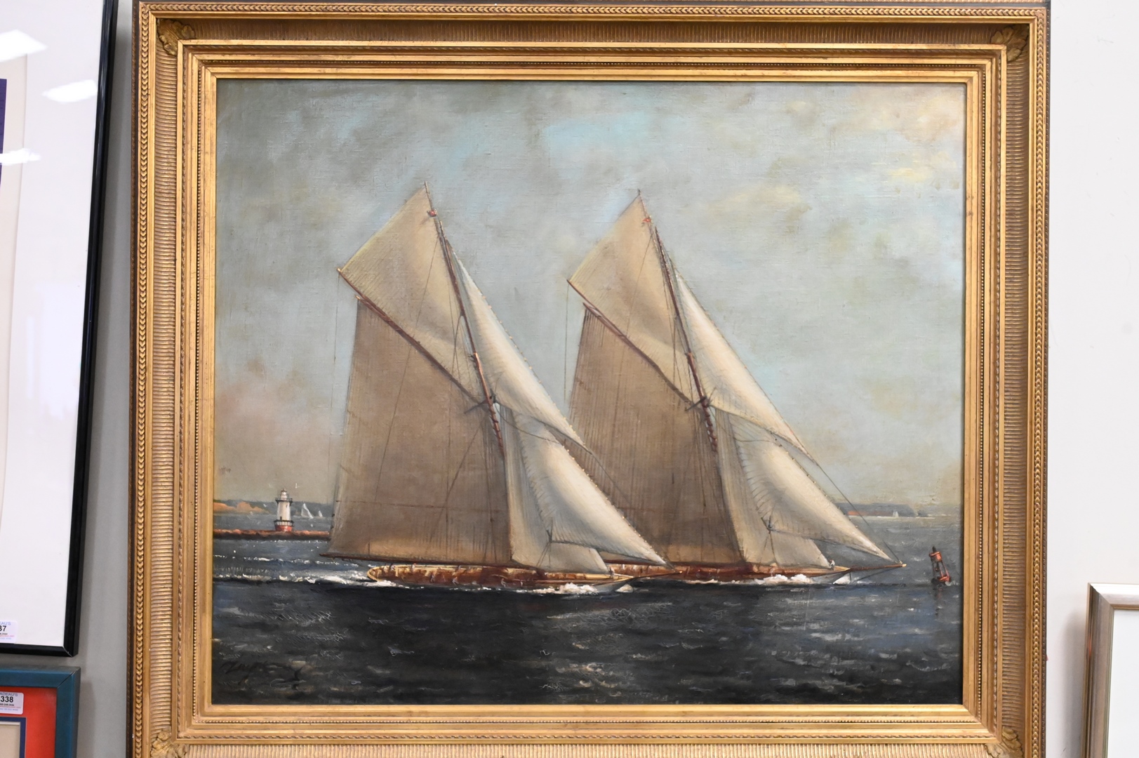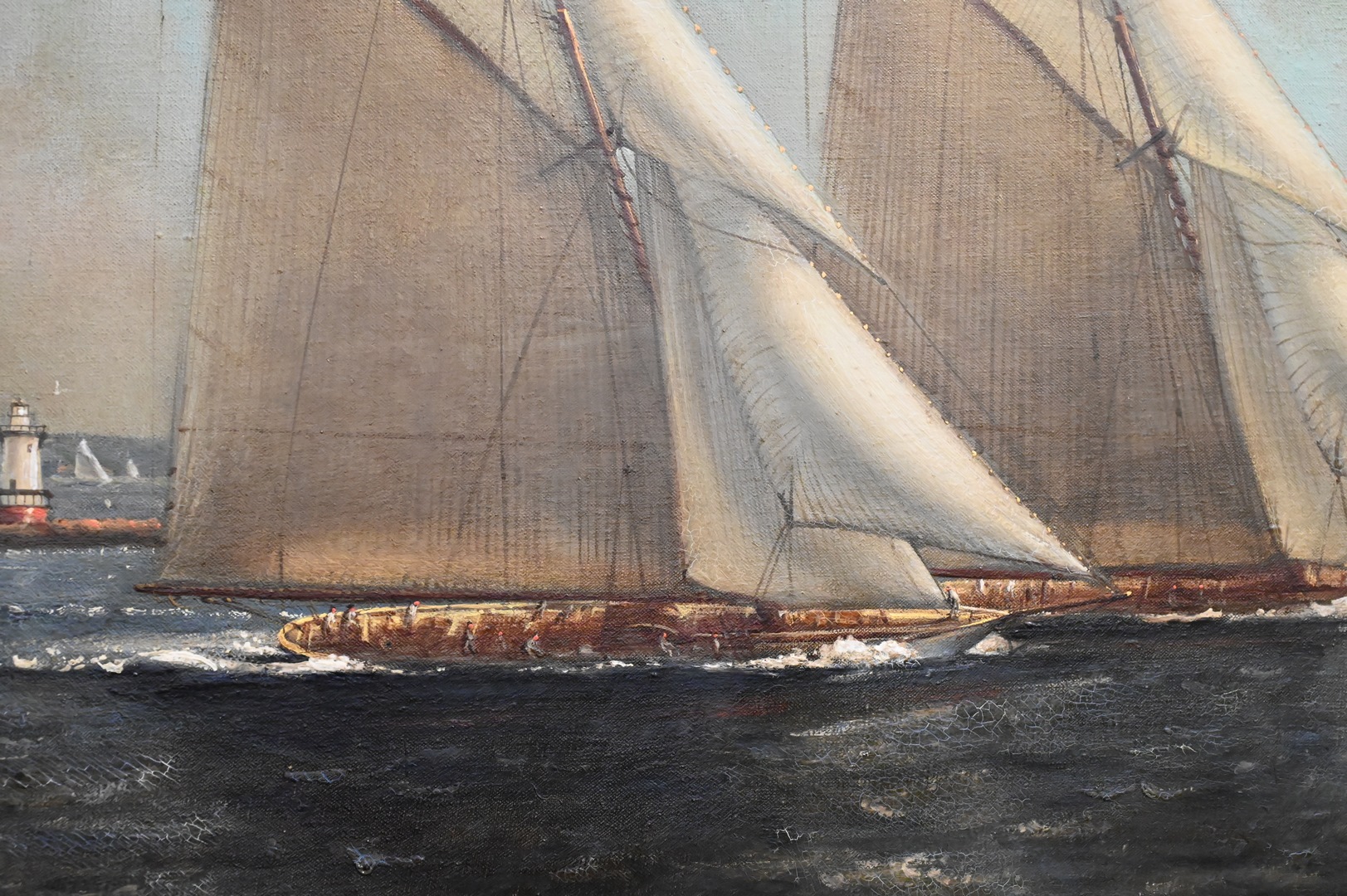 Peter Layne Arguimbau, Yacht Race oil on canvas, signed illegibly lower left, 28 3/4″ x 31 3/4″. Provenance: Waterfront Estate, Stamford, Connecticut.