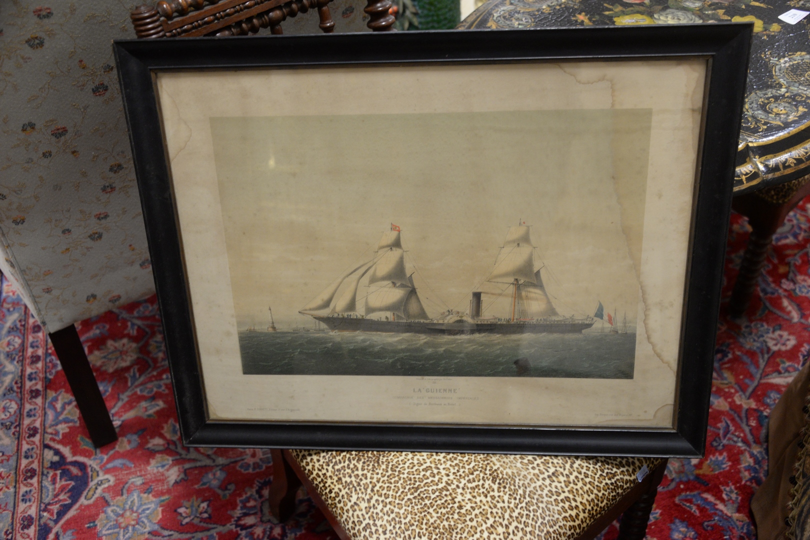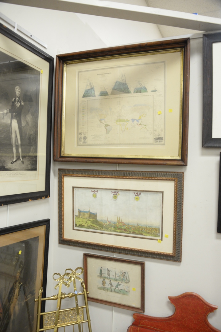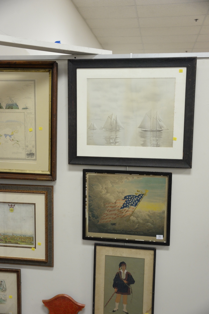 Eight Piece Framed Group, to include two framed maps, a maritime print of sailing ships a John Milton lithograph after an illustration from Paradise Lost La Guienne engraving of a steam ship a lithograph of an American flag along with a print of a French nobleman, largest sight size 19 x 22.