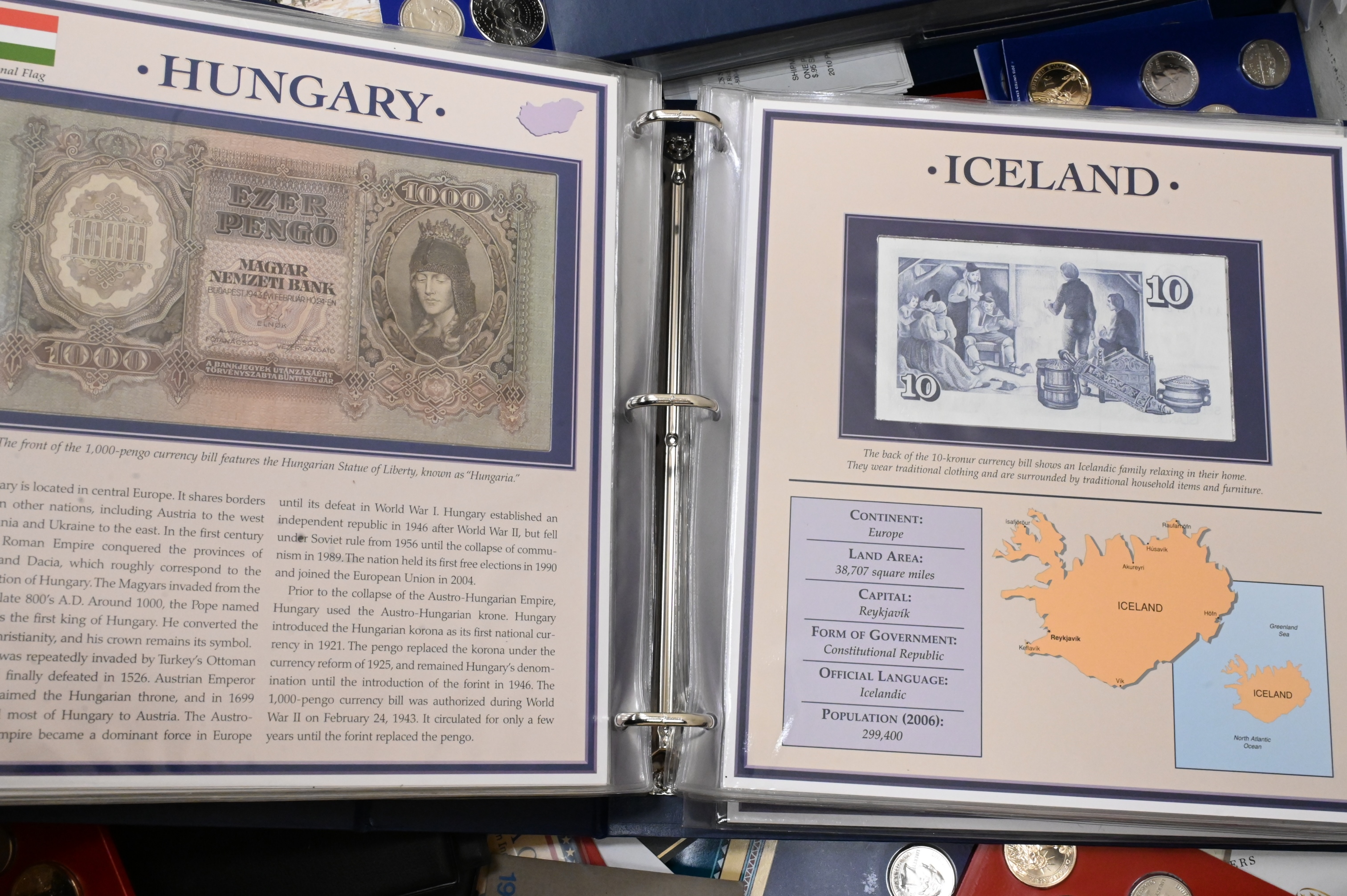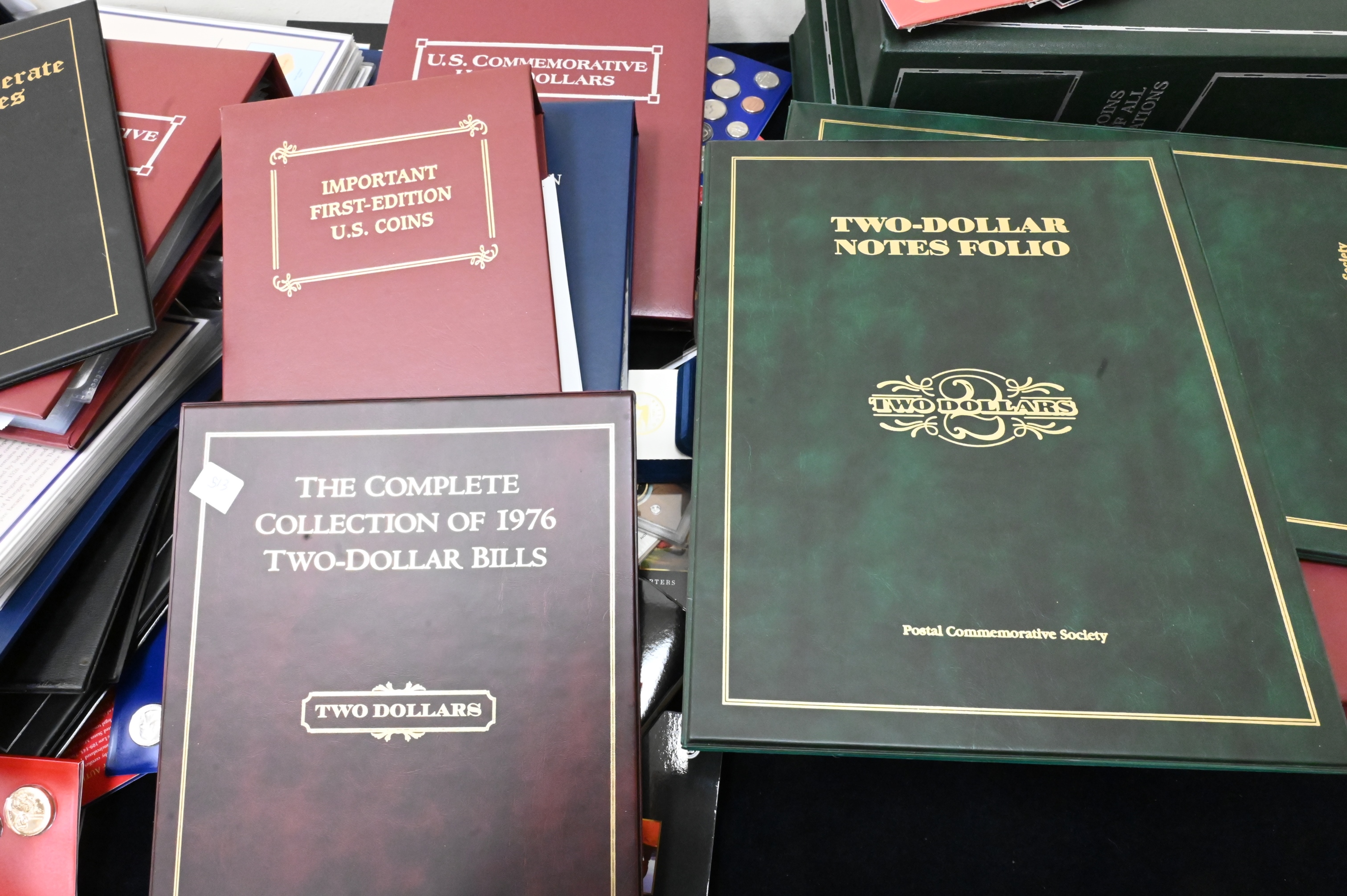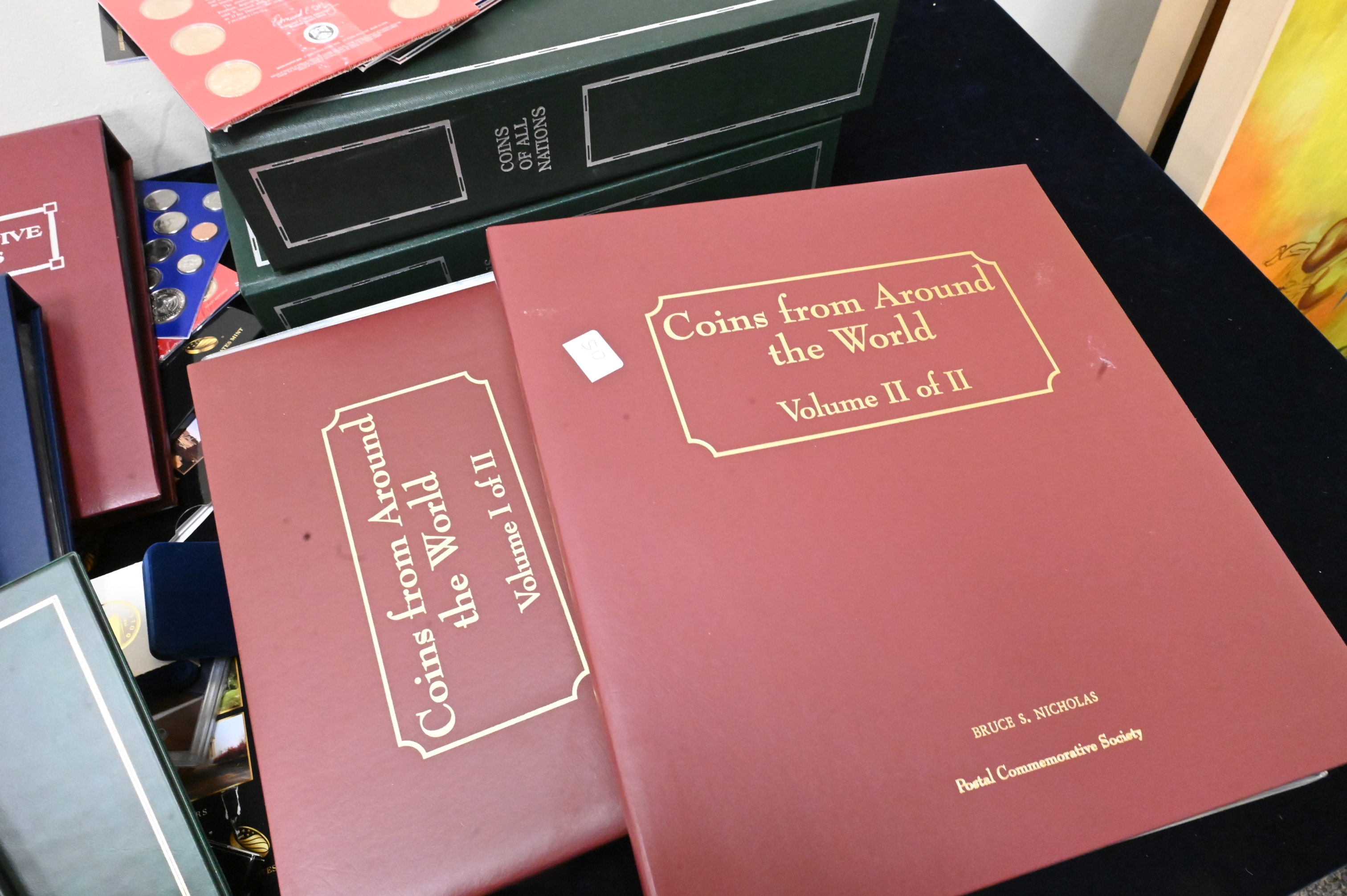 Large Coin Lot, to include uncirculated coin sets, proof Lincoln coins, two binders of modern commemoratives, approximately 6 binders on world coins, sets of $2 bills, etc.