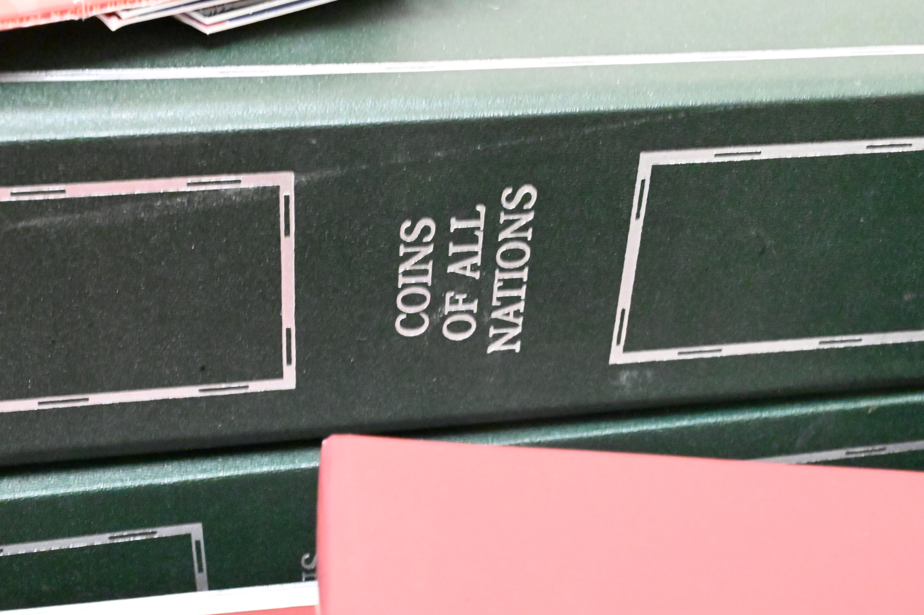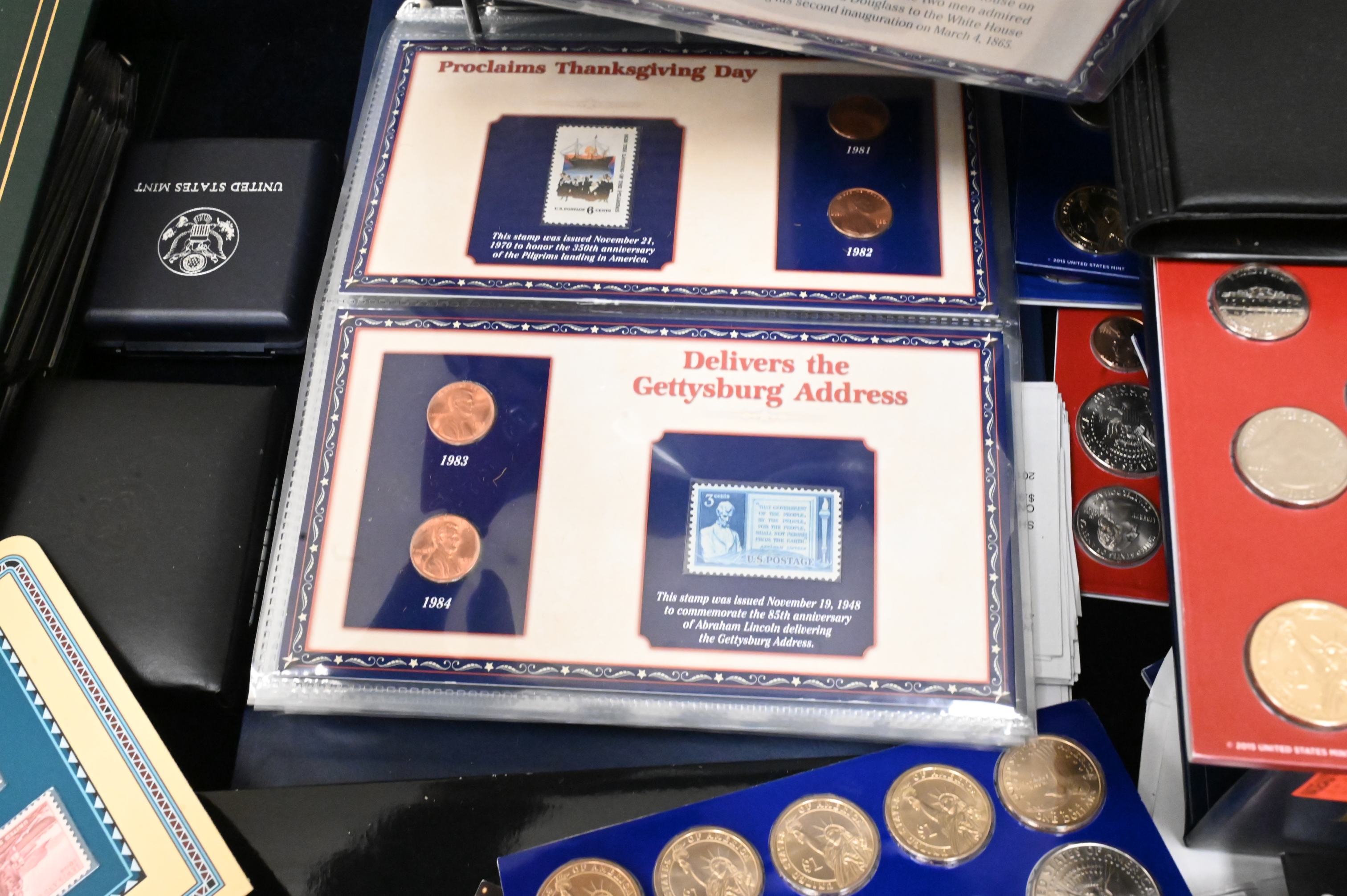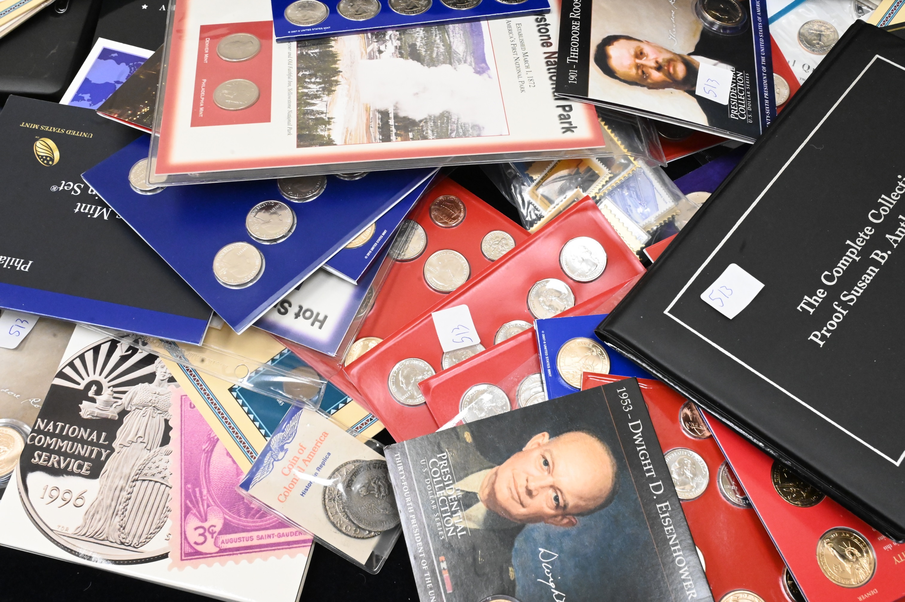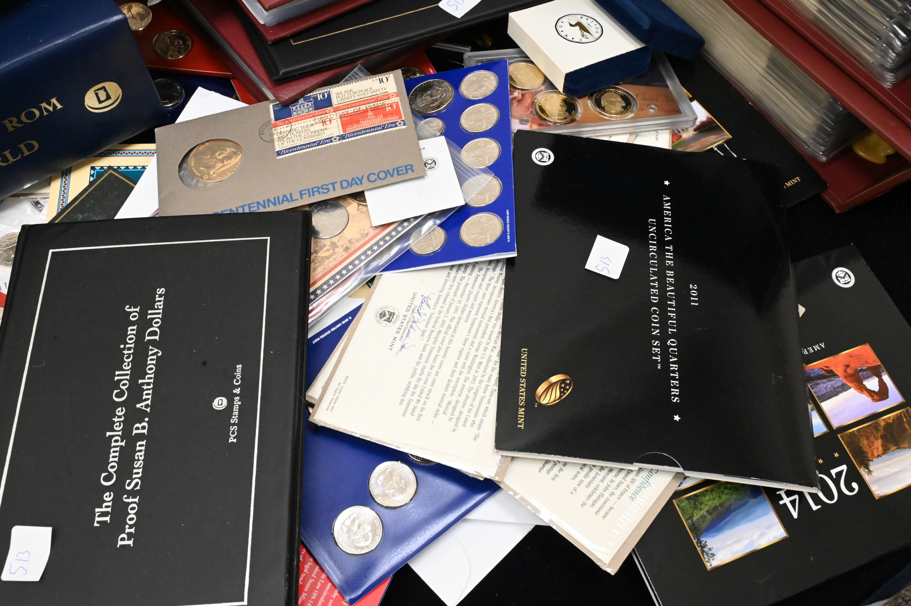 Large Coin Lot, to include uncirculated coin sets, proof Lincoln coins, two binders of modern commemoratives, approximately 6 binders on world coins, sets of $2 bills, etc.