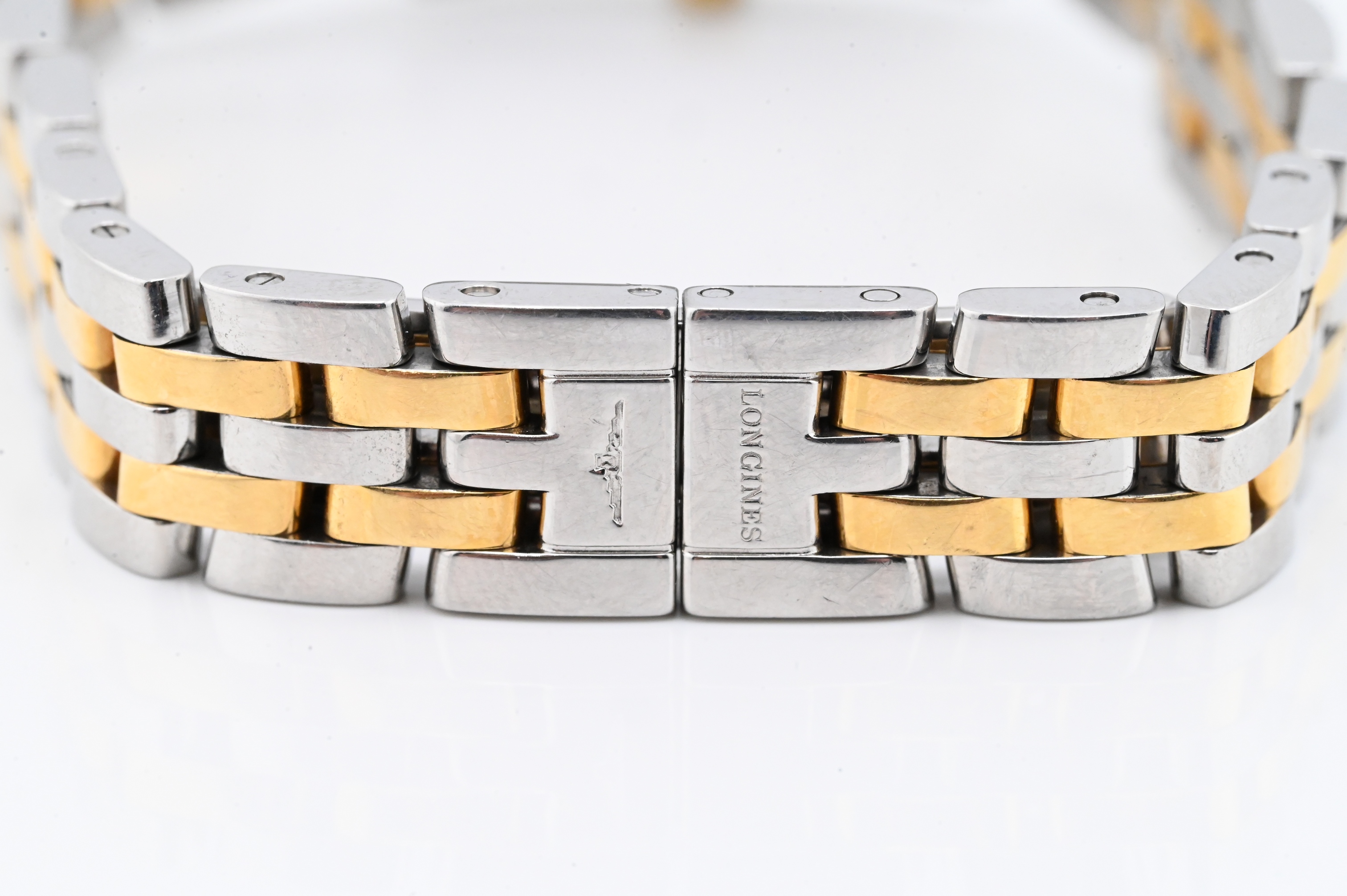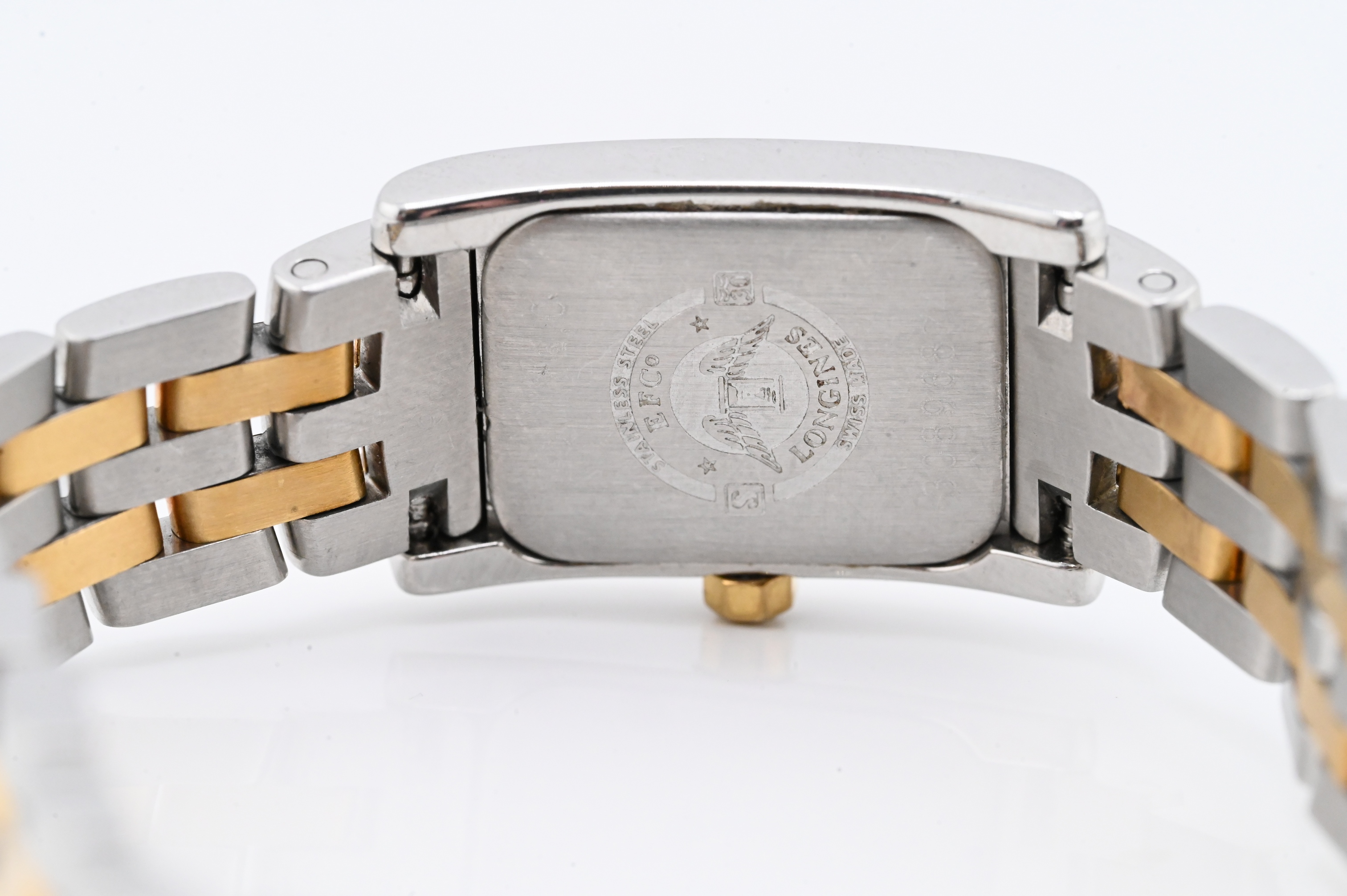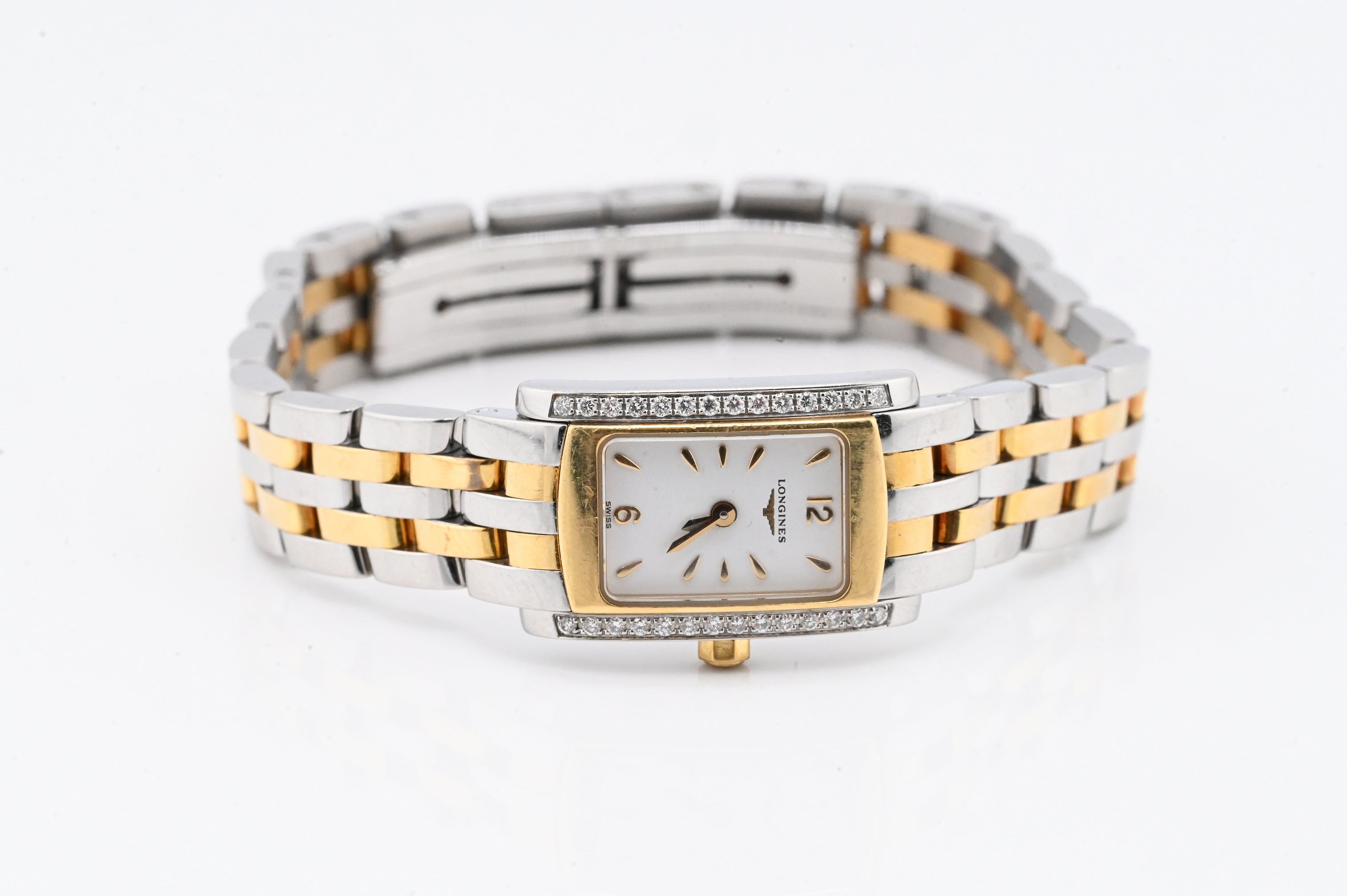 Lot 513: Longines Ladies’ Stainless Steel and Gold DolceVita Diamond-Set Wristwatch