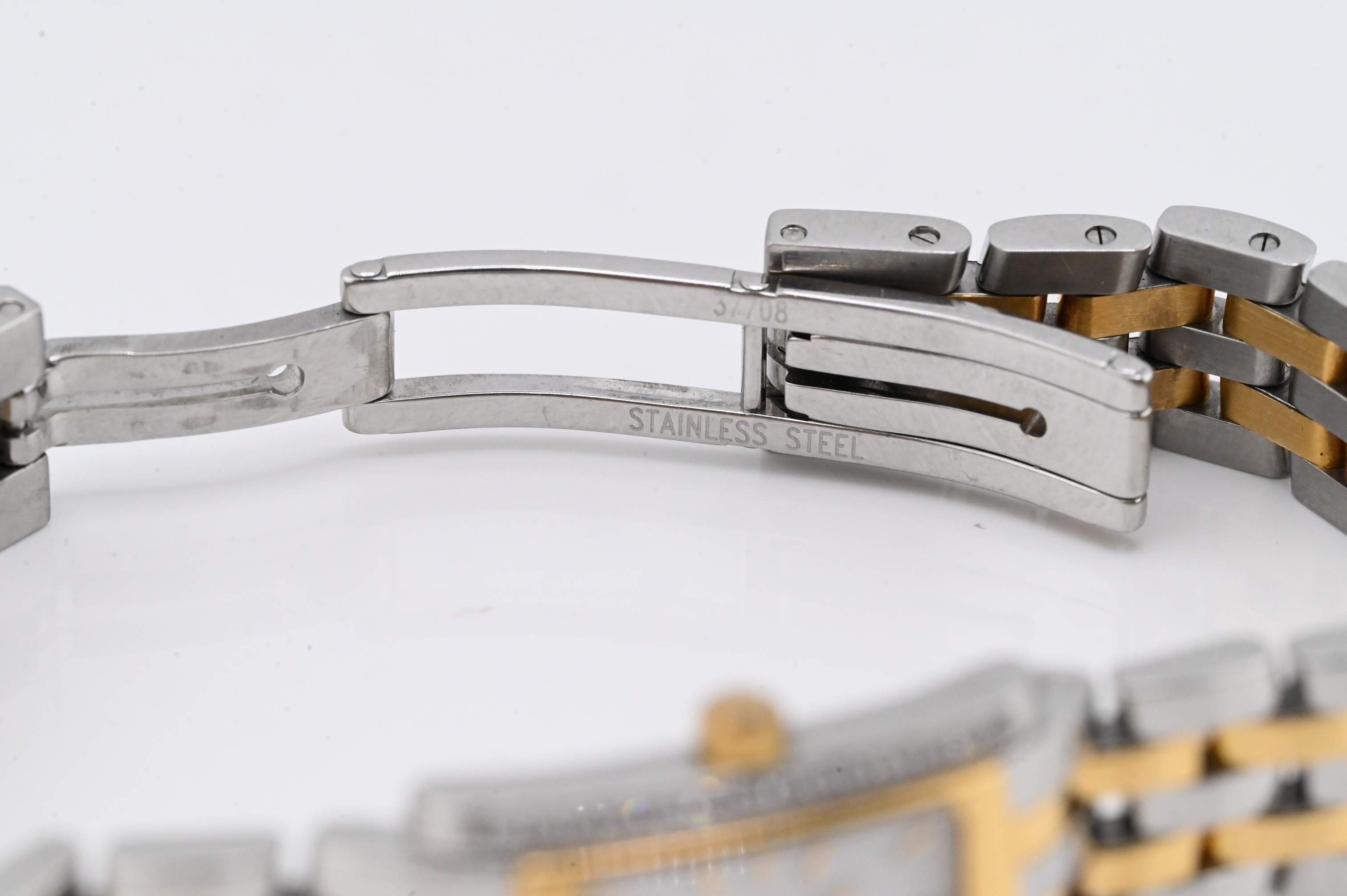 white dial with baton markers and Arabic 12 and 6, stainless steel and gold case with diamond-set bezel; gold & stainless bracelet, quartz