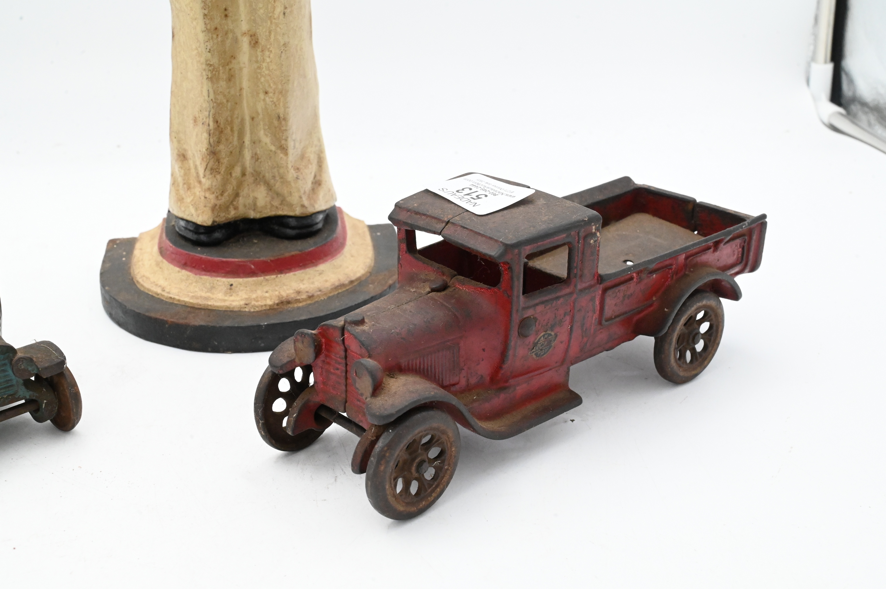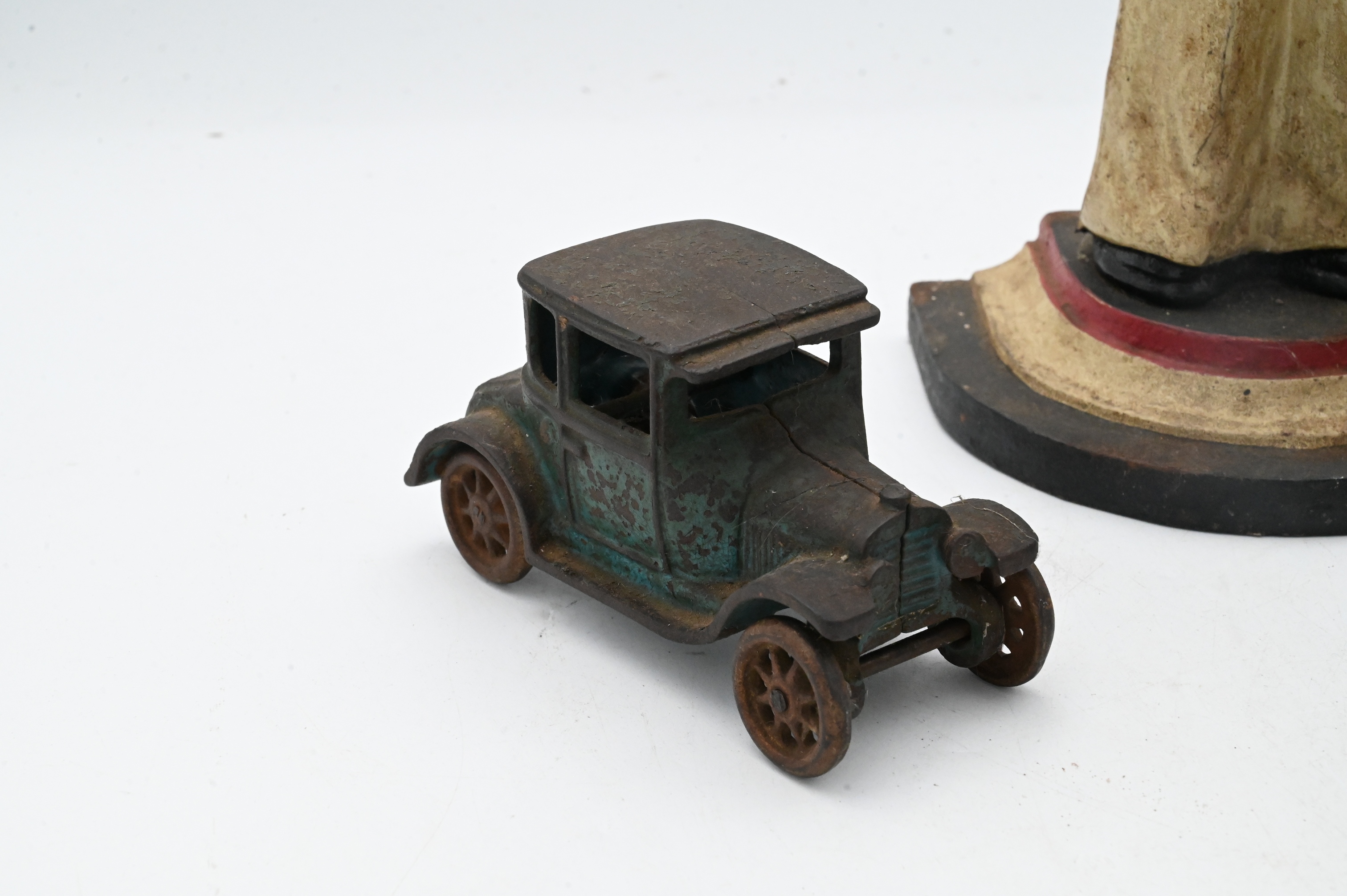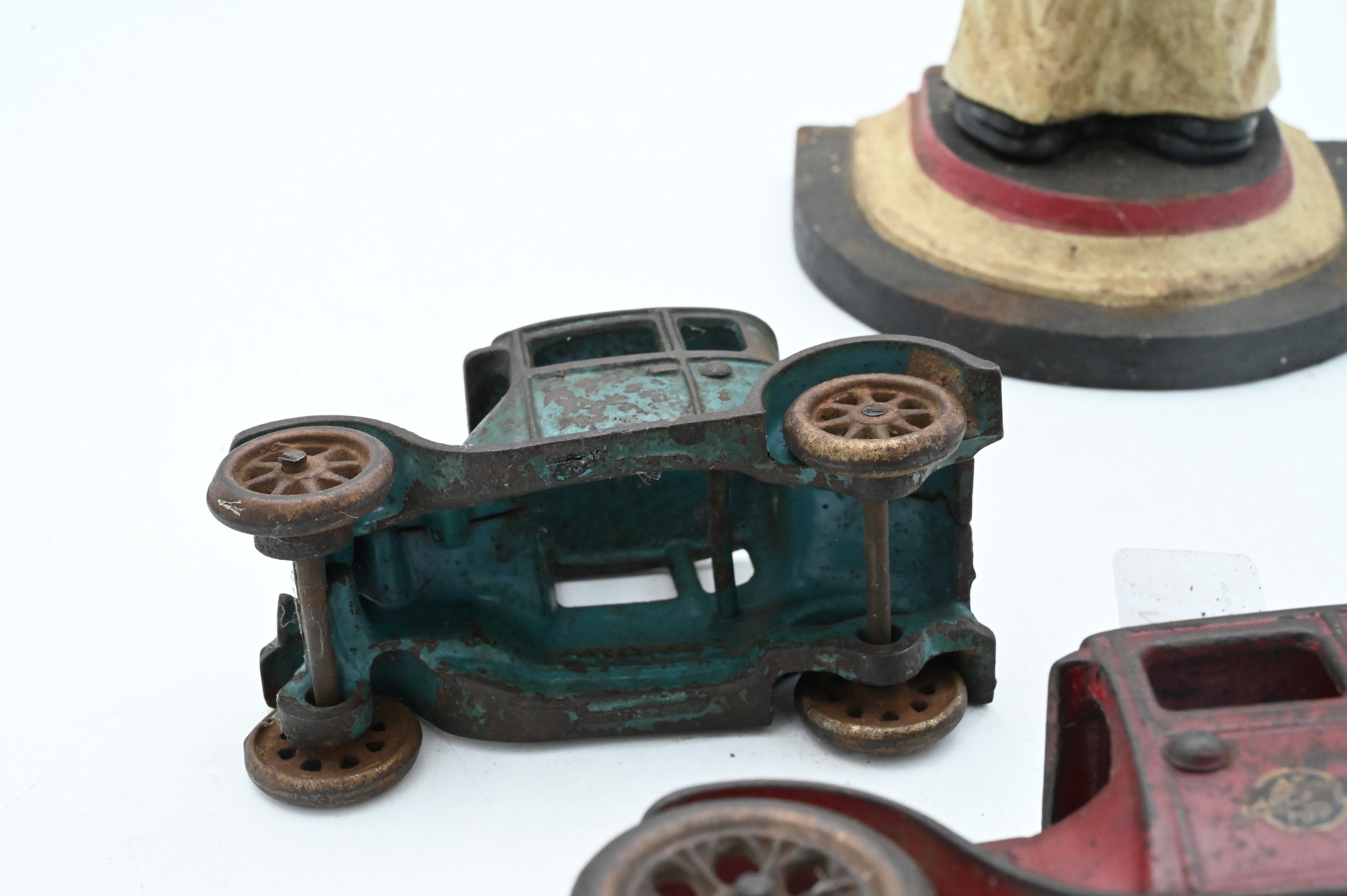 Sailor doorstop wearing uniform in red, white and blue, height 13 inches along with two cast iron and painted arcade toy cars, circa 1930