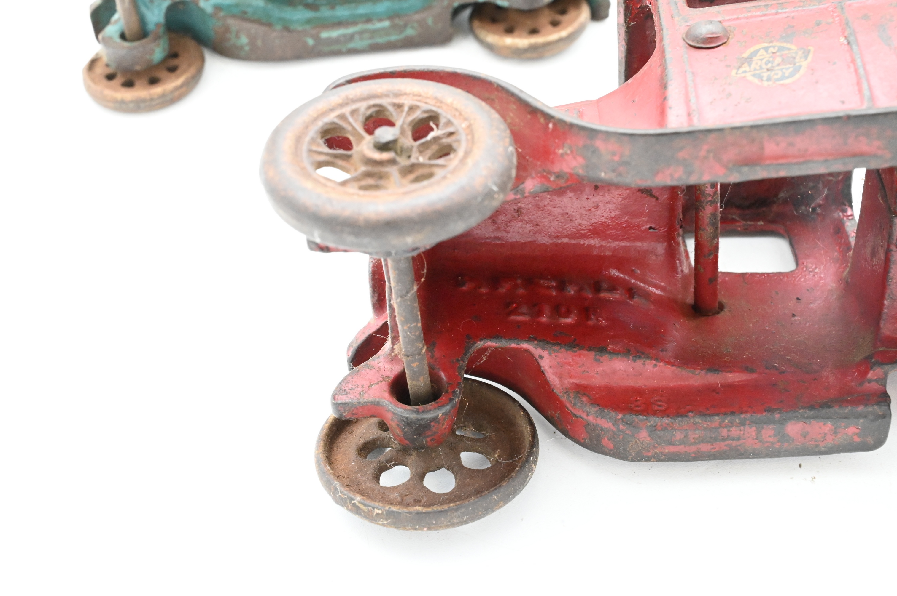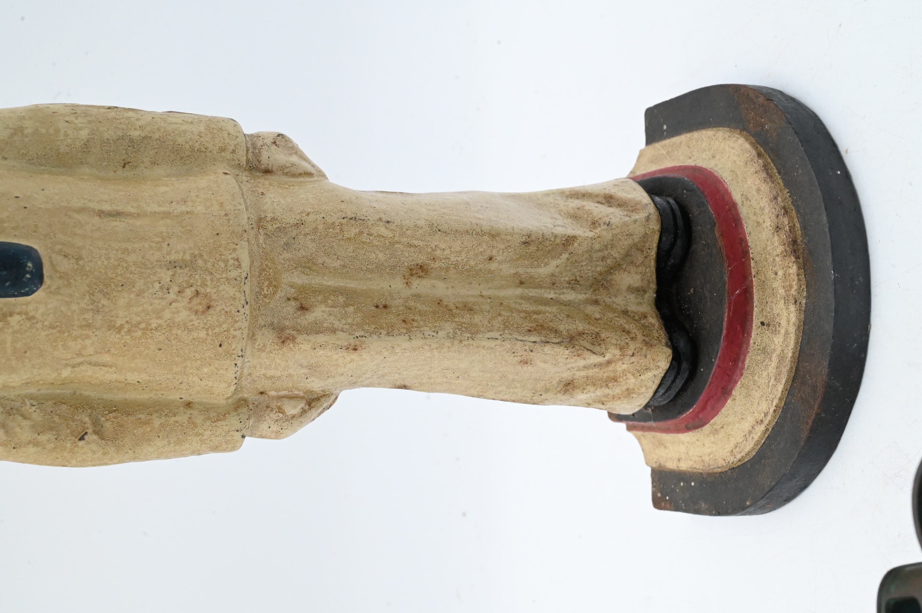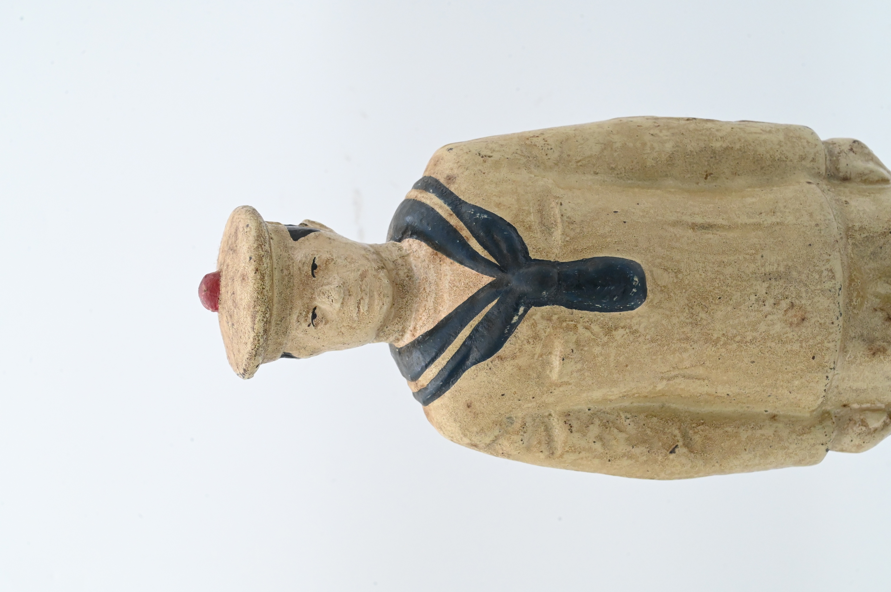 Sailor doorstop wearing uniform in red, white and blue, height 13 inches along with two cast iron and painted arcade toy cars, circa 1930