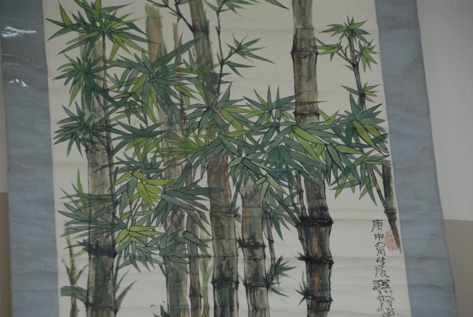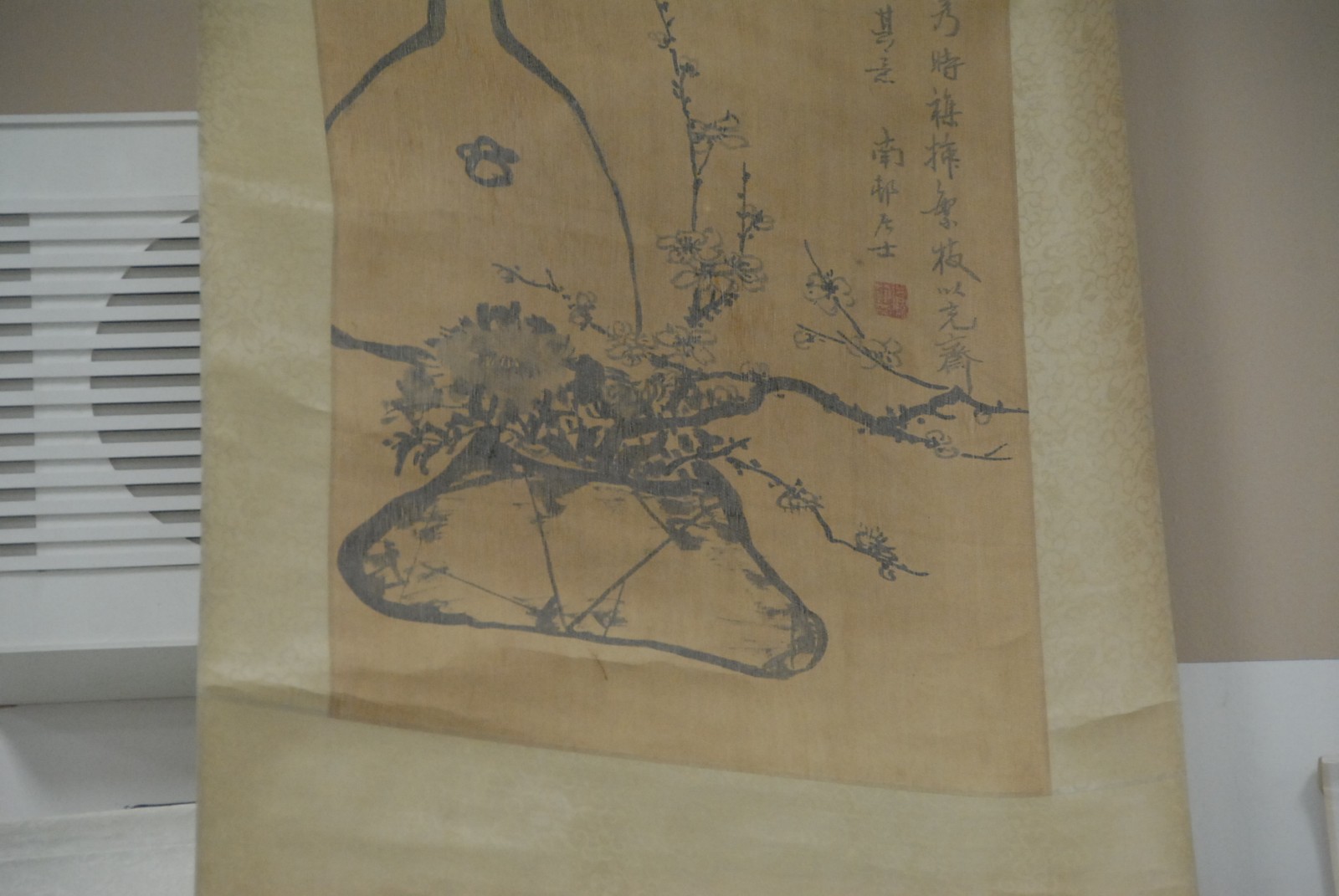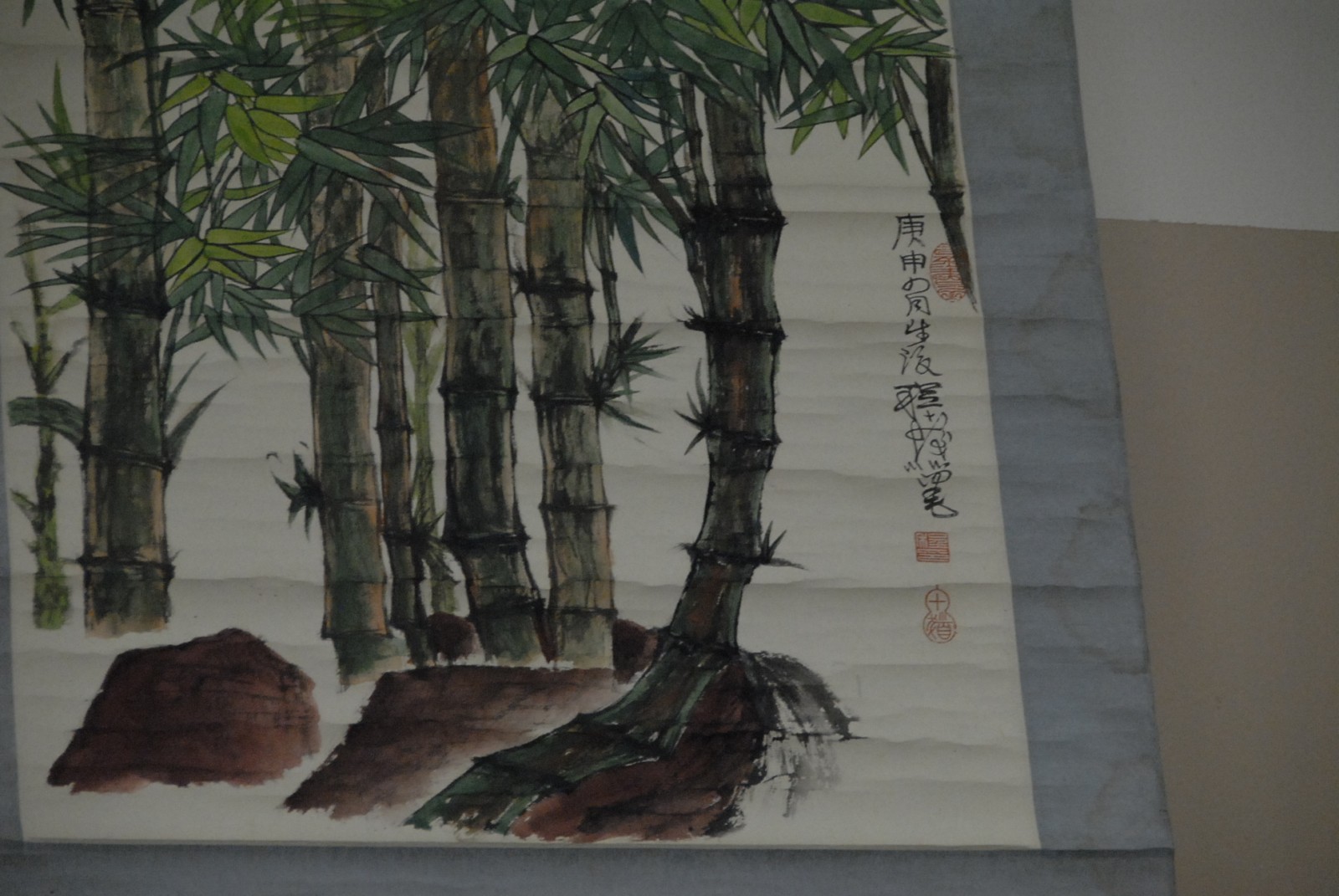 Two scrolls, one with vases of flowers, and one of bamboo trees.